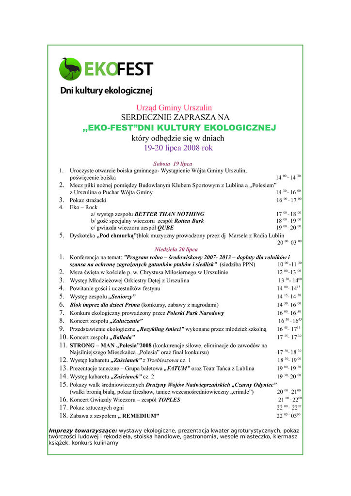 Urząd Gminy Urszulin SERDECZNIE ZAPRASZA NA ,,EKO-FEST”DNI KULTURY EKOLOGICZNEJ który odbędzie się w dniach 19-20 lipca 2008 rok Sobota 19 lipca Uroczyste otwarcie boiska gminnego- Wystąpienie Wójta Gminy Urszulin, poświęcenie boiska 14 00 _ 14 30 2. Mecz piłki nożnej pomiędzy Budowlanym Klubem Sportowym z Lublina a ,,Polesiem” z Urszulina o Puchar Wójta Gminy 14 30 _ 16 00 3. Pokaz strażacki 16 00 _ 17 00 4. Eko – Rock a/ występ zespołu BETTER THAN NOTHING 17 00 _ 18 00 b/ gość specjalny wieczoru zespół Rotten Bark 18 00 _ 19 00 c/ gwiazda wieczoru zespół QUBE 19 00 _ 20 00 5. Dyskoteka „Pod chmurką”(blok muzyczny prowadzony przez dj Marsela z Radia Lublin 20 00 _03 00 Niedziela 20 lipca 1. Konferencja na temat: ”Program rolno – środowiskowy 2007- 2013 – dopłaty dla rolników i szansa na ochronę zagrożonych gatunków ptaków i siedlisk” (siedziba PPN) 10 00 -11 30 2. Msza święta w kościele p. w. Chrystusa Miłosiernego w Urszulinie 12 00 _13 00 3. Występ Młodzieżowej Orkiestry Dętej z Urszulina 13 30- 1400 4. Powitanie gości i uczestników festynu 14 00- 1415 5. Występ zespołu „Seniorzy” 14 15_ 14 30 6. Blok imprez dla dzieci Prima (konkursy, zabawy z nagrodami) 14 30_ 16 00 7. Konkurs ekologiczny prowadzony przez Poleski Park Narodowy 16 00_ 16 30 8. Koncert zespołu „Załuczanie” 16 30 _ 1645 9. Przedstawienie ekologiczne „Recykling śmieci” wykonane przez młodzież szkolną 16 45_ 1715 10. Koncert zespołu „Ballada” 17 15_ 17 30 11. STRONG – MAN „Polesia”2008 (konkurencje siłowe, eliminacje do zawodów na Najsilniejszego Mieszkańca „Polesia” oraz finał konkursu) 17 30_ 18 30 12. Występ kabaretu „Zaścianek” z Trzebieszowa cz. 1 18 30_ 19 00 13. Prezentacje taneczne – Grupa baletowa „FATUM” oraz Teatr Tańca z Lublina 19 00_ 19 30 14. Występ kabaretu „Zaścianek” cz. 2 19 30_ 20 00 15. Pokazy walk średniowiecznych Drużyny Wojów Nadwieprzańskich „Czarny Odyniec” (walki bronią białą, pokaz fireshow, taniec wczesnośredniowieczny „crinale”) 20 00 _ 2100 16. Koncert Gwiazdy Wieczoru – zespół TOPLES 21 00 _ 2200 17. Pokaz sztucznych ogni 22 00 _ 2205 18. Zabawa z zespołem „ REMEDIUM” 22 05 – 0300 1. Imprezy towarzyszące: wystawy ekologiczne, prezentacja kwater agroturystycznych, pokaz twórczości ludowej i rękodzieła, stoiska handlowe, gastronomia, wesołe miasteczko, kiermasz książek, konkurs kulinarny