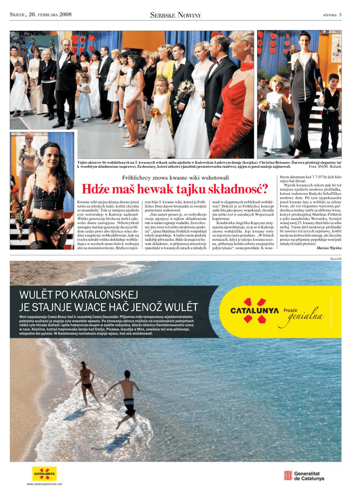 SERBSKE NOWINY SRJEDU, 20. FEBRUARA 2008 strona 5 Tójšto akterow bě wobdźělenych na 5. kwasnych wikach zašłu njedźelu w Kulowskim Ludowym domje (horjeka). Christina Brězanec-Žurowa předstaji elegantny šat k wosebitym składnosćam (naprawo). Za dessousy, kotrež někotre rjanolinki prezentowachu (nalěwo), njejsu so jenož mužojo zajimowali. Fota: SN/M. Bulank Fröhlichecy znowa kwasne wiki wuhotowali Hdźe maš hewak tajku składnosć? Kwasne wiki njejsu dźensa dawno jenož něšto za młodych ludźi, kotřiž chcedźa so zmandźelić. Tole sy minjenu njedźelu cyle wočiwidnje w Kulowje nazhonił. Wšitke generacije běchu na žurli Ludoweho domu zastupjene. Někotryžkuli zastupjer staršeje generacije da sej za blidom sedźo piwo abo škleńcu wina słodźeć a najskerje wobkedźbowaše, kak sej trochu młódši wšitko dokładnje wobhladuja a w myslach snano hižo k wołtarjej abo na stawnistwo kroča. Běchu to mjez- tym hižo 5. kwasne wiki, kotrež je Fröhlichec Dom darow hromadźe ze swojimi partnerami wuhotował. „Naš zaměr prosće je, zo wobydlerjo swoje pjenjezy k tajkim składnosćam tule w našim regionje wudadźa. Za to chcemy jim wězo tež něšto atraktiwne poskićić“, zjima Matthias Fröhlich wotpohlad tohole popołdnja. A ludźo tutón poskitk radlubje přiwzachu. Hdźe da maja tež hewak składnosć, w přijomnej atmosferje rjanolinki w kwasnych šatach a młodych muži w elegantnych woblekach wobdźiwać? Dokelž je so Fröhlichec koncept zašłe lěta jako prawy wopokazał, chcedźa jón nětko tež w susodnych Wojerecach kopěrować. Konditorka Angelika Kupcyna znajmjeńša njewobžaruje, zo je so w Kulowje znowa wobdźěliła. Jeje kwasne torty su mjeztym často požadane. „W lětnich měsacach, hdyž je takrjec kwasna sezona, přihotuju kóždu sobotu znajmjeńša jedyn tykanc“, wona powědaše. K wose- bitym datumam kaž 7.7.07 bě jich hižo wjace hač dźesać. Wjeršk kwasnych wikow pak bě tež minjenu njedźelu modowa přehladka, kotruž wuhotowa Budyski Schafflikec modowy dom. Při tym njepokazachu jenož kwasne šaty a wobleki za zeleny kwas, ale tež elegantnu wječornu garderobu a móžny outfit za slěborny kwas, kotryž předstajištaj Matthias Fröhlich a jeho mandźelska Weronika, byrnjež wonaj swój 25. kwasny dźeń hižo za sobu měłoj. Tutón dźěl modoweje přehladki bě zawěsće tež za tych zajimawy, kotřiž mysle na žeńtwu hižo nimaja, ale chcychu prosće raz přijomne popołdnjo wosrjedź młodych ludźi přežiwić. Marian Wjeńka Nawěšk WULĚT PO KATALONSKEJ JE STAJNJE WJACE HAČ JENOŽ WULĚT Wot rozpukaneje Costa Bravy hač k rozsahłej Costa Dauradźe: Přijomne miłe temperatury srjedźomórskeho pobrjoha wužiwać je stajnje cyle wosebite wjeselo. Po chowanju słónca móžeće na katalanskich pobrjohach něšto cyle hinaše dožiwić: spěw habaneras-skupin w swětle měsačka, dźeržo škleńcu flamběrowaneho ruma w ruce. Kónčina, kotraž inspirowaše ženije kaž Dalíja, Picassa, Gaudíja a Mira, zawěsće tež was překwapi, wšojedne što pytaće. W Katalonskej namakaće stajnje wjace, hač sće wočakowali.
