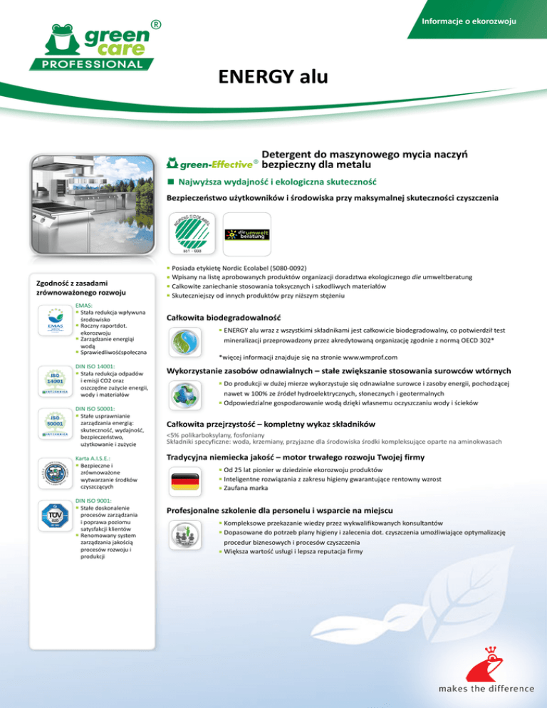 Informacje o ekorozwoju ENERGY alu Detergent do maszynowego mycia naczyń bezpieczny dla metalu ■ Najwyższa wydajność i ekologiczna skuteczność Bezpieczeństwo użytkowników i środowiska przy maksymalnej skuteczności czyszczenia Posiada etykietę Nordic Ecolabel (5080-0092) Wpisany na listę aprobowanych produktów organizacji doradztwa ekologicznego die umweltberatung ■ Calkowite zaniechanie stosowania toksycznych i szkodliwych materiałów ■ Skuteczniejszy od innych produktów przy niższym stężeniu ■ Zgodność z zasadami zrównoważonego rozwoju EMAS: ■ Stała redukcja wpływuna środowisko ■ Roczny raportdot. ekorozwoju ■ Zarządzanie energiąi wodą ■ Sprawiedliwośćspołeczna DIN ISO 14001: ■ Stała redukcja odpadów i emisji CO2 oraz oszczędne zużycie energii, wody i materiałów DIN ISO 50001: ■ Stałe usprawnianie zarządzania energią: skuteczność, wydajność, bezpieczeństwo, użytkowanie i zużycie Karta A.I.S.E.: ■ Bezpieczne i zrównoważone wytwarzanie środków czyszczących DIN ISO 9001: ■ Stałe doskonalenie procesów zarządzania i poprawa poziomu satysfakcji klientów ■ Renomowany system zarządzania jakością procesów rozwoju i produkcji ■ Całkowita biodegradowalność ■ ENERGY alu wraz z wszystkimi składnikami jest całkowicie biodegradowalny, co potwierdził test mineralizacji przeprowadzony przez akredytowaną organizację zgodnie z normą OECD 302* *więcej informacji znajduje się na stronie www.wmprof.com Wykorzystanie zasobów odnawialnych – stałe zwiększanie stosowania surowców wtórnych Do produkcji w dużej mierze wykorzystuje się odnawialne surowce i zasoby energii, pochodzącej nawet w 100% ze źródeł hydroelektrycznych, słonecznych i geotermalnych ■ Odpowiedzialne gospodarowanie wodą dzięki własnemu oczyszczaniu wody i ścieków ■ Całkowita przejrzystość – kompletny wykaz składników <5% polikarboksylany, fosfoniany Składniki specyficzne: woda, krzemiany, przyjazne dla środowiska środki kompleksujące oparte na aminokwasach Tradycyjna niemiecka jakość – motor trwałego rozwoju Twojej firmy Od 25 lat pionier w dziedzinie ekorozwoju produktów Inteligentne rozwiązania z zakresu higieny gwarantujące rentowny wzrost ■ Zaufana marka ■ ■ Profesjonalne szkolenie dla personelu i wsparcie na miejscu Kompleksowe przekazanie wiedzy przez wykwalifikowanych konsultantów Dopasowane do potrzeb plany higieny i zalecenia dot. czyszczenia umożliwiające optymalizację procedur biznesowych i procesów czyszczenia ■ Większa wartość usługi i lepsza reputacja firmy ■ ■ Informacja techniczna ENERGY alu Detergent do maszynowego mycia naczyń bezpieczny dla metalu ■ Przyjazny dla materiałów ■ Miękka / średnio twarda woda ■ Skoncentrowany Profil produktu ENERGY alu to skoncentrowany, płynny detergent do mycia naczyń w zmywarkach profesjonalnych, a także do namaczania. Charakteryzuje go doskonała skuteczność czyszczenia, w szczególności w wodzie miękkiej do średnio twardej. ■ Zwiększając bezpieczeństwo pracy, zapewnia intensywne i silne usuwanie pozostałości tłuszczu, skrobi i białka, a także osadów. ■ Jest bardzo skoncentrowany, co umożliwia używanie niskich dawek. ■ ENERGY alu, składający się w większości z odnawialnych surowców, powstał z poczucia odpowiedzialności za przyszłe pokolenia. ■ Nie zawiera NTA, EDTA, fosforanów ani chloru. ■ Stosowanie i dozowanie 10–15 g/L Dozowanie zgodnie z zastosowaniem i stopniem zabrudzenia. Stosować się do poniższych instrukcji. Namaczanie wstępne: włożyć naczynia na 10–20 min do letniej wody. Nadaje się do wszystkich typów zmywarek. Miejsce aplikacji ENERGY alu nadaje się do wszystkich rodzajów zmywarek, np. zmywarek tunelowych i kapturowych. Nadaje się do delikatnych materiałów, takich jak aluminium, srebro, materiały nieżelazne, a także stal nierdzewna, tworzywa sztuczne i porcelana. ■ Stosować w połączeniu z BRILLANT perfect. ■ ■ Bezpieczeństwo produktu, przechowywanie i zalecenia dot. ochrony środowiska Bezpieczeństwo: Produkt wyłącznie do zastosowania profesjonalnego. Szczegółowe informacje patrz karta techniczna. Przechowywanie: Przechowywać w temperaturze pokojowej w oryginalnym opakowaniu. Ochrona środowiska: Detergent, któremu przyznano wspólnotowe oznakowanie ekologiczne, działa skutecznie przy niskich temperaturach zmywania. Na programatorze zmywarki wybieraj cykle zmywania w niskich temperaturach, zmywaj przy pełnym jej załadowaniu i nie przekraczaj zalecanego dozowania detergentu. W ten sposób przyczynisz się do ograniczenia zużycia zarówno energii, jak i wody oraz do zmniejszenia zanieczyszczenia wód. Do specjalnych pojemników na odpady wrzucaj wyłącznie puste opakowania. Zalecane jest korzystanie z automatycznych systemów dozujących. 2–3 g/L 2,5–4 g/L Dostępne opakowania miękka woda woda średnio twarda Kod produktu 701589 3,5–5 g/L Wartość pH 1 x 10 L 13 woda twarda tana-Chemie GmbH | Rheinallee 96 | D 55120 Mainz | Germany | www.wmprof.com | + 49 (0)6131 964 03 Werner & Mertz Professional Vertriebs GmbH | Neualmerstrasse 13 | 5400 Hallein | Austria | www.wmprof.com | +43 6245 872 86 Werner & Mertz Polska sp. z o.o. | ul. Krakowiaków 50 | 02-255 Warszawa | Polska | www.werner-mertz.pl | + 48 22 771 46 71 Zaufany partner