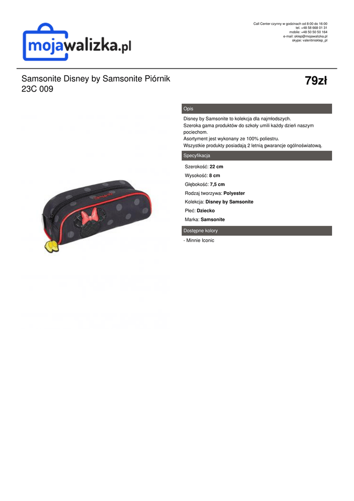 Call Center czynny w godzinach od 8:00 do 16:00 tel. +48 58 668 01 31 mobile: +48 50 50 50 164 e-mail: [email protected] skype: valentinisklep_pl 79zł Samsonite Disney by Samsonite Piórnik 23C 009 Opis Disney by Samsonite to kolekcja dla najmłodszych. Szeroka gama produktów do szkoły umili każdy dzień naszym pociechom. Asortyment jest wykonany ze 100% poliestru. Wszystkie produkty posiadają 2 letnią gwarancje ogólnoświatową. Specyfikacja Szerokość: 22 cm Wysokość: 8 cm Głębokość: 7,5 cm Rodzaj tworzywa: Polyester Kolekcja: Disney by Samsonite Płeć: Dziecko Marka: Samsonite Dostępne kolory - Minnie Iconic Powered by TCPDF (www.tcpdf.org)