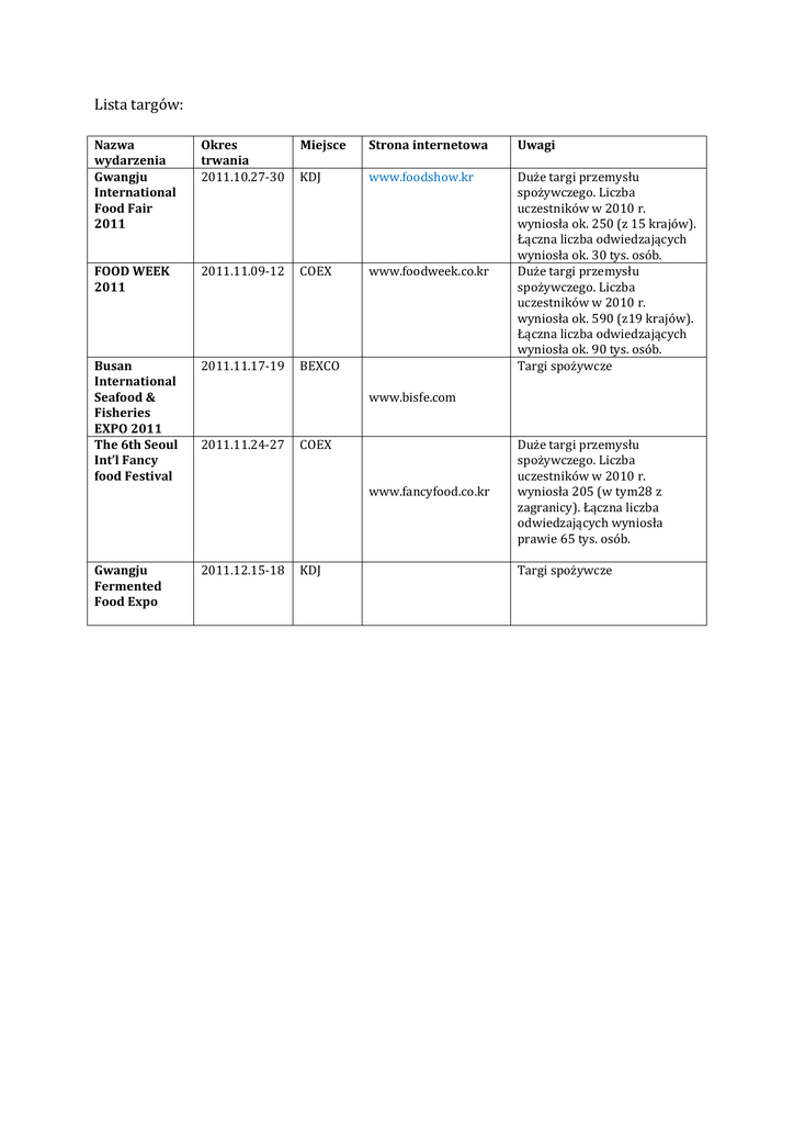 Lista targów: Nazwa wydarzenia Gwangju International Food Fair 2011 Okres trwania 2011.10.27-30 Miejsce Strona internetowa Uwagi KDJ www.foodshow.kr FOOD WEEK 2011 2011.11.09-12 COEX www.foodweek.co.kr Busan International Seafood & Fisheries EXPO 2011 The 6th Seoul Int’l Fancy food Festival 2011.11.17-19 BEXCO Duże targi przemysłu spożywczego. Liczba uczestników w 2010 r. wyniosła ok. 250 (z 15 krajów). Łączna liczba odwiedzających wyniosła ok. 30 tys. osób. Duże targi przemysłu spożywczego. Liczba uczestników w 2010 r. wyniosła ok. 590 (z19 krajów). Łączna liczba odwiedzających wyniosła ok. 90 tys. osób. Targi spożywcze www.bisfe.com 2011.11.24-27 COEX www.fancyfood.co.kr Gwangju Fermented Food Expo 2011.12.15-18 KDJ Duże targi przemysłu spożywczego. Liczba uczestników w 2010 r. wyniosła 205 (w tym28 z zagranicy). Łączna liczba odwiedzających wyniosła prawie 65 tys. osób. Targi spożywcze