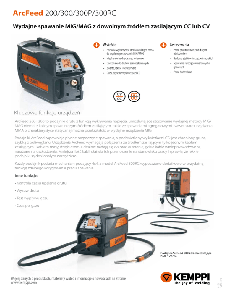 ArcFeed 200/300/300P/300RC Wydajne spawanie MIG/MAG z dowolnym źródłem zasilającym CC lub CV W skrócie Zastosowania • P ozwala wykorzystać źródła zasilające MMA do wydajnego spawania MIG/MAG • Idealne do trudnych prac w terenie • Doskonałe do drutów samoosłonowych • Zwarte, lekkie i wytrzymałe • Duży, czytelny wyświetlacz LCD • Prace przemysłowe pod dużym obciążeniem • Budowa statków i urządzeń morskich • Spawanie rurociągów naftowych i gazowych • Prace budowlane CV CC Kluczowe funkcje urządzeń ArcFeed 200 i 300 to podajniki drutu z funkcją wykrywania napięcia, umożliwiające stosowanie wydajnej metody MIG/ MAG niemal z każdym spawalniczym źródłem zasilającym, także ze spawarkami agregatowymi. Nawet stare urządzenia MMA o charakterystyce statycznej można przekształcić w wydajne urządzenia MIG. Podajniki ArcFeed zapewniają płynne rozpoczęcie spawania, a podświetlony wyświetlacz LCD jest chroniony grubą szybką z poliwęglanu. Urządzenia ArcFeed wymagają połączenia ze źródłem zasilającym tylko jednym kablem zasilającym i kablem masy, dzięki czemu idealnie nadają się do prac w terenie, gdzie kable wieloprzewodowe są narażone na uszkodzenia. Mniejsza ilość kabli ułatwia ich przenoszenie na stanowisku pracy i sprawia, że lekkie podajniki są doskonałym narzędziem. Każdy podajnik posiada mechanizm podający 4x4, a model ArcFeed 300RC wyposażono dodatkowo w przydatną funkcję zdalnego korygowania prądu spawania. Inne funkcje: • Kontrola czasu upalania drutu • Wysuw drutu • Test wypływu gazu • Czas po-gazu Podajnik ArcFeed 200 i źródło zasilające KMS 400 AS. AD712PL 1310 Więcej danych o produktach, materiały wideo i informacje o nowościach na stronie www.kemppi.com ArcFeed 200/300/300P/300RC Dane techniczne ArcFeed 200 300, 300RC 300P Moc znamionowa 150 W 150 W 150 W 300 A 300 A 300 A Prąd maks. 40°C 100% Mechanizm podajnika drutu Druty elektrodowe, ø (mm) Wymiary zewnętrzne 4-rolkowy 4-rolkowy 4-rolkowy Druty rdzeniowe 1,2…2,0 1,2…2,0 1,2…2,4 Samoosłonowe druty rdzeniowe 1,6…2,0 1,6…2,0 1,6…2,4 Druty lite 1,0…1,6 1,0…1,6 1,0…1,6 dł. x sz. x wys. 510 x 200 x 310 mm 590 x 240 x 445 mm 590 x 240 x 445 mm 11 kg 15 kg 15 kg Masa Numery do zamówienia Podajniki drutu Kemppi ArcFeed 200 6120200 Kemppi ArcFeed 300 6120300 Kemppi ArcFeed 300P 6120310 Kemppi ArcFeed 300RC 6120301 Akcesoria Regulator przepływu gazu W000364 Rama do zawieszania modelu ArcFeed 200 6185285 Uchwyt do zawieszania KFH 1000 – modele ArcFeed 300, 300P i 300RC 6185100 Szyny bezpieczeństwa do modelu ArcFeed 200 6185286 Szyny bezpieczeństwa do modeli ArcFeed 300, 300P i 300RC 6185287 Kable Przedłużacz 70 mm², 25 m 6183725 Przedłużacz 70 mm², 10 m 6183710 Kabel masy 16 mm², 5 m SKM25 6184015 AD712PL 1310 Więcej danych o produktach, materiały wideo i informacje o nowościach na stronie www.kemppi.com