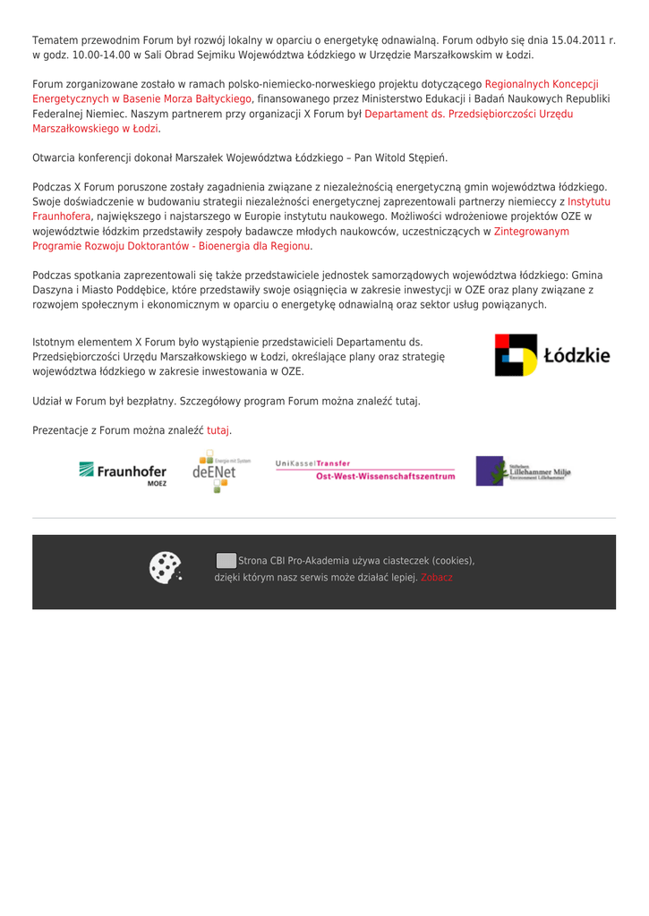 Tematem przewodnim Forum był rozwój lokalny w oparciu o energetykę odnawialną. Forum odbyło się dnia 15.04.2011 r. w godz. 10.00-14.00 w Sali Obrad Sejmiku Województwa Łódzkiego w Urzędzie Marszałkowskim w Łodzi. Forum zorganizowane zostało w ramach polsko-niemiecko-norweskiego projektu dotyczącego Regionalnych Koncepcji Energetycznych w Basenie Morza Bałtyckiego, finansowanego przez Ministerstwo Edukacji i Badań Naukowych Republiki Federalnej Niemiec. Naszym partnerem przy organizacji X Forum był Departament ds. Przedsiębiorczości Urzędu Marszałkowskiego w Łodzi. Otwarcia konferencji dokonał Marszałek Województwa Łódzkiego – Pan Witold Stępień. Podczas X Forum poruszone zostały zagadnienia związane z niezależnością energetyczną gmin województwa łódzkiego. Swoje doświadczenie w budowaniu strategii niezależności energetycznej zaprezentowali partnerzy niemieccy z Instytutu Fraunhofera, największego i najstarszego w Europie instytutu naukowego. Możliwości wdrożeniowe projektów OZE w województwie łódzkim przedstawiły zespoły badawcze młodych naukowców, uczestniczących w Zintegrowanym Programie Rozwoju Doktorantów - Bioenergia dla Regionu. Podczas spotkania zaprezentowali się także przedstawiciele jednostek samorządowych województwa łódzkiego: Gmina Daszyna i Miasto Poddębice, które przedstawiły swoje osiągnięcia w zakresie inwestycji w OZE oraz plany związane z rozwojem społecznym i ekonomicznym w oparciu o energetykę odnawialną oraz sektor usług powiązanych. Istotnym elementem X Forum było wystąpienie przedstawicieli Departamentu ds. Przedsiębiorczości Urzędu Marszałkowskiego w Łodzi, określające plany oraz strategię województwa łódzkiego w zakresie inwestowania w OZE. Udział w Forum był bezpłatny. Szczegółowy program Forum można znaleźć tutaj. Prezentacje z Forum można znaleźć tutaj. Strona CBI Pro-Akademia używa ciasteczek (cookies), dzięki którym nasz serwis może działać lepiej. Zobacz