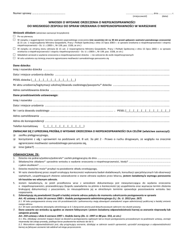 Numer sprawy ……………………………………….. ……………………………………….., dnia ………………….. r. (miejscowość) (data) WNIOSEK O WYDANIE ORZECZENIA O NIEPEŁNOSPRAWNOŚCI DO MIEJSKIEGO ZESPOŁU DO SPRAW ORZEKANIA O NIEPEŁNOSPRAWNOŚCI W WARSZAWIE Wniosek składam (właściwe zaznaczyć krzyżykiem): □ □ Po raz pierwszy □ W związku ze zmianą stanu zdrowia (§ 15 ust. 2 rozporządzenia Ministra Gospodarki, Pracy i Polityki Społecznej z dnia 15 lipca 2003 r. w sprawie orzekania o niepełnosprawności i stopniu niepełnosprawności - Dz. U. z 2003 r., Nr 139, poz. 1328, ze zm.) □ □ Składałem wniosek o wydanie orzeczenia o niepełnosprawności dziecka – nie zaliczenie do osób niepełnosprawnych W związku z wygaśnięciem terminu ważności poprzedniego orzeczenia (nie wcześniej niż na 30 dni przed upływem ważności posiadanego orzeczenia) (§ 15 ust. 1 rozporządzenia Ministra Gospodarki, Pracy i Polityki Społecznej z dnia 15 lipca 2003 r. w sprawie orzekania o niepełnosprawności i stopniu niepełnosprawności - Dz. U. z 2003 r., Nr 139, poz. 1328, ze zm.) W celu ustalenia czy istnieją znacznie ograniczone możliwości samodzielnego poruszania się Dane dziecka: Imię i nazwisko dziecka ................................................................................................................................................................... Data i miejsce urodzenia dziecka .................................................................................................................................................... PESEL dziecka [__[__[__[__[__[__[__[__[__[__[__] Nr aktu urodzenia/legitymacji szkolnej/dowodu osobistego/paszportu* dziecka ......................................................................... Adres zameldowania dziecka .......................................................................................................................................................... Dane przedstawiciela ustawowego: Imię i nazwisko ................................................................................................................................................................................ Data i miejsce urodzenia ................................................................................................................................................................. Nr i seria dowodu osobistego ................................................................................. .. PESEL [__[__[__[__[__[__[__[__[__[__[__] Adres zameldowania ....................................................................................................................................................................... Adres do korespondencji ................................................................................................................................................................. Telefon kontaktowy [__[__[__[__[__[__[__[__[__[__] ZWRACAM SIĘ Z UPRZEJMĄ PROŚBĄ O WYDANIE ORZECZENIA O NIEPEŁNOSPRAWNOŚCI DLA CELÓW (właściwe zaznaczyć): zasiłku pielęgnacyjnego, korzystanie z ulg i uprawnień na podstawie art. 8 ust. 3a pkt 2 - Prawo o ruchu drogowym, ze względu na znacznie ograniczone możliwości samodzielnego poruszania się, inne (jakie?) ...............................................................…………………………………………………………………………………………………………… OŚWIADCZAM, ŻE: 1. 2. 3. 4. 5. 6. Dziecko nie pobiera/pobiera/pobierało* zasiłek pielęgnacyjny do dnia .....................……………………………………………………………………………….. Składano/nie składano* uprzednio wniosku o wydanie orzeczenia o niepełnosprawności, kiedy? ............................................................ z jakim skutkiem? .......................................................……………………………………………………………………………………………………………………………….. Dziecko może/nie może* przybyć na posiedzenie składu orzekającego, W razie stwierdzonej przez zespół orzekający konieczności wykonania badań dodatkowych, konsultacji specjalistycznych lub obserwacji szpitalnych, uzupełniających złożone zaświadczenie o stanie zdrowia wydane przez lekarza, jestem świadomy/a wymogu ponoszenia ich kosztów we własnym zakresie. Jestem świadomy/a, że jeżeli przedłożona wraz z wnioskiem dokumentacja jest niewystarczająca do wydania orzeczenia o niepełnosprawności, przewodniczący Zespołu zawiadamia na piśmie o konieczności jej uzupełnienia oraz wyznacza termin złożenia brakującej dokumentacji z pouczeniem, że nieuzupełnienie jej w określonym terminie spowoduje pozostawienie wniosku bez rozpoznania. Zobowiązuję się powiadomić Zespół o każdej zmianie adresu pobytu do momentu zakończenia postępowania w sprawie Art. 41 ustawy z dnia 14 czerwca 1960 r. Kodeks postępowania administracyjnego (t.j. Dz. U. 2013 poz. 267) § 1. W toku postępowania strony oraz ich przedstawiciele i pełnomocnicy mają obowiązek zawiadomić organ administracji publicznej o każdej zmianie swego adresu. § 2. W razie zaniedbania obowiązku określonego w § 1 doręczenie pisma pod dotychczasowym adresem ma skutek prawny. 7. Dane zawarte we wniosku są zgodne ze stanem faktycznym i jestem świadomy odpowiedzialności karnej za zeznanie nieprawdy lub zatajenie prawdy Art. 233 ustawy z dnia 6 czerwca 1997 r. Kodeks karny (Dz. U. 1997 nr 88 poz. 553, ze zm.) § 1. Kto, składając zeznanie mające służyć za dowód w postępowaniu sądowym lub w innym postępowaniu prowadzonym na podstawie ustawy, zeznaje nieprawdę lub zataja prawdę, podlega karze pozbawienia wolności do lat 3. § 2. Warunkiem odpowiedzialności jest, aby przyjmujący zeznanie, działając w zakresie swoich uprawnień, uprzedził zeznającego o odpowi