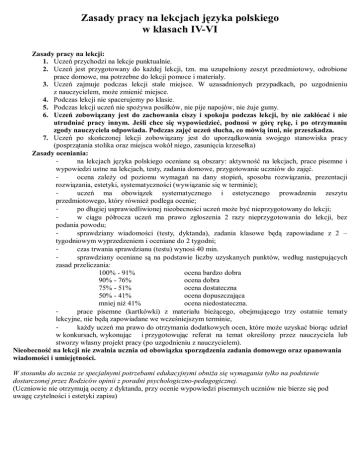 Zasady pracy na lekcjach języka polskiego w klasach IV-VI Zasady pracy na lekcji: 1. Uczeń przychodzi na lekcje punktualnie. 2. Uczeń jest przygotowany do każdej lekcji, tzn. ma uzupełniony zeszyt przedmiotowy, odrobione prace domowe, ma potrzebne do lekcji pomoce i materiały. 3. Uczeń zajmuje podczas lekcji stałe miejsce. W uzasadnionych przypadkach, po uzgodnieniu z nauczycielem, może zmienić miejsce. 4. Podczas lekcji nie spacerujemy po klasie. 5. Podczas lekcji uczeń nie spożywa posiłków, nie pije napojów, nie żuje gumy. 6. Uczeń zobowiązany jest do zachowania ciszy i spokoju podczas lekcji, by nie zakłócać i nie utrudniać pracy innym. Jeśli chce się wypowiedzieć, podnosi w górę rękę, i po otrzymaniu zgody nauczyciela odpowiada. Podczas zajęć uczeń słucha, co mówią inni, nie przeszkadza. 7. Uczeń po skończonej lekcji zobowiązany jest do uporządkowania swojego stanowiska pracy (posprzątania stolika oraz miejsca wokół niego, zasunięcia krzesełka) Zasady oceniania: na lekcjach języka polskiego oceniane są obszary: aktywność na lekcjach, prace pisemne i wypowiedzi ustne na lekcjach, testy, zadania domowe, przygotowanie uczniów do zajęć. ocena zależy od poziomu wymagań na dany stopień, sposobu rozwiązania, prezentacji rozwiązania, estetyki, systematyczności (wywiązanie się w terminie); uczeń ma obowiązek systematycznego i estetycznego prowadzenia zeszytu przedmiotowego, który również podlega ocenie; po długiej usprawiedliwionej nieobecności uczeń może być nieprzygotowany do lekcji; w ciągu półrocza uczeń ma prawo zgłoszenia 2 razy nieprzygotowania do lekcji, bez podania powodu; sprawdziany wiadomości (testy, dyktanda), zadania klasowe będą zapowiadane z 2 – tygodniowym wyprzedzeniem i oceniane do 2 tygodni; czas trwania sprawdzianu (testu) wynosi 40 min. sprawdziany oceniane są na podstawie liczby uzyskanych punktów, według następujących zasad przeliczania: 100% - 91% ocena bardzo dobra 90% - 76% ocena dobra 75% - 51% ocena dostateczna 50% - 41% ocena dopuszczająca mniej niż 41% ocena niedostateczna. prace pisemne (kartkówki) z materiału bieżącego, obejmującego trzy ostatnie tematy lekcyjne, nie będą zapowiadane we wcześniejszym terminie, każdy uczeń ma prawo do otrzymania dodatkowych ocen, które może uzyskać biorąc udział w konkursach, wykonując i przygotowując referat na temat określony przez nauczyciela lub stworzy własny projekt pracy (po uzgodnieniu z nauczycielem). Nieobecność na lekcji nie zwalnia ucznia od obowiązku sporządzenia zadania domowego oraz opanowania wiadomości i umiejętności. W stosunku do ucznia ze specjalnymi potrzebami edukacyjnymi obniża się wymagania tylko na podstawie dostarczonej przez Rodziców opinii z poradni psychologiczno-pedagogicznej. (Uczniowie nie otrzymują oceny z dyktanda, przy ocenie wypowiedzi pisemnych uczniów nie bierze się pod uwagę czytelności i estetyki zapisu)