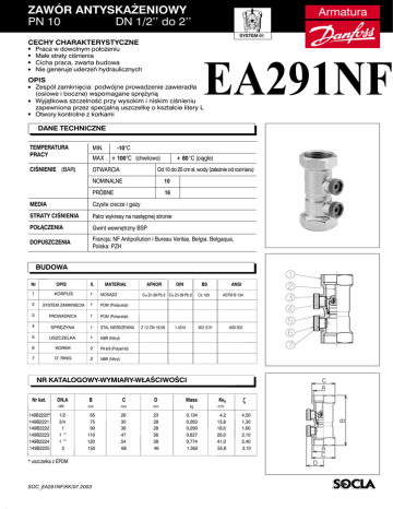 ZAWÓR ANTYSKAŻENIOWY PN 10 DN 1/2’’ do 2’’ Armatura SYSTEM 01 CECHY CHARAKTERYSTYCZNE Praca w dowolnym położeniu Małe straty ciśnienia Cicha praca, zwarta budowa Nie generuje uderzeń hydraulicznych ● ● ● ● EA291NF OPIS Zespół zamknięcia: podwójne prowadzenie zawieradła (osiowe i boczne) wspomagane sprężyną Wyjątkowa szczelność przy wysokim i niskim ciśnieniu zapewniona przez specjalną uszczelkę o kształcie litery L Otwory kontrolne z korkami ● ● ● DANE TECHNICZNE TEMPERATURA PRACY MIN. CIŚNIENIE (BAR) OTWARCIA -10°C MAX . + 100°C (chwilowo) + 80 °C (ciągle) Od 10 do 25 cm sł. wody (zależnie od rozmiaru) NOMINALNE 10 PRÓBNE 16 MEDIA Czyste ciecze i gazy STRATY CIŚNIENIA Patrz wykresy na następnej stronie POŁĄCZENIA Gwint wewnętrzny BSP DOPUSZCZENIA Francja: NF Antipollution i Bureau Veritas, Belgia: Belgaqua, Polska: PZH BUDOWA Nr OPIS Il. MATERIAŁ 1 KORPUS 1 MOSIĄDZ 2 SYSTEM ZAMKNIĘCIA 1 POM (Poliacetal) 3 PROWADNICA 1 POM (Poliacetal) 4 SPRĘŻYNA 1 STAL NIERDZEWNA 5 USZCZELKA 1 NBR (Nitryl) 6 KOREK 2 PA 6/6 (Polyamid) 7 O’ RING 2 NBR (Nitryl) AFNOR DIN BS Cu Zn 39 Pb 2 Cu Zn 39 Pb 2 Cz 120 Z 12 CN 18.09 302 S 31 1.4310 ANSI ASTM B 124 AISI 302 NR KATALOGOWY-WYMIARY-WŁAŚCIWOŚCI Nr kat. 149B2220* 149B2221 149B2222 149B2223 149B2224 149B2225 DN,A B C D Masa cale mm mm mm kg m3/h 1/2 3/4 1 1 1/4 1 1/2 2 65 75 90 110 120 150 26 30 38 47 54 66 23 28 28 36 38 46 0,134 0,283 0,290 0,627 0,774 1,362 4,2 13,8 18,0 28,0 41,0 55,8 * uszczelka z EPDM SOC_EA291NF/KK/07.2003 Kvs z 4,50 1,30 1,60 2,10 2,40 3,10 Typ EA291NF ZAWÓR ANTYSKAŻENIOWY PN 10 DN 1/2’’ do 2’’ SYSTEM 01 WYKRESY STRAT CIŚNIENIA m sł. wody UWAGI: Linia ciągła-zawór całkowicie otwarty Linia przerywana-zawór w trakcie otwierania PRZEPŁYW m3/h PRZEPŁYW GALLON/MIN INNE WERSJE ZAWORU EA291NF : F/M, mosiądz : F/M, mosiądz : F/F, mosiądz DZR : M/M, mosiądz : Mosiądz otwory z korkami z PA Mosiądz, otwory z korkami : mosiężnymi : EA251CD Mosiądz, korpus kątowy „prawy” EA251CDG : Mosiądz, korpus kątowy „lewy” EA251PU Mosiądz, korki z kurkami : upustowymi : M/M, mosiądz EB261 : M/M, mosiądz EA271 : M/M, mosiądz 281 : M/F, mosiądz chromowany 281C : F/F, mosiądz 601 601V : F/F, mosiądz, uszczelka FKM EB901 : Wkład wewnętrzny : Podwójny zawór zwrotny ED2211 : Podwójny zawór zwrotny ED2231 EB201 EA221B EB231 EB241 EA251 EA251BL *M – gwint zewnętrzny F – gwint wewnętrzny INSTALACJA WŁAŚCIWOŚCI ZAWORU EA291NF Praca zaworu w dowolnym położeniu Zawór antyskażeniowy EA291NF wyposażony jest w zamknięcie systemu 01, który spełnia najbardziej wymagające normy europejskie. ● SZCZELNOŚĆ: Zawór może być poddawany ciśnieniu od 3 cm sł. wody MOŻLIWOŚĆ NADZORU aż do 16 bar. ● NIEZAWODNOŚĆ: Zawór typu EA291NF poddawany próbie jest 80 000 cykli 15-sto sekundowych (otwórz-zamknij), przy temperaturze wody 65°C i ciśnieniu 10 bar. Dodatkowo zawór umieszcza się wcześniej na godzinę w wodzie o temperaturze 90°C. Tak surowe testy doskonale wykazują niezawodność i bezwzględną szczelność zaworu EA291NF. ● ROLA USZCZELKI W KSZTAŁCIE LITERY L Otwór kontrolny Otwór spustowy Niskie ciśnienie: Szczelność jest zapewniona przez precyzyjne przyleganie zespołu zamknięcia i uszczelki w kształcie litery L. Otwór kontrolny (po stronie dopływu): służy do kontroli szczelności zamkniętego zaworu zwrotnego w trakcie eksploatacji; po zamknięciu zaworu odcinającego przed zaworem antyskażeniowym i spuszczeniu wody z odcinka między zaworami odcinającym i zwrotnym nie powinno być już żadnego wycieku. Otwór spustowy: dodatkowy otwór służący do opróżniania instalacji za zaworem zwrotnym. Danfoss Sp. z o.o. ul. Chrzanowska 5 PL-05-825 Grodzisk Mazowiecki Telefon: (0 22) 755 07 00 Telefax: (0 22) 755 07 01 http://www.danfoss.pl e-mail: [email protected] Wysokie ciśnienie:Szczelność jest zapewniona przez przyleganie zespołu zamknięcia i wewnętrznej części uszczelki. Zespół zamknięcia dodatkowo opiera się na korpusie, co stanowi drugi stopień zabezpieczenia. WYSOKIE CIŚNIENIE NISKIE CIŚNIENIE Kontakt z serwisem Telefon: (0 22) 755 07 90 Hotline: (0 22) 755 07 91 Telefax: (0 22) 755 07 82 e-mail: [email protected] Danfoss nie ponosi odpowiedzialnoci za mo¿liwe b³êdy w katalogach, broszurach i innych materia³ach drukowanych. Danfoss zastrzega sobie prawo do wprowadzania zmian w produktach bez uprzedzenia. Dotyczy to równie¿ produktów ju¿ zamówionych. Zamienniki mog¹ byæ dostarczone bez dokonywania jakichkolwiek zmian w specyfikacjach ju¿ uzgodnionych. Wszystkie znaki towarowe w tym materiale s¹ w³asnoci¹ odpowiednich spó³ek. Danfoss, logotyp Danfoss s¹ znakami towarowymi Danfoss A/S. Wszystkie prawa zastrze¿one.