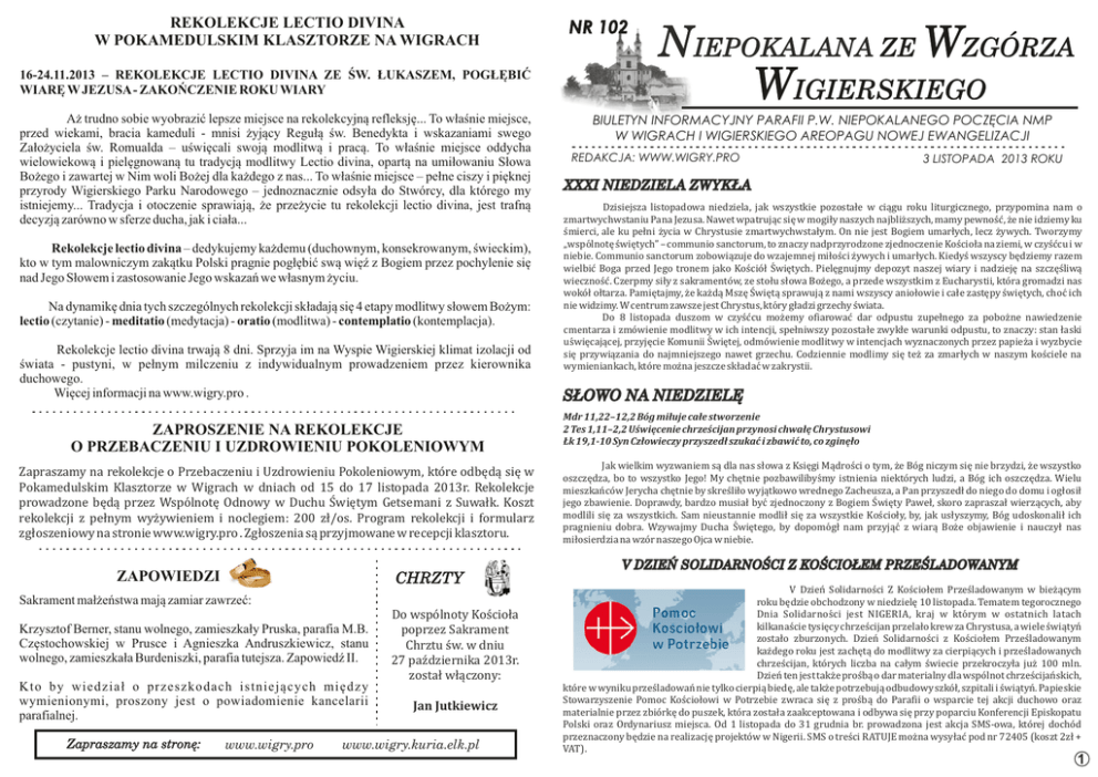 REKOLEKCJE LECTIO DIVINA W POKAMEDULSKIM KLASZTORZE NA WIGRACH 16-24.11.2013 – REKOLEKCJE LECTIO DIVINA ZE ŚW. ŁUKASZEM, POGŁĘBIĆ WIARĘ W JEZUSA - ZAKOŃCZENIE ROKU WIARY Aż trudno sobie wyobrazić lepsze miejsce na rekolekcyjną refleksję... To właśnie miejsce, przed wiekami, bracia kameduli - mnisi żyjący Regułą św. Benedykta i wskazaniami swego Założyciela św. Romualda – uświęcali swoją modlitwą i pracą. To właśnie miejsce oddycha wielowiekową i pielęgnowaną tu tradycją modlitwy Lectio divina, opartą na umiłowaniu Słowa Bożego i zawartej w Nim woli Bożej dla każdego z nas... To właśnie miejsce – pełne ciszy i pięknej przyrody Wigierskiego Parku Narodowego – jednoznacznie odsyła do Stwórcy, dla którego my istniejemy... Tradycja i otoczenie sprawiają, że przeżycie tu rekolekcji lectio divina, jest trafną decyzją zarówno w sferze ducha, jak i ciała... Rekolekcje lectio divina – dedykujemy każdemu (duchownym, konsekrowanym, świeckim), kto w tym malowniczym zakątku Polski pragnie pogłębić swą więź z Bogiem przez pochylenie się nad Jego Słowem i zastosowanie Jego wskazań we własnym życiu. Na dynamikę dnia tych szczególnych rekolekcji składają się 4 etapy modlitwy słowem Bożym: lectio (czytanie) - meditatio (medytacja) - oratio (modlitwa) - contemplatio (kontemplacja). Rekolekcje lectio divina trwają 8 dni. Sprzyja im na Wyspie Wigierskiej klimat izolacji od świata - pustyni, w pełnym milczeniu z indywidualnym prowadzeniem przez kierownika duchowego. Więcej informacji na www.wigry.pro . ZAPROSZENIE NA REKOLEKCJE O PRZEBACZENIU I UZDROWIENIU POKOLENIOWYM ZapraszamynarekolekcjeoPrzebaczeniuiUzdrowieniuPokoleniowym,któ reodbędąsięw Pokamedulskim Klasztorze w Wigrach w dniach od 15 do 17 listopada 2013r. Rekolekcje prowadzone będą przez Wspó lnotę Odnowy w Duchu Swiętym Getsemani z Suwałk. Koszt rekolekcji z pełnym wyż ywieniem i noclegiem: 200 zł/os. Program rekolekcji i formularz zgłoszeniowynastroniewww.wigry.pro.Zgłoszeniasąprzyjmowanewrecepcjiklasztoru. ZAPOWIEDZI CHRZTY Sakrament małżeństwa mają zamiar zawrzeć: Krzysztof Berner, stanu wolnego, zamieszkały Pruska, parafia M.B. Częstochowskiej w Prusce i Agnieszka Andruszkiewicz, stanu wolnego, zamieszkała Burdeniszki, parafia tutejsza. Zapowiedź II. Kto by wiedział o przeszkodach istniejących między wymienionymi, proszony jest o powiadomienie kancelarii parafialnej. Zapraszamy na stronę: www.wigry.pro DowspólnotyKościoła poprzezSakrament Chrztuśw.wdniu 27października2013r. zostałwłączony: JanJutkiewicz www.wigry.kuria.elk.pl NR 102 NIEPOKALANA ZE WZGÓRZA WIGIERSKIEGO BIULETYN INFORMACYJNY PARAFII P.W. NIEPOKALANEGO POCZĘCIA NMP W WIGRACH I WIGIERSKIEGO AREOPAGU NOWEJ EWANGELIZACJI REDAKCJA: WWW.WIGRY.PRO 3 LISTOPADA 2013 ROKU XXXI NIEDZIELA ZWYKŁA Dzisiejsza listopadowa niedziela, jak wszystkie pozostałe w ciągu roku liturgicznego, przypomina nam o zmartwychwstaniuPanaJezusa.Nawetwpatrującsięwmogiłynaszychnajbliż szych,mamypewnoś ć,ż enieidziemyku ś mierci,alekupełniż yciawChrystusiezmartwychwstałym.OnniejestBogiemumarłych,leczż ywych.Tworzymy „wspó lnotęś więtych”–communiosanctorum,toznaczynadprzyrodzonezjednoczenieKoś ciołanaziemi,wczyś ćcuiw niebie.Communiosanctorumzobowiązujedowzajemnejmiłoś ciż ywychiumarłych.Kiedyś wszyscybędziemyrazem wielbić Boga przed Jego tronem jako Koś ció ł Swiętych. Pielęgnujmy depozyt naszej wiary i nadzieję na szczęś liwą wiecznoś ć.Czerpmysiłyzsakramentó w,zestołusłowaBoż ego,aprzedewszystkimzEucharystii,któ ragromadzinas wokó łołtarza.Pamiętajmy,ż ekaż dąMszęSwiętąsprawująznamiwszyscyaniołowieicałezastępyś więtych,choć ich niewidzimy.WcentrumzawszejestChrystus,któ rygładzigrzechyś wiata. Do 8 listopada duszom w czyś ćcu moż emy ofiarować dar odpustu zupełnego za poboż ne nawiedzenie cmentarzaizmó wieniemodlitwywichintencji,spełniwszypozostałezwykłewarunkiodpustu,toznaczy:stanłaski uś więcającej,przyjęcieKomuniiSwiętej,odmó wieniemodlitwywintencjachwyznaczonychprzezpapież aiwyzbycie się przywiązania do najmniejszego nawet grzechu. Codzienniemodlimy się też za zmarłych w naszym koś ciele na wymieniankach,któ remoż najeszczeskładać wzakrystii. SŁOWO NA NIEDZIELĘ Mdr11,22–12,2Bógmiłujecałestworzenie 2Tes1,11–2,2UświęceniechrześcijanprzynosichwałęChrystusowi Łk19,1-10SynCzłowieczyprzyszedłszukaćizbawićto,cozginęło JakwielkimwyzwaniemsądlanassłowazKsięgiMądroś ciotym,ż eBó gniczymsięniebrzydzi,ż ewszystko oszczędza,botowszystkoJego!Mychętniepozbawilibyś myistnienianiektó rychludzi,aBó gichoszczędza.Wielu mieszkań có wJerychachętniebyskreś liłowyjątkowowrednegoZacheusza,aPanprzyszedłdoniegododomuiogłosił jegozbawienie.Doprawdy,bardzomusiałbyć zjednoczonyzBogiemSwiętyPaweł,skorozapraszałwierzących,aby modlilisięzawszystkich.SamnieustanniemodliłsięzawszystkieKoś cioły,by,jakusłyszymy,Bó gudoskonaliłich pragnieniu dobra. Wzywajmy Ducha Swiętego, by dopomó gł nam przyjąć z wiarą Boż e objawienie i nauczył nas miłosierdzianawzó rnaszegoOjcawniebie. V DZIEŃ SOLIDARNOŚCI Z KOŚCIOŁEM PRZEŚLADOWANYM V Dzień Solidarnoś ci Z Koś ciołem Prześ ladowanym w bież ącym rokubędzieobchodzonywniedzielę10listopada.Tematemtegorocznego Dnia Solidarnoś ci jest NIGERIA, kraj w któ rym w ostatnich latach kilkanaś cietysięcychrześ cijanprzelałokrewzaChrystusa,awieleś wiątyń zostało zburzonych. Dzień Solidarnoś ci z Koś ciołem Prześ ladowanym każ degorokujestzachętądomodlitwyzacierpiącychiprześ ladowanych chrześ cijan, któ rych liczba na całym ś wiecie przekroczyła już 100 mln. Dzień tenjesttakż eproś bąodarmaterialnydlawspó lnotchrześ cijań skich, któ rewwynikuprześ ladowań nietylkocierpiąbiedę,aletakż epotrzebująodbudowyszkó ł,szpitaliiś wiątyń .Papieskie Stowarzyszenie Pomoc Koś ciołowi w