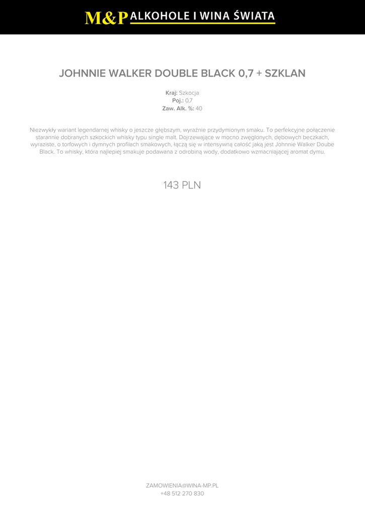 JOHNNIE WALKER DOUBLE BLACK 0,7 + SZKLAN Kraj: Szkocja Poj.: 0,7 Zaw. Alk. %: 40 Niezwykły wariant legendarnej whisky o jeszcze głębszym, wyraźnie przydymionym smaku. To perfekcyjne połączenie starannie dobranych szkockich whisky typu single malt. Dojrzewające w mocno zwęglonych, dębowych beczkach, wyraziste, o torfowych i dymnych profilach smakowych, łączą się w intensywną całość jaką jest Johnnie Walker Doube Black. To whisky, która najlepiej smakuje podawana z odrobiną wody, dodatkowo wzmacniającej aromat dymu. 143 PLN [email protected] +48 512 270 830