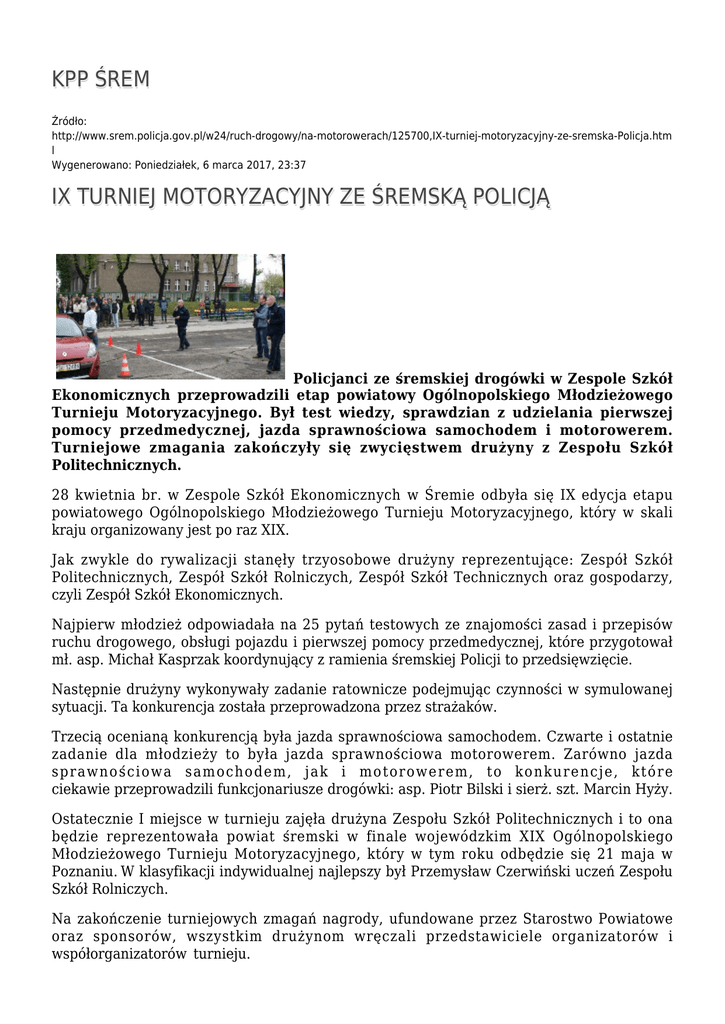 KPP ŚREM Źródło: http://www.srem.policja.gov.pl/w24/ruch-drogowy/na-motorowerach/125700,IX-turniej-motoryzacyjny-ze-sremska-Policja.htm l Wygenerowano: Poniedziałek, 6 marca 2017, 23:37 IX TURNIEJ MOTORYZACYJNY ZE ŚREMSKĄ POLICJĄ Policjanci ze śremskiej drogówki w Zespole Szkół Ekonomicznych przeprowadzili etap powiatowy Ogólnopolskiego Młodzieżowego Turnieju Motoryzacyjnego. Był test wiedzy, sprawdzian z udzielania pierwszej pomocy przedmedycznej, jazda sprawnościowa samochodem i motorowerem. Turniejowe zmagania zakończyły się zwycięstwem drużyny z Zespołu Szkół Politechnicznych. 28 kwietnia br. w Zespole Szkół Ekonomicznych w Śremie odbyła się IX edycja etapu powiatowego Ogólnopolskiego Młodzieżowego Turnieju Motoryzacyjnego, który w skali kraju organizowany jest po raz XIX. Jak zwykle do rywalizacji stanęły trzyosobowe drużyny reprezentujące: Zespół Szkół Politechnicznych, Zespół Szkół Rolniczych, Zespół Szkół Technicznych oraz gospodarzy, czyli Zespół Szkół Ekonomicznych. Najpierw młodzież odpowiadała na 25 pytań testowych ze znajomości zasad i przepisów ruchu drogowego, obsługi pojazdu i pierwszej pomocy przedmedycznej, które przygotował mł. asp. Michał Kasprzak koordynujący z ramienia śremskiej Policji to przedsięwzięcie. Następnie drużyny wykonywały zadanie ratownicze podejmując czynności w symulowanej sytuacji. Ta konkurencja została przeprowadzona przez strażaków. Trzecią ocenianą konkurencją była jazda sprawnościowa samochodem. Czwarte i ostatnie zadanie dla młodzieży to była jazda sprawnościowa motorowerem. Zarówno jazda sprawnościowa samochodem, jak i motorowerem, to konkurencje, które ciekawie przeprowadzili funkcjonariusze drogówki: asp. Piotr Bilski i sierż. szt. Marcin Hyży. Ostatecznie I miejsce w turnieju zajęła drużyna Zespołu Szkół Politechnicznych i to ona będzie reprezentowała powiat śremski w finale wojewódzkim XIX Ogólnopolskiego Młodzieżowego Turnieju Motoryzacyjnego, który w tym roku odbędzie się 21 maja w Poznaniu. W klasyfikacji indywidualnej najlepszy był Przemysław Czerwiński uczeń Zespołu Szkół Rolniczych. Na zakończenie turniejowych zmagań nagrody, ufundowane przez Starostwo Powiatowe oraz sponsorów, wszystkim drużynom wręczali przedstawiciele organizatorów i współorganizatorów turnieju. Organizatorami i współorganizatorami tegorocznej, IX edycji etapu powiatowego Ogólnopolskiego Młodzieżowego Turnieju Motoryzacyjnego byli: ● ● ● ● Komenda Powiatowa Policji w Śremie, Starostwo Powiatowe w Śremie, Zespół Szkół Ekonomicznych w Śremie, Firmy: GREEN BIKE Poland, Dar – Zof sp. z o.o., TFP-Grafika sp. z o.o. oraz Komenda Powiatowa Państwowej Straży Pożarnej w Śremie. Ocena: 0/5 (0) Tweetnij