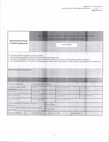 Zalqczniki do rozporzqdzenla Ministra Pracy i Polityki Spolecznej z dnia.........,....(po2..........) Zalqcznik nr 1 Ministerstwo Pracy i PolitykiSpofecznej za rok20L3 Formulorz naleiy wypelnit w jqzyku polskim; Sprowozdowco wypelnia tylko przeznaczone dlo niego biale pola; W trokcie wypelnionia formularza istnieje mo2liwoii dodowania wierszy oraz zowijania tekstdw w polach; We wszystkich polach, w kt6rych nie bqdq wpisane odpowiednie informocje, naleiy wstowic pojedynczy znak myltniko (-). Data zamieszczenia sprawozdania l';Prnl gi :, 1. Nazwa organizacji Fundacja \AMF Polska 2. Adres siedziby i dane Kraj Polska ::: kontaktowe Gmina Wojew6dztwo Mazowieckie Warszawa Miejscowo3d Warszawa Nr faksu 22-646-36-72 Nr domu roa poatowy 02-52$ illr Pocrta E-mait [email protected] 3. Data rejestracji w Krajowym Rejestrze 4. Data uzyskania statusu organizacji po2ytku publicznego 01 5481 o1 38 Nr lokalu - Warszawa Strona WWW Nr telefonu WWW.WWF.PL iiz.os.zoos SQdowym 5. Numer REGON Powiat Wa15zawSki lii'i 9 27.05.2004 6. Numer KRS 0000160673 22-849-84-69 lmiq i nazwisko 7, Sktad organu zarzqdzajqcego organizacji (Naleiy wpiso( imiono, nazwisko oroz informocje o funkcji Magdalena DulKomosi6ska Wpisany do Funkcja Dyrektor Naczelny Zarzadu petnionej przez poszczeg6lnych czlonk6w organu zarzqdzojqcego) O tat< i"^ nie {""' tak i-" nie ,- tak i' lmiq i nazwisko Donna 8. Sktad organu kontroli lub nadzoru organizacji (Nale2y wpisai imiono, nozwisko oroz int'ormacje o t'unkcji pelnionej przez poszczeg6lnych czlonk1w orgonu kontroli lub Lusti Hartmut Jungius Frederick Kwame Kumah Wiceprzewodniczqcy Radv Fundacii Przewodniczqcy Rady Fundacii nodzoru) 9. Cele statutowe organizacji (Naleiy opiso( cele na podstowie stotutu orgonizocji) nie Wpisany do Funkcja Skarbnik Rady Fundacji KRS I tak {' KRS nie I tat< f-" nie a tak tat< r:' nre I Maciej Nowicki Czlonek Rady Fundacji I Jaroslaw Kret Czlonek Rady Fundacji O tat< r'- nie Jakub Jerzy Antoszewski Czlonek Rady Fundacji I tat< nie ( nie Celem Fundacji jest dzialanie zmierzajqce do ochrony irodowiska naturalnego i procesow ekologicznych, a zwiaszcza fauny iflory, krajobrazu, w6d, gleby, powietrza iinnych bogactw naturalnych, ze szczeg6lnym uwzglqdnieniem utrzymania podstawowych proces6w ekologicznych isystemow podtrzymywanie 2ycia oraz zachowania izapewnicrria nieprzerwalnego korzystania z gatunkow genetycznych i 162norodno5ci ekosystemu. W zakresie dziafalno6ci po2ytku publicznego Fundacja prowadzi dzialalnoii w zakresie ekologii i ochrony Srodowiska, w zakresie badari naukowych i prac rozwojowych w dziedzinach nauk przyrodniczych i ochrony Srodowiska, dzialalnoii edukacyjnq i wydawniczq oraz zwiqzanq z organizacjq targ6w, wystaw i kongres6w. Fundacja realizuje swoje cele statutowe podejmujqc starania aby zbierai jak rownie2 wypfacai fundusze na ochronq przyrody innym organizacjq non profit, tak2e nimi i zarzqdza(., analizowai potrzeby ochrony irodowiska w Polsce oraz badai i rozwijai Srodki dla zaspokojenia tych potrzeb. Fundacja stara siq rozwijai Swiadomoii potrzeby ochrony przyrody poprzez dzialalnoii edukacyjnq, informacyjnq iwydawniczq. Organizuje spotkania, szkolenia i konferencje o tematyce zwiqzanej z ochronq irodowiska, uczestniczy w projektowaniu, produkcji i udostqpnianiu odpowiednich materialow dla celow edukacyjnych, kampanii, wystaw iirodk6w przekazu, aby wzmacniai i rozwijai ruch na rzecz ochrony przyrody w Polsce. Fundacja finansuje tei dziaiania i projekty zwiqzane z 10. Spos6b realizacji cel6w statutowych (Nole2y opisoi spos6b reolizacji cel6w statutowych orgonizocji no pod stawie statutu org onizocji ) ochronq irodowiska, w tym badania naukowe, wymianq naukowc6w czy specjalistriw z zakresu ochrony przyrody, student6w i innych os6b oraz promuje i uczestniczy w konferencjach, seminariach, wykiadach i spotkaniach wspomagajqcych ochronq przyrody. Fundacja stara siq rozwijai moralne ifinansowe wsparcie dla ochrony przyrody wspieraj.ic iSci5le wsp6tpracu)qcz innymi organizacjami dzialajqcymi na calym Swiecie a utworzonymi przez organizacjq WWF poprzez wsp6lfinansowanie prowadzonych przez nie akcji i projekt6w w zakresie ochrony Srodowiska naturalnego i proces6w ekologicznych. Fundacja opracowuje projekty, ekspertyzy oraz badania dotyczqce zagadnierl ekologicznych. Uczestniczy te2 w postqpowaniach administracyjnych i sqdowych w zakresie spraw zwiqzanych z ochronq Srodowiska. Kluczowym elenrentem dzialari Fundacji prowadzonych na rzecz zagro2onych gatunkow jest likwidowanie potencjalnych i rzeczywistych konflikt6w pomiqdzy ludlmi a zwierzQtami. l.Opis dzialalno$ci poiytku publicznego , ;, li:€ ,i.:1, i W 2013 roku przez Fundacjq byto realizowanych 13 projekt6w. Projekt "Usuwanie zalegajqcych sieci z Baftyku": Razem z partnerem projektu - Litewskim Funduszem na rzecz Ochrony Przyrody - zorganizowali6my konfcrcncjt; podsumowujqcq projekt. W trakcie konferencji wszystkie strony - w tym przedstawiciele polskiego i litewskiego resortu Srodowiska - zgodzily siq, 2e konieczne sq dalsze dzialania na rzecz ograniczenia negatywnego wplywu sieci widm na Srodowisko Battyku. Stworzona zostata interaktywna mapa zaczep6w, dostqpna w trzech jqzykach na stronie internetowej sieciwidma.wwf.pl. Mapa zawiera informacje na temat niebezpiecznych obiektow, na ktorych rybacy mogq zrywai narzqdzia polowowe. Dane dostgpne w bazie sq o96lnodostgpne i bezplatne - kaidy rybak mo2e je pobrai w celu wtqczenia do swoich map nawigacyjnych. Wtqczenie tych punkt6w mo2e przyczynii siq do znacznego zmniejszenia liczby traconych narzqdzi poiowowych. Projekt,,Zr6wn owaion e rybof6wstwo" Takonczyl siq proces reformyWsp6lnej Polityki Rybot6wstwa Unii Europejskiej, kt6rytrwatod 2009 roku. Miqdzy innymi dziqki dzialaniom WWF Polska prowadzonym w ramach tego projektu, nowa polityka zawiera przepisy, kt6re obligujq paristwa czfonkowskie do podjqcia dziatari na rzecz odbudowy nadmiernie eksploatowanych stad do stabilnych, zrownowa2onych poziom6w. W 2013 roku zorganizowano dwa spotkania Polskieg