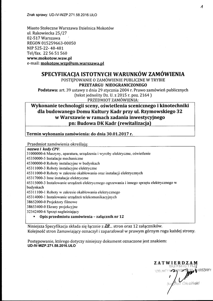 Obiekt: DOM KULTURY „KADR” (W BUDOWIE) ul. Rzymowskiego 32, 02-697 Warszawa Działka ew. nr 5/5 z obrębu 1-04-11 Projekt: Aranżacja wnętrz pomieszczeń oraz pierwsze wyposażenie wnętrz w Domu Kultury „KADR” w ramach zadania inwestycyjnego p.n. „Budowa Domu Kultury „KADR” (rewitalizacja) Inwestor: MIASTO STOŁECZNE WARSZAWA Dzielnica Mokotów ul. Rakowiecka 25/27 02-517 Warszawa Główne jednostki projektowania: UNI sp. z o.o. ul. Łowicka 54 lok. 20, 02-531 Warszawa pracownia: ul. Żabińskiego 2 lok. 1A, 02-793 Warszawa PROJEKT SAMOGRAJ DĄBROWSKA GRAJ Sp. j. ul. Bukowska 113a, 60-567 Poznań [email protected] Branżowa jednostka projektowania: Przedsiębiorstwo Specjalistyczne TEATR Marek Gumiński ul. Grabowa 8; 05-501 Piaseczno PROJEKT WYKONAWCZY WNĘTRZ – CZĘŚĆ B TOM III – TECHNOLOGIA SCENY Zespół mgr inż. Małgorzata Bober mgr inż. Paweł Ziomecki mgr inż. Tomasz Zaborowski WRZESIEŃ 2015 CPV: 45350000-5 Instalacje mechaniczne 31000000-6 Maszyny, aparatura, urządzenia i wyroby elektryczne; oświetlenie ARANŻACJA WNĘTRZ POMIESZCZEŃ ORAZ PIERWSZE WYPOSAŻENIE WNĘTRZ W BUDYNKU DOMU KULTURY „KADR” (W BUDOWIE) – PROJEKT WYKONAWCZY WNĘTRZ (CZĘŚĆ B), TOM III – TECHNOLOGIA SCENY, WRZESIEŃ 2015 SPIS ZAWARTOŚCI OPRACOWANIA I. Zakres opracowania II. Wstęp III. Technologia IV. Urządzenia mechaniczne sceny głównej V. Urządzenia i instalacja napędów elektrycznych VI. Wytyczne dla branż VII. Rysunki T1-Rzut nawarstwiony sceny T2- Przekrój podłużny sceny T3-Schemat rozmieszczenie urządzeń mechanicznych sceny i widowni T4-Przekój poprzeczny sceny T5-Rozmieszczenie wciągarek T6-Rzut blokowni z planem obciążeń T7-Plan obciążeń podkonstrukcji wciągarek T8-Zarys stałej kładki portalowej i wież portalowych M1-Sztankiety Sceny KP,1,2,4,6,7,8,9,11,12 M2-Sztankiety Sceny 3,5,10,SH M3-Most oświetleniowy Sceny M4-Sztankiet oświetleniowy widowni M5-Sztankiet Prawy Sceny N1-Schemat RNS 2 ARANŻACJA WNĘTRZ POMIESZCZEŃ ORAZ PIERWSZE WYPOSAŻENIE WNĘTRZ W BUDYNKU DOMU KULTURY „KADR” (W BUDOWIE) – PROJEKT WYKONAWCZY WNĘTRZ (CZĘŚĆ B), TOM III – TECHNOLOGIA SCENY, WRZESIEŃ 2015 I. ZAKRES OPRACOWANIA Opracowanie niniejsze obejmuje: technologię sceny głównej urządzenia mechaniczne sceny 3 ARANŻACJA WNĘTRZ POMIESZCZEŃ ORAZ PIERWSZE WYPOSAŻENIE WNĘTRZ W BUDYNKU DOMU KULTURY „KADR” (W BUDOWIE) – PROJEKT WYKONAWCZY WNĘTRZ (CZĘŚĆ B), TOM III – TECHNOLOGIA SCENY, WRZESIEŃ 2015 II. TECHNOLOGIA SCENY Scena główna zostanie wyposażona w mechanizację górną składającą się z: kurtyny podnoszonej KP, 13 sztankietów do zawieszania dekoracji, 1 sztankietu horyzontowego, 1 mostu oświetleniowego, 1 Sztankietu Ekranu, 1 sztankietów bocznego, 8 kulis. Nad widownią będzie zamontowany 1 sztankiet oświetleniowy widowni. Scena Sali Widowiskowej zostanie wyposażona w stałą kładkę portalową oraz przesuwane wieże portalowe. Projekt przewiduje zarys technologiczny w/w urządzeń. Wykonawca powinien wykonać obliczenia i sprawdzenie konstrukcyjne urządzeń. Urządzenia będą posiadały napędy elektryczne o regulowanej prędkości ruchu z wyjątkiem sztankietu horyzontowego oraz most mostu oświetleniowego i sztankietów oświetleniowych oraz, których prędkość ruchu będzie stała. Urządzenia zlokalizowane na scenie będą sterowane centralnie z pulpitu napędów ustawionego w wieży portalowej. Mechanizacja będzie objęta systemem automatyki gwarantującej precyzyjną realizację wcześniej zaprogramowanych scenariuszy zmian dekoracji. 4 ARANŻACJA WNĘTRZ POMIESZCZEŃ ORAZ PIERWSZE WYPOSAŻENIE WNĘTRZ W BUDYNKU DOMU KULTURY „KADR” (W BUDOWIE) – PROJEKT WYKONAWCZY WNĘTRZ (CZĘŚĆ B), TOM III – TECHNOLOGIA SCENY, WRZESIEŃ 2015 III. Urządzenia mechaniczne sceny głównej 1 most oświetleniowy sceny M1 - długość 8,7m - wysokość 1,7m - szerokość 0,7m - konstrukcja stalowa ażurowa podwieszona na dwóch rzędach lin nośnych - nośność użytkowa – most I - 900kG - zespół napędowy silnik Elektryczny trójfazowy asynchroniczny 2,2kW z dwoma hamulcami i enkoderem- zespół zamocowany na ścianie lewej pod sufitem - skok (dół mostu) 0,5m ÷ 8,5m - prędkość ruchu 0 ÷ 0,1 m/sek. - sterowanie centralne z pulpitu napędów 1 kurtyna tekstylna podnoszona - długość belki kurtynowej 9,2m - belka kurtynowa podwieszona na 3 linach nośnych - napęd elektryczny – silnik trójfazowy asynchroniczny 5,5kW - nośność użytkowa 200kG - skok 0,8m ÷ 10m - prędkość ruchu 0 ÷ 0,9 m/sek - zespół napędowy ustawiony na konstrukcji pod wciągarki - sterowanie centralne z pulpitu napędów i z pulpitu inspicjenta 13 sztankietów liniowych (nr. 1÷13) - długość belki 8,5m - zespół napędowy z silnikiem trójfazowym asynchronicznym 3,0kW z dwoma niezależnie działającymi hamulcami oraz en koderem. Zespoły napędowe ustawione na konstrukcji pod wciągarki (Zespoły sztankietów 3, 10, 13 zamocowane na ścianie lewej pod sufitem) - prędkość ruchu 0 ÷0,5m/sek. - nośność użytkowa 200 kg - sterowanie centralne z głównego komputerowego pulpitu napędów 5 ARANŻACJA WNĘTRZ POMIESZCZEŃ ORAZ PIERWSZE WYPOSAŻENIE WNĘTRZ W BUDYNKU DOMU KULTURY „KADR” (W BUDOWIE) – PROJEKT WYKONAWCZY WNĘTRZ (CZĘŚĆ B), TOM III – TECHNOLOGIA SCENY, WRZESIEŃ 2015 1 sztankiet Ekranu (nr. SE) - długość belki 8,5m - zespół napędowy z silnikiem trójfazowym asynchronicznym 4,0kW dwoma hamulcami i en koderem, zespół zamocowany na ścianie lewej pod sufitem - prędkość ruchu 0 ÷ 0,2/sek. - nośność użytkowa 500kG - skok 0,8 ÷10m - sterowanie centralne z głównego pulpitu napędów 1 sztankiet horyzontowy (nr. SH) - długość belki 8,7m - zespół napędowy z silnikiem trójfazowym asynchronicznym 3,0kW dwoma hamulcami i en koderem, zespół ustawiony na konstrukcji pod wciągarki - prędkość ruchu 0 ÷ 0,5m/sek. - nośność użytkowa 200kG - skok 0,8 ÷10m - sterowanie ce