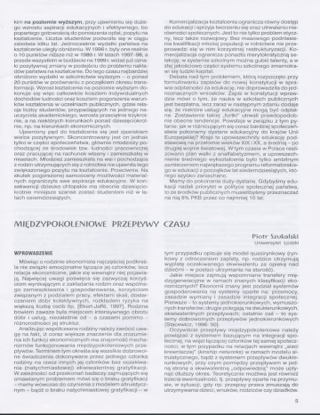 kim na poziomie wyższym, przy ujawnieniu się duże go wzrostu aspiracji edukacyjnych i efektywnego, bo popartego gotow ością do ponoszenia optat, popytu na kształcenie. Liczba studentów podw oiła się w ciągu zaledwie kilku lat. Jednocześnie wydatki państwa na kształcenie uległy obniżeniu. W 1996 r. były one realnie o 10 punktów niższe niż w 1989 r. W latach 1997-98, a przede wszystkim w budżecie na 1999 r. widać już ozna ki pozytywnej zm iany w podejściu do problem u nakła dów państwa na kształcenie. Do tego czasu najbardziej obniżono w ydatki w szkolnictwie wyższym - o ponad 20 punktów w porównaniu z początkiem okresu trans formacji. W zrost kształcenia na poziom ie wyższym do konuje się w ięc całkow icie kosztem indyw idualnych dochodów ludności oraz kosztem pogorszenia w arun ków kształcenia w uczelniach publicznych, gdzie rela cja liczby studentów, przypadających na jednego na uczyciela akadem ickiego, wzrosła przeciętnie trzykrot nie, a na niektórych kierunkach ponad dziesięciokrot nie, np. na kierunkach ekonom icznych. Ujaw niony pęd do kształcenia się jest zjawiskiem wielce pozytyw nym . S koncentrow any jest on jednak tylko w części społeczeństw a, głów nie m łodzieży po chodzącej ze środow isk tzw. ludności pracowniczej oraz pracującej na rachunek w łasny i zamieszkałej w m iastach. M łodzież zam ieszkała na wsi i pochodząca z rodzin utrzym ujących się z rolnictwa nie ujawniła tego zw iększonego popytu na kształcenie. Przeciwnie. Na skutek pogorszonej sam ooceny m ożliwości m aterial nych ograniczyła swe aspiracje edukacyjne. W kon sekwencji dziecko chłopskie ma obecnie dziesięcio krotnie m niejsze szanse zostać studentem niż w la tach osiem dziesiątych. Kom ercjalizacja kształcenia ogranicza rów ny dostęp do edukacji i sprzyja tw orzeniu się oraz utrwalaniu nie równości społecznych. Jest to nie tylko problem etycz ny, lecz także rozwojowy. Bez m asow ego podniesie nia kwalifikacji m łodej populacji w rolnictw ie nie prze prowadzi się w nim korzystnej restrukturyzacji. Ko m ercjalizacja ogranicza ponadto m erytokratyczną se lekcję; w systemie szkolnym m ożna g ub ić talenty, a w złej jakościow o części system u szkolnego zm arnotra wi się ludzki kapitał. Debata nad tym problem em , którą rozpoczęto przy form ułow aniu zapisów do nowej konstytucji w spra wie odpłatności za edukację, nie doprow adziła do je d noznacznych w niosków. Zapis w konstytucji w praw dzie mówi o tym , że nauka w szkołach publicznych jest bezpłatna, lecz zaraz w następnym zdaniu dodaje się, że niektóre usługi edukacyjne m ogą być o dpłat ne. Zostawienie takiej „furtki” utrwali p ra w d o p o d o b nie obecne tendencje. Powstaje w związku z tym py tanie: jak w różnicującym się coraz bardziej społeczeń stwie pokonam y dystans edukacyjny do krajów Unii Europejskiej? Kraje te upow szechniły edukację p od stawową na przełom ie w ieków XIX i XX, a średnią - po drugiej wojnie światowej. W tym czasie w Polsce reali zowano plan walki z analfabetyzm em , a upow szech nienie średniego w ykształcenia było tylko am bitnym zamierzeniem największego program u reform atorskie go w edukacji z początków lat siedem dziesiątych, któ rego szybko zaniechano. Mamy do pokonania duży dystans. G dybyśm y edu kacji nadali priorytet w polityce społecznej państwa, to ze środków publicznych m usielibyśm y przeznaczać na nią 8% PKB przez co najmniej 10 lat. MIĘDZYPOKOLENIOWE PRZEPŁYWY CZASU Piotr Szukalski Uniwersytet Łódzki WPROWADZENIE M ówiąc o rodzinie ekonom ista najczęściej podkreś la nie związki em ocjonalne łączące jej członków, lecz relacje ekonom iczne, jakie się wew nątrz niej pojaw ia ją. Najwięcej uwagi pośw ięca się zazwyczaj korzyś ciom w ynikającym z zakładania rodzin oraz w spólne go za m ieszkiw a nia i g o sp o d a ro w a n ia , ko rzyściom związanym z podziałem pracy, efektami skali, dostar czaniem d ó b r ko le ktyw n ych , rozkład e m ryzyka na większą liczbę osób itp. [Ekert-Jaffe, 1997]. Rodzina bowiem zawsze była m iejscem intensywnego obrotu dóbr i usług, niezależnie od - a czasami pom im o różnorodności jej struktur. Analizując w spółczesne rodziny należy zwrócić uwa gę na fakt, iż coraz większe znaczenie dla zrozum ie nia ich funkcji ekonom icznych ma znajom ość m echa nizm ów funkcjonow ania m iędzypokoleniow ych prze pływów. Terminem tym określa się wszelkie d o b ro w ol ne św iadczenia dokonyw ane przez jednego członka rodziny na rzecz innych jej członków bez oczekiw a nia (n a ty c h m ia s to w e j) e kw iw a le n tn e j g ra ty fik a c ji. W zależności od przekonań badaczy zajm ujących się om awianym problem em m ówi się o braku gratyfikacji - m am y w ów czas do czynienia z m odelem altruistycznym - bądź o braku natychm iastowej gratyfikacji - w tym przypadku opisuje się m odel ąuasirynkow y (ryn kowy z odroczeniem zapłaty, np. rodzice otrzym ują w ypłatę oczekiw anego ekw iw alentu za o piekę nad dziećm i - w postaci utrzym ania na starość). Jakie m iejsce zajm ują w spom niane transfery międzygeneracyjne w ram ach znanych klasyfikacji eko nom icznych? Ekonom ii znany jest podział system ów gosp od arow a nia na system y oparte na: przem ocy, zasadzie w ym iany i zasadzie integracji społecznej. Pierwsze - to system y jednokierunkow ych, w ym uszo nych transferów; drugie polegają na dwukierunkowych, ekwiwalentnych przepływach; ostatnie zaś - to sys tem y dobrow olnych przepływ ów jednokierunkow ych [Stacewicz, 1996: 50]. O czywiście przepływ y m ię dzyp o kolen iow e należy powiązać z system em bazującym na integracji sp o łecznej, na więzi łączącej członków tej samej społecz ności, w tym przypadku na relacjach wew nątrz „sieci krew niaczej” (kinship networks) w ram ach m odelu altruistycznego, bądź z system em przepływ ów dw uki