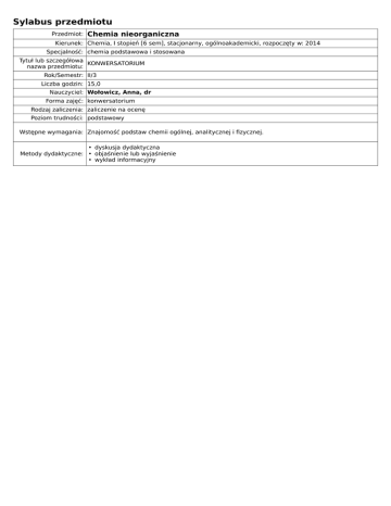 Sylabus przedmiotu Przedmiot: Chemia nieorganiczna Kierunek: Chemia, I stopień [6 sem], stacjonarny, ogólnoakademicki, rozpoczęty w: 2014 Specjalność: chemia podstawowa i stosowana Tytuł lub szczegółowa KONWERSATORIUM nazwa przedmiotu: Rok/Semestr: II/3 Liczba godzin: 15,0 Nauczyciel: Wołowicz, Anna, dr Forma zajęć: konwersatorium Rodzaj zaliczenia: zaliczenie na ocenę Poziom trudności: podstawowy Wstępne wymagania: Znajomość podstaw chemii ogólnej, analitycznej i fizycznej. • dyskusja dydaktyczna Metody dydaktyczne: • objaśnienie lub wyjaśnienie • wykład informacyjny Litowce 1. 2. 3. 4. 5. 6. 7. Ogólna charakterystyka litowców (właściwości fizykochemiczne 1 gr. układu okresowego). Anomalne właściwości litu i jego diagonalne podobieństwo do magnezu. Tlenki, nadtlenki, ponadtlenki i ozonki litowców – struktura, otrzymywanie, zastosowanie. Azotki litowców. Wodorotlenki litowców – otrzymywanie i zastosowanie. Soda – otrzymywanie (metoda amoniakalna Solvaya i metoda Leblanca) i zastosowanie. Potaż – otrzymywanie (karbonizacja ługu potasowego, metoda mrówczanowa, nasycenie dwutlenkiem węgla roztworu KCl w zawiesinie węglanu magnezowego, metoda Leblanca) i zastosowanie. 8. Występowanie litowców na -1 stopniu utlenienia. Berylowce 1. 2. 3. 4. 5. 6. 7. 8. Anomalne właściwości berylu. Wodorki berylowców (Be, Mg, Ca) – struktura i otrzymywanie. Halogenki berylu, cement Sorela (otrzymywanie i zastosowanie). Węgliki berylowców. Cyjanamid wapnia (azotniak). Wapno palone, wapno gaszone, zaprawa murarska, wapno chlorowane. Siarczan(VI) baru i biel litoponowa. Zasadowy octan berylu. Borowce 1. Bor – otrzymywanie, właściwości, odmiany alotropowe, zastosowanie. 2. Związki boru z wodorem (np. diboran) – budowa, synteza, właściwości, struktura B 2H6, klasyfikacja boranów. 3. Hydroborany, peroksoborany i karbaborany. 4. Kwasy borowe isole kwasów borowych (podział). 5. Azotek boru – struktura, otrzymywanie, właściwości, zastosowanie. 6. Borazyna – struktura, otrzymywanie, właściwości, zastosowanie. 7. Boraks – struktura i otrzymywanie. 8. Borki – otrzymywanie i klasyfikacja wg Kiesslinga. 9. Metody oczyszczania boksytów. 10. Aktualna metoda otrzymywania glinu. 11. Aluminotermia i termity. 12. Spinele. 13. Ałuny. 14. Związki borowców na +1 stopniu utlenienia. Na czym polega efekt nieczynnej pary elektronowej? Węglowce 1. Ogólna charakterystyka węglowców. 2. Odmiany alotropowe węgla – budowa i właściwości. 3. Tlenki węgla CO, CO , C O , kwas węglowy, węglany. 2 3 2 4. Kwas cyjanowodorowy, cyjanki, dicyjan. 5. Związki węgla z fluorowcami. 6. Karbonylki - otrzymywanie, budowa, podział. 7. Pochodne karbonylków. 8. Otrzymywanie krzemu wysokiej czystości i dużej aktywności chemicznej. 9. Odmiany polimorficzne wysokociśnieniowe SiO 2. 10. 11. 12. Zakres tematów: 13. 14. Silany, siloksany, silikony. Związki krzemu z fluorowcami. Tlenowe kwasy krzemu. Podział krzemianów. Skalenie, zeolity, związki typu ultramaryny. Azotowce 1. 2. 3. 4. 5. 6. Diagramy Frosta i Ebswortha. Amoniak, otrzymywanie, właściwości, zastosowanie. Hydrazyna, otrzymywanie, właściwości, zastosowanie. Hydroksyloamina, otrzymywanie, właściwości, zastosowanie. Azydek wodoru (azydki) – otrzymywanie, właściwości, zastosowanie. N2O, NO, N2O2, N2O3, NO2, N2O4, N2O5 – otrzymywanie, właściwości. 7. Tlenowe kwasy azotu (H N O , HNO , HNO ) – otrzymywanie, właściwości, zastosowanie 2 2 2 2 3 (mieszanina nitrująca, woda królewska) wzory strukturalne. 8. Związki nitrozylowe. 9. Kauczuk nieroganiczny. 10. Fosfor – odmiany alotropowe, otrzymywanie, właściwości. 11. Fosfan, difosfan – otrzymywanie, właściwości. 12. Tlenki i tlenowe kwasy fosforu (H3PO4, H3PO2, H3PO3, H4P2O6, H4P2O7, polikwasy i kwasy • obecność na zajęciach Forma oceniania: • ocena ciągła (bieżące przygotowanie do zajęć i aktywność) • śródsemestralne pisemne testy kontrolne Warunkiem zaliczenia jest: - uzyskanie min. 60% punktów z 6 kolokwiów (1 - litowce i berylowce; 2 - borowce; 3 - węglowce; 4 - azotowce; 5 - tlenowce; 6 - fluorowce i helowce), max. 60 pkt, tj. 6 x 10 pkt = 60 pkt, Warunki zaliczenia: - zadowalająca frekwencja (max. 1,5 pkt), tj. 0,1 pkt x 15 spotkań = 1,5 pkt - aktywny udział w zajęciach (max. 2 pkt). Łączna minimalna liczba punktów konieczna do zliczenia wynosi 36 pkt. 1. A. Bielański, Podstawy chemii nieorganicznej, PWN, Warszawa 2015. Literatura: 2. J.D. Lee, Zwięzła chemia nieorganiczna, PWN, Warszawa1997. 3. L. Kolditz (pod red.), Chemia nieorganiczna, PWN, Warszawa 1994. 4. F.A. Cotton, G. Willkinson, P.L. Gaus, Chemia nieorganiczna, PWN, Warszawa 1995. TERMINARZ ZAJĘĆ: • CZWARTEK, 13-14, s. 538, GR. 1: 8 X; 15 X, 22 X; 29 X; 5 XI; 12 XI; 19 XI; 26 XI; Dodatkowe informacje: 3 XII; 10 XII; 17 XII, 7 I; 14 I; 21 I, 28 I łącznie 15 x 1 h = 15 h NIEOBECNOŚCI: Student w przypadku nieobecności na zajęciach powinien okazać stosowne zwolnienie lekarskie. W przypadku nieobecności na kolokwium po okazaniu zwolnienia student ma prawo do zliczenia kolokwium w terminie do 1 tygodnia od daty końcowej zwolnienia (nowy termin kolokwium powinien zostać wcześniej uzgodniony z prowadzącym ćwiczenia).