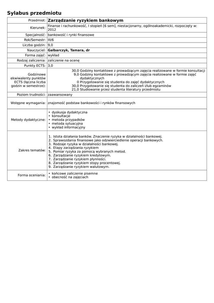 Sylabus przedmiotu Przedmiot: Zarządzanie ryzykiem bankowym Finanse i rachunkowość, I stopień [6 sem], niestacjonarny, ogólnoakademicki, rozpoczęty w: Kierunek: 2012 Specjalność: bankowość i rynki finansowe Rok/Semestr: III/6 Liczba godzin: 9,0 Nauczyciel: Galbarczyk, Tamara, dr Forma zajęć: wykład Rodzaj zaliczenia: zaliczenie na ocenę Punkty ECTS: 3,0 30,0 Godziny kontaktowe z prowadzącym zajęcia realizowane w formie konsultacji 9,0 Godziny kontaktowe z prowadzącym zajęcia realizowane w formie zajęć dydaktycznych 0 Przygotowanie się studenta do zajęć dydaktycznych 30,0 Przygotowanie się studenta do zaliczeń i/lub egzaminów 21,0 Studiowanie przez studenta literatury przedmiotu Godzinowe ekwiwalenty punktów ECTS (łączna liczba godzin w semestrze): Poziom trudności: zaawansowany Wstępne wymagania: znajomość podstaw bankowości i rynków finansowych • • Metody dydaktyczne: • • • 1. 2. 3. 4. Zakres tematów: 5. 6. 7. 8. 9. Forma oceniania: dyskusja dydaktyczna konsultacje metoda przypadków metoda sytuacyjna wykład informacyjny Istota działania banków. Znaczenie ryzyka w działalności bankowej. Sprawozdania finansowe jako odzwierciedlenie operacji bankowych. Rodzaje ryzyka w działalności bankowej. Etapy zarządzania ryzykiem Pomiar ryzyka za pomocą wybranych metod. Zarządzanie ryzykiem kredytowym. Zarządzanie ryzykiem płynności. Zarządzanie ryzykiem stopy procentowej. Zarządzanie ryzykiem walutowym. • końcowe zaliczenie pisemne • obecność na zajęciach Literatura podstawowa: 1. Galbarczyk T. , Świderska J., Bank komercyjny w Polsce. Podręcznik akademicki, Difin, Warszawa 2011 2. Iwanicz – Drozdowska M.: Zarządzanie sinansowe bankiem, PWE, Warszawa 2005 3. Kaczmarek T. T.: Ryzyko i zarządzanie ryzykiem. Ujęcie interdyscyplinarne, Difin, Warszawa 2005. 4. Koleśnik J.: Adekwatność kapitałowa banków, Difin, Warszawa 2014 5. Kopiński A.: Analiza finansowa banku, PWE, Warszawa 2008. 6. Proniewski M., Tarasiuk W.: Zarządzanie instytucjami kredytowymi. Strategie, modele biznesowe i operacyjne, CH Beck, Warszawa 2012 7. Rose P.S.: Zarządzanie bankiem komercyjnym; Związek Banków Polskich, Warszawa 1997. 8. Wiatr M. S.: Zarządzanie indywidualnym ryzykiem kredytowym. Elementy systemu, Wyd. SGH, Warszawa 2008 9. Zarządzanie instytucjami kredytowymi pod red. A. Gospodarowicza, A. Nosowskiego, CH Beck, Warszawa 2012 Literatura: 10. Zombirt J.: Nowa umowa kapitałowa. Ewolucja czy rewolucja?, CeDeWu, Warszawa 2007 11. Żółtkowski W.: Zarządzanie ryzykiem bankowym w praktyce, CeDeWu, Warszawa 2007 Literatura dodatkowa: 1. Baltrop Ch.J., McNaughton D.: Zarządzanie nowoczesnym bankiem w okresie zmian,Tom I; Key Text, Warszawa 1995. 2. Banki polskie u progu XXI wieku pod red. W. L. Jaworskiego; Poltext, Warszawa 1999. 3. Binkowski P., Beeck H.: Innowacje bankowe. Instrumenty terminowego rynku finansowego; Poltext, Warszawa 1998. 4. Grabczan W.: Rachunkowość menedżerska w zarządzaniu bankiem; Fundacja Rozwoju Rachunkowości w Polsce, Warszawa 1996. 5. Świderski J.: Finanse banku komercyjnego; Biblioteka Menedżera i Bankowca, Warszawa 1998. 6. Uyemura D.G., Van Deventer D.R.: Zarządzanie ryzykiem finansowym w bankach; Związek Banków Polskich, Warszawa 1997. 7. Wdowiak J.: Ryzyko stopy procentowej – luka; „Bankier” – miesięcznik Banku Pekao S.A., 1993, Nr 11. 8. Współczesny bank pod red. W. L. Jaworskiego; Poltext, Warszawa 1998. Kontakt: Dodatkowe informacje: • Instytut Ekonomii i Finansów - sekretariat, Rektorat UMCS, pok. 601, tel. (81) 5375175, [email protected] • Katedra Bankowości, Rektorat UMCS, pok. 706, tel. (81) 5375269 (w godzinach konsultacji), [email protected]