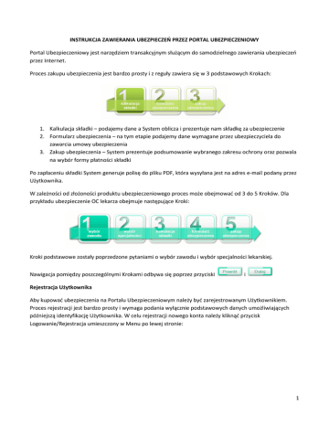 INSTRUKCJA ZAWIERANIA UBEZPIECZEŃ PRZEZ PORTAL UBEZPIECZENIOWY Portal Ubezpieczeniowy jest narzędziem transakcyjnym służącym do samodzielnego zawierania ubezpieczeo przez Internet. Proces zakupu ubezpieczenia jest bardzo prosty i z reguły zawiera się w 3 podstawowych Krokach: 1. Kalkulacja składki – podajemy dane a System oblicza i prezentuje nam składkę za ubezpieczenie 2. Formularz ubezpieczenia – na tym etapie podajemy dane wymagane przez ubezpieczyciela do zawarcia umowy ubezpieczenia 3. Zakup ubezpieczenia – System prezentuje podsumowanie wybranego zakresu ochrony oraz pozwala na wybór formy płatności składki Po zapłaceniu składki System generuje polisę do pliku PDF, która wysyłana jest na adres e-mail podany przez Użytkownika. W zależności od złożoności produktu ubezpieczeniowego proces może obejmowad od 3 do 5 Kroków. Dla przykładu ubezpieczenie OC lekarza obejmuje następujące Kroki: Kroki podstawowe zostały poprzedzone pytaniami o wybór zawodu i wybór specjalności lekarskiej. Nawigacja pomiędzy poszczególnymi Krokami odbywa się poprzez przyciski i Rejestracja Użytkownika Aby kupowad ubezpieczenia na Portalu Ubezpieczeniowym należy byd zarejestrowanym Użytkownikiem. Proces rejestracji jest bardzo prosty i wymaga podania wyłącznie podstawowych danych umożliwiających późniejszą identyfikację Użytkownika. W celu rejestracji nowego konta należy kliknąd przycisk Logowanie/Rejestracja umieszczony w Menu po lewej stronie: 1 Pojawi się wówczas ekran logowania i rejestracji Użytkownika, w którym należy wybrad opcję nie posiadam konta i chcę się zarejestrowad: Należy podad wymagane dane, określid hasło i kliknąd przycisk „Zatwierdź”. Od tej pory można kupowad wszelkie ubezpieczenia dostępne na Portalu. 2 Przy kolejnym wejściu do Portalu należy się zalogowad podając adres e-mail i hasło. Jeśli Użytkownik jest niezalogowany to przy próbie zakupu ubezpieczenia System wyświetli monit: Jeśli zapomnieliśmy hasło wówczas należy kliknąd na „Pobierz nowe hasło” a System prześle hasło na podany adres e-mail. 3 Jak kupić OC zawodowe lekarza? Portal ubezpieczeniowy umożliwia zakup ubezpieczenia OC zawodowego lekarza: zarówno obowiązkowego (wymaganego Ustawą)jak i dobrowolnego (nadwyżkowego, na wpadek gdyby ustawowy limit odpowiedzialności nie wystarczył na pokrycie roszczeo pacjenta). W celu zawarcia ubezpieczenia należy kliknąd na ikonę „ubezpiecz się”: Następnie kliknąd „OC zawodowa zawodów medycznych”: po czym wybrad profesję: Teraz klikamy Dodaj specjalnośd: po czym odpowiadamy na kolejne pytania systemu, i klikamy „Dodaj”: 4 Teraz możemy przejśd do kalkulacji składki, lub dodad kolejną specjalnośd jeżeli posiadamy więcej niż jedną. Jeśli wykonujemy tę samą specjalnośd w różnej formie, można dodadponownie tę samą specjalnośd i określid inną formę udzielania świadczeo. Liczba specjalności nie ma wpływu na składkę, lecz pozwala na lepsze dopasowanie oferty. Tabela poniżej przedstawia natomiast już dodane specjalności. Jeżeli dane w tabeli nie sa zgodne z rzeczywistością, możemy je usunąd i wprowadzid raz jeszcze, poprawnie: Aby przejśd do kalkulacji składki klikamy lub Wybieramy interesujący nas zakres ochrony (system oferuje tylko te ubezpieczenia, które nas dotyczą). Po wybraniu dodatkowo ubezpieczenia dobrowolnego System poprosi o określenie sumy gwarancyjnej (kwoty maksymalnego świadczenia) i liczby rat: 5 Po wybraniu sumy gwarancyjnej System zaprezentuje oferty: Jeśli cena nam odpowiada klikamy aby przejśd do formularza ubezpieczenia. Na formularzu ubezpieczenia określamy datę początku ochrony ubezpieczeniowej (powinien byd to dzieo następny po dniu kooca ubezpieczenia z dotychczasowej polisy) i podajemy wszystkie wymagane dane. Klikamy na przycisk . Jeśli zapomnieliśmy wypełnid któregoś obowiązkowego pola System oznaczy to pole czerwoną ramką i wyświetli komunikat: Jeśli wszystkie pola zostały poprawnie wypełnione pojawi się podsumowanie wybranego zakresu ochrony i wybór formy płatności składki: 6 Do wyboru mamy: Płatność internetową (forma preferowana) – wybierając ten wariant możemy zapłacid składkę kartą płatniczą lub szybkim przelewem internetowym; jeśli zależy nam, żeby od razu System wygenerował polisę należy wybrad właśnie ten wariant płatności składki Blankiet wpłat – wybierając ten sposób płatności możemy zapłacid składkę zwykłym przelewem lub przekazem pocztowym; należy zwrócid uwagę, że po wybraniu tej formy płatności System wygeneruje polisę dopiero po zaksięgowaniu wpłaty na koncie ubezpieczyciela (polisa zostanie wysłana do Użytkownika mailem), zazwyczaj polisa wystawiana jest na trzeci dzieo po zrealizowaniu przelewu – jeśli zależy nam, aby od razu otrzymad polisę należy wybrad płatnośd internetową Moje konto Po zalogowaniu każdy Użytkownik Systemu uzyskuje dostęp do zawartych przez siebie ubezpieczeo online. W menu po lewej stronie znajduje się zakładka „Moje Polisy”, gdzie znajduje się lista zawartych ubezpieczeo. W razie problemów W przypadku jakichkolwiek problemów z zawarciem ubezpieczenia lub wątpliwości dotyczących oferty ubezpieczeniowej nasze Biuro Obsługi Klienta jest do Paostwa dyspozycji: telefon : (22) 318 89 89 e-mail: [email protected] 7