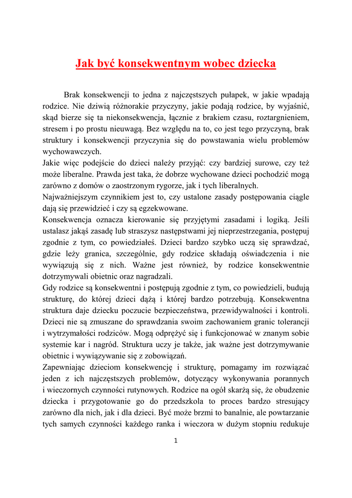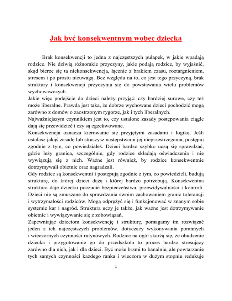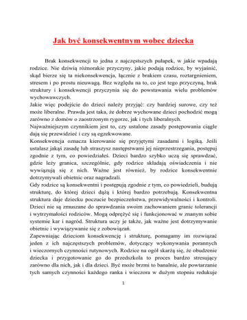 Jak być konsekwentnym wobec dziecka Brak konsekwencji to jedna z najczęstszych pułapek, w jakie wpadają rodzice. Nie dziwią różnorakie przyczyny, jakie podają rodzice, by wyjaśnić, skąd bierze się ta niekonsekwencja, łącznie z brakiem czasu, roztargnieniem, stresem i po prostu nieuwagą. Bez względu na to, co jest tego przyczyną, brak struktury i konsekwencji przyczynia się do powstawania wielu problemów wychowawczych. Jakie więc podejście do dzieci należy przyjąć: czy bardziej surowe, czy też może liberalne. Prawda jest taka, że dobrze wychowane dzieci pochodzić mogą zarówno z domów o zaostrzonym rygorze, jak i tych liberalnych. Najważniejszym czynnikiem jest to, czy ustalone zasady postępowania ciągle dają się przewidzieć i czy są egzekwowane. Konsekwencja oznacza kierowanie się przyjętymi zasadami i logiką. Jeśli ustalasz jakąś zasadę lub straszysz następstwami jej nieprzestrzegania, postępuj zgodnie z tym, co powiedziałeś. Dzieci bardzo szybko uczą się sprawdzać, gdzie leży granica, szczególnie, gdy rodzice składają oświadczenia i nie wywiązują się z nich. Ważne jest również, by rodzice konsekwentnie dotrzymywali obietnic oraz nagradzali. Gdy rodzice są konsekwentni i postępują zgodnie z tym, co powiedzieli, budują strukturę, do której dzieci dążą i której bardzo potrzebują. Konsekwentna struktura daje dziecku poczucie bezpieczeństwa, przewidywalności i kontroli. Dzieci nie są zmuszane do sprawdzania swoim zachowaniem granic tolerancji i wytrzymałości rodziców. Mogą odprężyć się i funkcjonować w znanym sobie systemie kar i nagród. Struktura uczy je także, jak ważne jest dotrzymywanie obietnic i wywiązywanie się z zobowiązań. Zapewniając dzieciom konsekwencję i strukturę, pomagamy im rozwiązać jeden z ich najczęstszych problemów, dotyczący wykonywania porannych i wieczornych czynności rutynowych. Rodzice na ogół skarżą się, że obudzenie dziecka i przygotowanie go do przedszkola to proces bardzo stresujący zarówno dla nich, jak i dla dzieci. Być może brzmi to banalnie, ale powtarzanie tych samych czynności każdego ranka i wieczora w dużym stopniu redukuje 1 stres, to znaczy kłótnie, przepychanki i podstępne przekupywanie dzieci, aby w końcu się one ubrały, najadły lub umyły. Struktura daje również komfortowe poczucie przewidywalności, które pomaga uchronić czynności rutynowe przed zamianą w walkę między rodzicem, a dzieckiem. Inna dziedzina, w której konsekwencja jest bardzo ważna, to stosowanie dyscypliny. Wielu rodziców złości się z powodu złego zachowania dzieci i szybko wyciąga z niego odpowiednie konsekwencje. Jednakże, być może pod wpływem złości, stosują oni zbyt surowe lub zbyt długotrwałe kary, które później trudno realizować. Rodzice powinni być również świadomi tego, jak ważne jest, by oboje byli zgodni co do zasad i konsekwencji zachowania oraz by wspólnie je stosowali. Często bardziej pomysłowe dzieci próbują „rozdzielić” swoich rodziców, nastawiając jednego przeciw drugiemu. Rodzice powinni omówić kwestie sporne pod nieobecność dzieci oraz ustalić takie zasady, które oboje będą akceptować. Stworzenie jednolitego frontu i konsekwencja, to dwie bardzo ważne rzeczy, ponieważ jeśli dzieci są przekonane, że zasady rodziców są niewzruszone i niezmiennie wprowadzane w życie, to zwykle nie sprawdzają granic wytrzymałości rodziców, by określić, jakie reguły obowiązują w tym tygodniu. W podobny sposób, jeśli konsekwentnie realizuje się kary, dzieci w mniejszym stopniu usiłują „wymigać się” od następstw złego zachowania. Konsekwencja stanowi bardzo ważną pomoc w rozwoju poczucia bezpieczeństwa i pewności siebie u dzieci, i to nie tylko w zakresie porządku i dyscypliny. Trudno przecenić wartość, jaką ma dla dziecka rodzic zawsze zainteresowany tym, co działo się danego dnia w przedszkolu. Regularne uczestniczenie w wydarzeniach sportowych lub uroczystościach przedszkolnych dużo mówi dziecku o tym, jaką ma ono wartość w oczach mamy lub taty. Konsekwentne przekazywanie dzieciom bezwarunkowej miłości dodaje im siły i redukuje zbędny lęk i niepewność. Pomimo tych oczywistych korzyści, trzymanie się konsekwencji może być jednym z największych wyzwań, jakie stoją przed rodzicami. Biorąc pod uwagę tempo naszego życia, utrzymanie porządku i przewidywalności może okazać się zadaniem zniechęcającym do podjęcia wysiłku. Proponujemy, by włożyć w swe działania uczciwy i szczery wysiłek. Jeśli raz 2 po raz zdarzy Ci się złamać wprowadzoną zasadę, nie bądź dla siebie zbyt surowy. W końcu ludziom zdarzają się błędy; to normalna i naturalna część życia. Jeśli robisz co w Twojej mocy, by być konsekwentnym, nie minie wiele czasu, a odkryjesz, że korzyści płynące z takiej postawy w pełni wynagradzają twój wysiłek. Rady dla rodziców: • Surowość czy liberalizm nie mają takiego znaczenia, jak stałe przestrzeganie zasad i konsekwencji. • Zawsze postępuj zgodnie z zasadami. • Daj jedno ostrzeżenie, a potem dopiero zastosuj odpowiednią karę. • Konsekwentne zasady dostarczają dzieciom struktury, która zaspokaja potrzebę bezpieczeństwa, przewidywalności i kontroli. • Konsekwentnie dbaj o poranne i wieczorne czynności rutynowe. • Stosuj krótkie i łatwe do zastosowania kary. • Nie wprowadzaj dyscypliny, kiedy jesteś zły. • Rodzice powinni prezentować zjednoczony front. • Stosuj dyscyplinę w odpowiednim czasie. • Wprowadzaj odpowiednie konsekwencje. • Dawanie dzieciom wyboru zwiększa ich poczucie kompetencji i kontroli. Stosuj dyscyplinę, by uczyć. • Celem stosowania dyscypliny nie jest udowodnienie, kto ma rację, a kto jej nie ma. Takie podejście sprzyja, bowiem konfliktom i budzi w dziecku poczucie wstydu. • Celem dyscypliny jest zmiana zachowania, które stwarza problemy. Wszystkim 