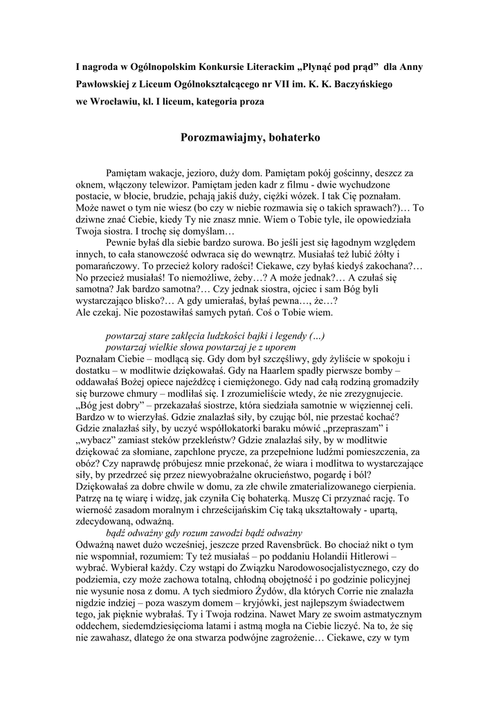 I nagroda w Ogólnopolskim Konkursie Literackim „Płynąć pod prąd” dla Anny Pawłowskiej z Liceum Ogólnokształcącego nr VII im. K. K. Baczyńskiego we Wrocławiu, kl. I liceum, kategoria proza Porozmawiajmy, bohaterko Pamiętam wakacje, jezioro, duży dom. Pamiętam pokój gościnny, deszcz za oknem, włączony telewizor. Pamiętam jeden kadr z filmu - dwie wychudzone postacie, w błocie, brudzie, pchają jakiś duży, ciężki wózek. I tak Cię poznałam. Może nawet o tym nie wiesz (bo czy w niebie rozmawia się o takich sprawach?)… To dziwne znać Ciebie, kiedy Ty nie znasz mnie. Wiem o Tobie tyle, ile opowiedziała Twoja siostra. I trochę się domyślam… Pewnie byłaś dla siebie bardzo surowa. Bo jeśli jest się łagodnym względem innych, to cała stanowczość odwraca się do wewnątrz. Musiałaś też lubić żółty i pomarańczowy. To przecież kolory radości! Ciekawe, czy byłaś kiedyś zakochana?… No przecież musiałaś! To niemożliwe, żeby…? A może jednak?… A czułaś się samotna? Jak bardzo samotna?… Czy jednak siostra, ojciec i sam Bóg byli wystarczająco blisko?… A gdy umierałaś, byłaś pewna…, że…? Ale czekaj. Nie pozostawiłaś samych pytań. Coś o Tobie wiem. powtarzaj stare zaklęcia ludzkości bajki i legendy (…) powtarzaj wielkie słowa powtarzaj je z uporem Poznałam Ciebie – modlącą się. Gdy dom był szczęśliwy, gdy żyliście w spokoju i dostatku – w modlitwie dziękowałaś. Gdy na Haarlem spadły pierwsze bomby – oddawałaś Bożej opiece najeźdźcę i ciemiężonego. Gdy nad całą rodziną gromadziły się burzowe chmury – modliłaś się. I zrozumieliście wtedy, że nie zrezygnujecie. „Bóg jest dobry” – przekazałaś siostrze, która siedziała samotnie w więziennej celi. Bardzo w to wierzyłaś. Gdzie znalazłaś siły, by czując ból, nie przestać kochać? Gdzie znalazłaś siły, by uczyć współlokatorki baraku mówić „przepraszam” i „wybacz” zamiast steków przekleństw? Gdzie znalazłaś siły, by w modlitwie dziękować za słomiane, zapchlone prycze, za przepełnione ludźmi pomieszczenia, za obóz? Czy naprawdę próbujesz mnie przekonać, że wiara i modlitwa to wystarczające siły, by przedrzeć się przez niewyobrażalne okrucieństwo, pogardę i ból? Dziękowałaś za dobre chwile w domu, za złe chwile zmaterializowanego cierpienia. Patrzę na tę wiarę i widzę, jak czyniła Cię bohaterką. Muszę Ci przyznać rację. To wierność zasadom moralnym i chrześcijańskim Cię taką ukształtowały - upartą, zdecydowaną, odważną. bądź odważny gdy rozum zawodzi bądź odważny Odważną nawet dużo wcześniej, jeszcze przed Ravensbrück. Bo chociaż nikt o tym nie wspomniał, rozumiem: Ty też musiałaś – po poddaniu Holandii Hitlerowi – wybrać. Wybierał każdy. Czy wstąpi do Związku Narodowosocjalistycznego, czy do podziemia, czy może zachowa totalną, chłodną obojętność i po godzinie policyjnej nie wysunie nosa z domu. A tych siedmioro Żydów, dla których Corrie nie znalazła nigdzie indziej – poza waszym domem – kryjówki, jest najlepszym świadectwem tego, jak pięknie wybrałaś. Ty i Twoja rodzina. Nawet Mary ze swoim astmatycznym oddechem, siedemdziesięcioma latami i astmą mogła na Ciebie liczyć. Na to, że się nie zawahasz, dlatego że ona stwarza podwójne zagrożenie… Ciekawe, czy w tym wszystkim się bałaś? Czy wyglądając za okno albo raczej – zakrywając je szybko firankami, by nie mieli do was wstępu wścibscy i zdradzieccy (a jak wcześniej lubiani) sąsiedzi – czy wtedy drżałaś? Czy czekając w więziennej celi na to, co będzie dalej, zaciskałaś wargi, by nie zdradzić własnych obaw? A spędzając ostatnie dni w obozowym, cuchnącym szpitalu…? Tak, byłaś odważna. Twoje decyzje zawstydzały zdrajców i dręczycieli. Ale to przecież nie wyklucza obaw w Twoim życiu… Nie wstydź się: to nie lęki czynią nas klęczącymi, ale decyzje nimi wywołane… strzeż się jednak dumy niepotrzebnej oglądaj w lustrze swą błazeńską twarz powtarzaj: zostałem powołany – czyż nie było lepszych Zaskoczyłaś mnie. Zaskoczyłaś mnie tą historią z witaminami. Corrie uratowała tamtą buteleczkę specjalnie dla Ciebie. Wiem – gdybyś mogła, dałabyś witamin wszystkim trzydziestu pięciu tysiącom więźniarkom. Ale nie mogłaś! Zachowaj je dla siebie, Betsie, zachowaj! Wiem, jak bardzo kochasz te kobiety wokół, ale zachowaj!… Dla własnego dobra. Nie wyrzekaj się znowu samej siebie. Po prostu, z czystym sercem, z troską o innych, nie rozdawaj tych nieszczęsnych witamin. Zawsze taka byłaś. Pracowita, cicha. Przez Ciebie tracę obiektywność. Bohaterstwo dnia codziennego – gościnność, uprzejmość, przygotowywanie posiłków, sprzątanie, cerowanie do późnej nocy, pomoc ojcu w sklepie – rozbrajają moją próbę wykrycia Twojej gorszej, ciemniejszej strony. A miałaś czas dla siebie? Żeby zadbać o własne marzenia?… Chyba nie miałaś takich, które nie łączyły się z czynieniem dobra wobec innych. Pomyśleć o własnej przyszłości?… Twoje życie to zawsze – dom, opieka, troska. Spotkać się z przyjaciółmi?… Najbliższymi uczyniłaś sobie rodzinę. O tym, jak ich kochałaś, opowiedziałaś własnym postępowaniem. Zadbać o wygląd? Byłaś schludna i uczyłaś schludności siostrę. Byłaś taka inna od nas, ludzi żyjących kilkadziesiąt lat później. Rezygnujemy z najbliższych, by osiągnąć sukces, zostawiamy rodzinę samą sobie, by zdobyć szczyty w pracy, patrzymy w lustro, widząc z przerażeniem zmarszczki, jakby przerażały bardziej niż krzyczący z głębi oczu egoizm. A przecież uczysz mnie, że bohaterowie nie mogą pochylać się nad własnym „ja”, wzdychać nad osobistym nieszczęściem, przyglądać się własnej twarzy, jakby była tylko odbiciem sukcesu bądź porażki. strzeż się oschłości serca kochaj… Zaskakujesz mnie 