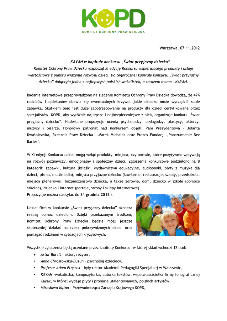 Warszawa, 07.11.2012 KAYAH w kapitule konkursu „Świat przyjazny dziecku” Komitet Ochrony Praw Dziecka rozpoczął XI edycję Konkursu wspierającego produkty i usługi wartościowe z punktu widzenia rozwoju dzieci. Do tegorocznej kapituły konkursu „Świat przyjazny dziecku” dołączyła jedna z najlepszych polskich wokalistek, a zarazem mama - KAYAH. Badania internetowe przeprowadzone na zlecenie Komitetu Ochrony Praw Dziecka dowodzą, że 47% rodziców i opiekunów obawia się ewentualnych krzywd, jakie dziecko może wyrządzić sobie zabawką. Skutkiem tego jest duże zapotrzebowanie na produkty dla dzieci certyfikowane przez specjalistów. KOPD, aby wyróżnić najlepsze i najbezpieczniejsze z nich, organizuje konkurs „Świat przyjazny dziecku”. Nadesłane propozycje ocenią psycholodzy, pedagodzy, plastycy, aktorzy, muzycy i pisarze. Honorowy patronat nad Konkursem objęli: Pani Prezydentowa – Jolanta Kwaśniewska, Rzecznik Praw Dziecka – Marek Michalak oraz Prezes Fundacji „Porozumienie Bez Barier”. W XI edycji Konkursu udział mogą wziąć produkty, miejsca, czy portale, które pozytywnie wpływają na rozwój poznawczy, emocjonalny i społeczny dzieci. Zgłoszenia konkursowe podzielono na 8 kategorii: zabawki, kultura (książki, wydawnictwa edukacyjne, audiobooki, płyty z muzyką dla dzieci, pisma, multimedia), miejsca przyjazne dziecku (kawiarnie, restauracje, szkoły, przedszkola, miejsca plenerowe), bezpieczeństwo dziecka, a także zdrowie, dom, dziecko w szkole (pomoce szkolne), dziecko i Internet (portale, strony i sklepy internetowe). Propozycje można nadsyłać do 31 grudnia 2012 r. Udział firm w konkursie „Świat przyjazny dziecku” oznacza realną pomoc dzieciom. Dzięki przekazanym środkom, Komitet Ochrony Praw Dziecka będzie mógł jeszcze skuteczniej działać na rzecz pokrzywdzonych dzieci oraz pomagać rodzinom w sytuacjach kryzysowych. Wszystkie zgłoszenia będą oceniane przez kapitułę Konkursu, w której skład wchodzi 12 osób: Artur Barciś – aktor, reżyser, • Anna Chrostowska-Buzun – psycholog dziecięcy, • Profesor Adam Frączek – były rektor Akademii Pedagogiki Specjalnej w Warszawie, • KAYAH -wokalistka, kompozytorka, autorka tekstów, współwłaścicielka firmy fonograficznej Kayax, w której wydaje płyty i promuje utalentowanych, polskich artystów, • Mirosława Kątna – Przewodnicząca Zarządu Krajowego KOPD, • Magdalena Kordaszewska – twórca portalu zabawkowicz.pl, • Magdalena Łazarkiewicz – reżyser filmowy, teatralny, telewizyjny, scenarzysta, • Robert Myśliński – autor bajek „Siedem Supełków”. Wspólnie z żoną, Dorotą Zawadzką, pisze książki i organizuje spotkania oraz wykłady, • Magdalena Stachowiak – pedagog i Szef Zespołu PR i Pozyskiwania Środków KOPD, • Profesor Mieczysław Wasilewski – wykładowca ASP • Anna Wakulak – redaktor naczelna „Świata Zabawek”, • Dorota Zawadzka – psycholog rozwojowy, telewizyjna „Superniania”. Więcej informacji oraz regulamin Konkursu i ankietę znaleźć można na stronie: http://www.kopd.pl/wyniki/. Oficjalne ogłoszenie wyników nastąpi w maju 2013 roku. Kontakt dla mediów: Magdalena Stachowiak, Pedagog, Szef Zespołu PR i Pozyskiwania Środków, Członek Zarządu Krajowego Komitetu Ochrony Praw Dziecka, e-mail: [email protected], tel. 505 045 679 Paulina Gadomska-Dzięcioł, Effective Public Relations, e-mail: [email protected] tel. (22) 822 07 52 Dodatkowych informacji o konkursie udziela: Karolina Wojcieszak, Koordynator Projektu, Zespół PR i Pozyskiwania Środków Komitetu Ochrony Praw Dziecka, e-mail: [email protected] tel. 22 626 94 21, 504 190 740 Informacje o Komitecie Ochrony Praw Dziecka Komitet Ochrony Praw Dziecka jest ogólnopolską organizacją pożytku publicznego, która zajmuje się ochroną praw i interesów dzieci oraz ich rodzin. Od 1981 roku misją Komitetu jest przeciwdziałanie i zapobieganie wszelkim przejawom krzywdzenia dzieci oraz pomoc rodzinom w sytuacjach kryzysowych. Swoją misję KOPD realizuje poprzez Centrum Interwencyjne w Warszawie oraz 23 oddziały terenowe w całej Polsce. Komitet Ochrony Praw Dziecka jako organizacja pozarządowa świadczy pomoc psychologiczną, pedagogiczną, diagnostyczną, psychoterapeutyczną, mediacyjną i prawną, szukając najwłaściwszej formy pomocy dla dziecka i jego rodziny. Więcej informacji na temat działalności KOPD można znaleźć na stronie internetowej pod adresem www.kopd.pl