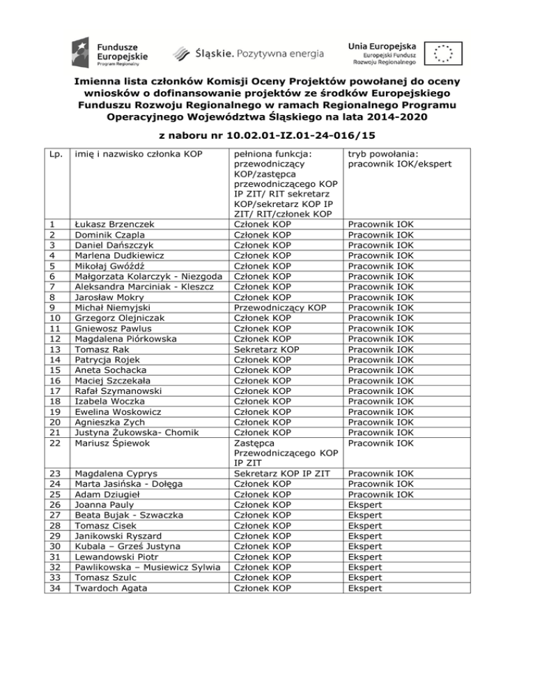 Imienna lista członków Komisji Oceny Projektów powołanej do oceny wniosków o dofinansowanie projektów ze środków Europejskiego Funduszu Rozwoju Regionalnego w ramach Regionalnego Programu Operacyjnego Województwa Śląskiego na lata 2014-2020 z naboru nr 10.02.01-IZ.01-24-016/15 Lp. imię i nazwisko członka KOP 1 2 3 4 5 6 7 8 9 10 11 12 13 14 15 16 17 18 19 20 21 22 Łukasz Brzenczek Dominik Czapla Daniel Dańszczyk Marlena Dudkiewicz Mikołaj Gwóźdź Małgorzata Kolarczyk - Niezgoda Aleksandra Marciniak - Kleszcz Jarosław Mokry Michał Niemyjski Grzegorz Olejniczak Gniewosz Pawlus Magdalena Piórkowska Tomasz Rak Patrycja Rojek Aneta Sochacka Maciej Szczekała Rafał Szymanowski Izabela Woczka Ewelina Woskowicz Agnieszka Zych Justyna Żukowska- Chomik Mariusz Śpiewok 23 24 25 26 27 28 29 30 31 32 33 34 Magdalena Cyprys Marta Jasińska - Dołęga Adam Dziugieł Joanna Pauly Beata Bujak - Szwaczka Tomasz Cisek Janikowski Ryszard Kubala – Grześ Justyna Lewandowski Piotr Pawlikowska – Musiewicz Sylwia Tomasz Szulc Twardoch Agata pełniona funkcja: przewodniczący KOP/zastępca przewodniczącego KOP IP ZIT/ RIT sekretarz KOP/sekretarz KOP IP ZIT/ RIT/członek KOP Członek KOP Członek KOP Członek KOP Członek KOP Członek KOP Członek KOP Członek KOP Członek KOP Przewodniczący KOP Członek KOP Członek KOP Członek KOP Sekretarz KOP Członek KOP Członek KOP Członek KOP Członek KOP Członek KOP Członek KOP Członek KOP Członek KOP Zastępca Przewodniczącego KOP IP ZIT Sekretarz KOP IP ZIT Członek KOP Członek KOP Członek KOP Członek KOP Członek KOP Członek KOP Członek KOP Członek KOP Członek KOP Członek KOP Członek KOP tryb powołania: pracownik IOK/ekspert Pracownik Pracownik Pracownik Pracownik Pracownik Pracownik Pracownik Pracownik Pracownik Pracownik Pracownik Pracownik Pracownik Pracownik Pracownik Pracownik Pracownik Pracownik Pracownik Pracownik Pracownik Pracownik IOK IOK IOK IOK IOK IOK IOK IOK IOK IOK IOK IOK IOK IOK IOK IOK IOK IOK IOK IOK IOK IOK Pracownik IOK Pracownik IOK Pracownik IOK Ekspert Ekspert Ekspert Ekspert Ekspert Ekspert Ekspert Ekspert Ekspert