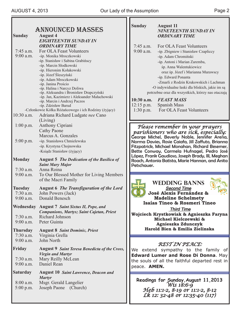 AUGUST 4, 2013 Sunday 7:45 a.m. 9:00 a.m. ANNOUNCED MASSES August 4 EIGHTEENTH SUNDAY IN ORDINARY TIME For OLA Feast Volunteers -śp. Monika Mroczkowski -śp. Stanisław i Sabina Grabińscy -śp. Marcin Słodkowski -śp. Hieronim Kołakowski -śp. Józef Śleszyński -śp. Adam Mroczkowski -śp. Janina Prościo -śp. Halina i Narcyz Doliwa -śp. Aleksandra i Bronisław Drapczyński -śp. Jan, Kazimierz i Aleksander Małachowski -śp. Marcin i Andrzej Paczos -śp. Zdzisław Barud -Członkowie Kółka Różańcowego i ich Rodziny (żyjący) 10:30 a.m. 1:00 p.m. 5:00 p.m. Monday 7:30 a.m. 9:00 a.m. Tuesday 7:30 a.m. 9:00 a.m. Adriana Richard Ludgate nee Cano (Living) Anthony Cipriani Cathy Paone Marcus A. Gonzales -śp. Stanisława Chmielewska -śp. Krystyna Chojnowska -Ksiądz Stanisław (żyjący) August 5 The Dedication of the Basilica of Saint Mary Major Anna Roina To Our Blessed Mother for Living Members of the Macri Family August 6 The Transfiguration of the Lord John Powers (Jack) Donald Benesch Wednesday August 7 Saint Sixtus II, Pope, and 7:30 a.m. 9:00 a.m. Thursday 7:30 a.m. 9:00 a.m. Friday 7:30 a.m. 9:00 a.m. Saturday 8:00 a.m. 5:00 p.m. Companions, Martys; Saint Cajetan, Priest Richard Johnson Peter Guinta August 8 Saint Dominic, Priest Virginia Grella John North August 9 Saint Teresa Benedicta of the Cross, Virgin and Martyr Mary Reilly McLean Daniel Rean August 10 Saint Lawrence, Deacon and Martyr Msgr. Gerald Langelier Joseph Paone (Church) Page 2 Our Lady of the Assumption Sunday 7:45 a.m. 9:00 a.m. August 11 NINETEENTH SUNDAY IN ORDINARY TIME For OLA Feast Volunteers -śp. Zbigniew i Stanisław Czapliccy -śp. Adam Chromiński -śp. Antoni i Marian Zaremba, śp. Anna Walentukiewicz oraz śp. Józef i Marianna Murawscy -śp. Edward Ponanta -Zmarli z Rodzin Krukowskich i Lachman -O indywidualne łaski dla bliskich, jakie im są potrzebne oraz dla wszystkich, którzy nas otaczają 10:30 a.m. 12:15 p.m. 1:30 p.m. FEAST MASS Spanish Mass For OLA Feast Volunteers Please remember in your prayers parishioners who are sick, especially: George Michel, Beverly Noble, Jennifer Arena, Norma Davies, Rosie Caiafa, Jill Zaffuto, Brianna Fitzpatrick, Michael Monahan, Richard Besemer, Bette Conway, Carmela Hufnagel, Pedro José López, Frank Gaudioso, Joseph Brady, III, Meghan Roach, Antonia Batista, Marie Hannan, and Anita Petschauer. WEDDING BANNS José Alexis Fernández & Madeline Schelmety Isaías Tineo & Rosmeri Tineo Second Time Third Time Wojciech Krystkowiak & Agnieszka Faryna Michael Kielczewski & Agnieszka Zdunczyk Harold Bien & Emilia Zielinska REST IN PEACE: We extend sympathy to the family of Edward Lumer and Rose Di Donna. May the souls of all the faithful departed rest in peace. AMEN. Readings for Sunday,August 11,2013 Wis 18:6-9 Heb 11:1-2, 8-19 or 11:1-2, 8-12 Lk 12: 32-48 or 12:35-40 (117) AUGUST 4, 2013 Page 3 Our Lady of the Assumption OUR LADY OF THE ASSUMPTION ANNUAL FEAST AUGUST 7-11 , 2013 FEAST MASS AT 10:30AM (Auditorium) Procession to the Shrine will follow SUNDAY, AUGUST 11TH COME JOIN THE FUN Chances $2,500, $1,000 and $250 Drawing on Sunday 50/50 Drawing every night RAFFLE TICKETS $5,000 (Drawing on Saturday) $10,000 (Drawing on Sunday) ENTERTAINMENT NIGHTLY WEDNESDAY-THE CHICLETTES THURSDAY-ARCADIA FRIDAY- ZUCCHERO SATURDAY-SEKRET SUNDAY AFTERNOON LOS MENSAJEROS DE JESUS RENACER EN CRISTO SUNDAY NIGHT STAGES INTERNATIONAL FOODS – GREAT DESSERTS NEWTON SHOWS - RIDES FOR THE KIDDIES AUGUST 4, 2013 Our Lady of the Assumption Registration for the 2013-2014 School Year Page 4 We are preparing for the 2013-2014 Religious Education school year and the registration process is already underway. At this time, you should be aware of the following: • Classes for the upcoming year will begin on Tuesday, October 1, 2013. • Religious Ed registration (and re-registration) will be conducted onTuesdays, Wednesdays, and Thursdays from July 16 through September 19. Hours for August (13th to 29th) will be Tuesdays, Wednesdays, and Thursdays, from 2:00PM to 7:00PM. September hours will be announced at Mass and published in the Church Bulletin. • All registration (and re-registration) must be done in person. You will complete a standard form for our records. There will be NO registration by mail this year. • If you are NOT a member of this parish, you must bring proof of membership at another parish; this is usually in the form of a church offering envelope, which has your name and number printed on it. • Registration Tuition Fee: Individual (1 child) $120 Family (2 or more children) $150 • Fees must be paid by check or in cash when you come in to register. There will be no refund of the fees once classes have begun. If you are registering for the first time: * Please bring your child’s Baptismal Certificate so we can make a copy for our records. This is necessary even if your child was baptized at OLA. (If your child has never been baptized, please bring the Birth Certificate.) * If your child has already received First Communion, please bring the First Communion Certificate (or other documentation) showing this. If you have any questions, call us at 842–3545. Thank you for your cooperation! Lou Mocci, Director of Religious Education Our Lady of the Assumption Parish Renovation Campaign “Our Parish . . . Our Future” Total Pledged: $ 490,143 Paid to Date: $ 210,580 # of Gifts: 372 % of Goal: 89% Campaign Goal: $550,000 Needed to Reach Goal: $ 59,857 Thank you for your support! MASS SCHEDULE Sunday, August 11, 2013 7:45AM English - Church 9:00AM Polish - Auditorium 10:30AM All Languages - Aud. 12:15PM Spanish - Auditorium 1:30PM English - Church Procession to the Shrine will follow the 10:30AM Mass Novena to Our Lady of the Assumption August 6th-9th, and 12th-15th After 9:00AM Mass SACRIFICIAL GIVING Parish Financial Summary Week of July 28, 2013 Weekly Budget $ 10,000.00 Collection $ 10,815.00 +/- $10,000 +$ 815 .00 Year to date +$ 14,881.00 Mass Attendance 21