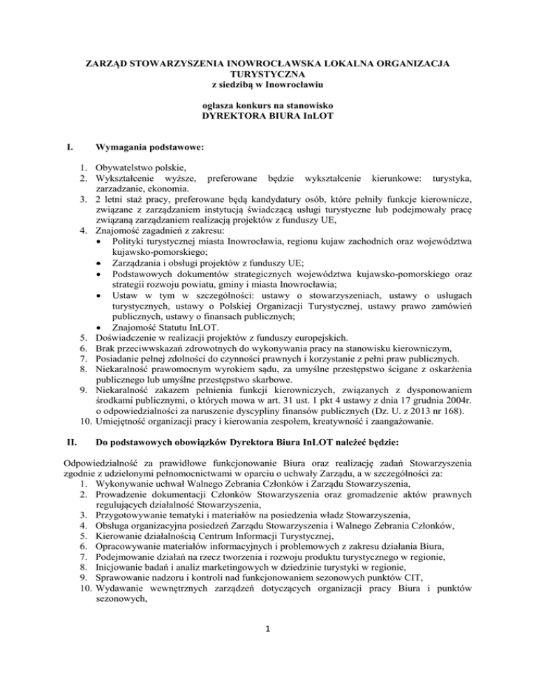 ZARZĄD STOWARZYSZENIA INOWROCŁAWSKA LOKALNA ORGANIZACJA TURYSTYCZNA z siedzibą w Inowrocławiu ogłasza konkurs na stanowisko DYREKTORA BIURA InLOT I. Wymagania podstawowe: 1. Obywatelstwo polskie, 2. Wykształcenie wyższe, preferowane będzie wykształcenie kierunkowe: turystyka, zarzadzanie, ekonomia. 3. 2 letni staż pracy, preferowane będą kandydatury osób, które pełniły funkcje kierownicze, związane z zarządzaniem instytucją świadczącą usługi turystyczne lub podejmowały pracę związaną zarządzaniem realizacją projektów z funduszy UE, 4. Znajomość zagadnień z zakresu: Polityki turystycznej miasta Inowrocławia, regionu kujaw zachodnich oraz województwa kujawsko-pomorskiego; Zarządzania i obsługi projektów z funduszy UE; Podstawowych dokumentów strategicznych województwa kujawsko-pomorskiego oraz strategii rozwoju powiatu, gminy i miasta Inowrocławia; Ustaw w tym w szczególności: ustawy o stowarzyszeniach, ustawy o usługach turystycznych, ustawy o Polskiej Organizacji Turystycznej, ustawy prawo zamówień publicznych, ustawy o finansach publicznych; Znajomość Statutu InLOT. 5. Doświadczenie w realizacji projektów z funduszy europejskich. 6. Brak przeciwwskazań zdrowotnych do wykonywania pracy na stanowisku kierowniczym, 7. Posiadanie pełnej zdolności do czynności prawnych i korzystanie z pełni praw publicznych. 8. Niekaralność prawomocnym wyrokiem sądu, za umyślne przestępstwo ścigane z oskarżenia publicznego lub umyślne przestępstwo skarbowe. 9. Niekaralność zakazem pełnienia funkcji kierowniczych, związanych z dysponowaniem środkami publicznymi, o których mowa w art. 31 ust. 1 pkt 4 ustawy z dnia 17 grudnia 2004r. o odpowiedzialności za naruszenie dyscypliny finansów publicznych (Dz. U. z 2013 nr 168). 10. Umiejętność organizacji pracy i kierowania zespołem, kreatywność i zaangażowanie. II. Do podstawowych obowiązków Dyrektora Biura InLOT należeć będzie: Odpowiedzialność za prawidłowe funkcjonowanie Biura oraz realizację zadań Stowarzyszenia zgodnie z udzielonymi pełnomocnictwami w oparciu o uchwały Zarządu, a w szczególności za: 1. Wykonywanie uchwał Walnego Zebrania Członków i Zarządu Stowarzyszenia, 2. Prowadzenie dokumentacji Członków Stowarzyszenia oraz gromadzenie aktów prawnych regulujących działalność Stowarzyszenia, 3. Przygotowywanie tematyki i materiałów na posiedzenia władz Stowarzyszenia, 4. Obsługa organizacyjna posiedzeń Zarządu Stowarzyszenia i Walnego Zebrania Członków, 5. Kierowanie działalnością Centrum Informacji Turystycznej, 6. Opracowywanie materiałów informacyjnych i problemowych z zakresu działania Biura, 7. Podejmowanie działań na rzecz tworzenia i rozwoju produktu turystycznego w regionie, 8. Inicjowanie badań i analiz marketingowych w dziedzinie turystyki w regionie, 9. Sprawowanie nadzoru i kontroli nad funkcjonowaniem sezonowych punktów CIT, 10. Wydawanie wewnętrznych zarządzeń dotyczących organizacji pracy Biura i punktów sezonowych, 1 11. Ustalanie wewnętrznej organizacji pracy Biura, podziału bieżących zadań i obowiązków pracowników Biura, 12. Koordynowanie działań InLOT w regionie, 13. Opracowywanie projektów rocznych planów pracy i planów ekonomiczno-finansowych Biura do zatwierdzenia przez Zarząd Stowarzyszenia, 14. Opracowywanie szczegółowych planów i budżetów dla podejmowanych akcji, przedsięwzięć i prezentacji marketingowych promujących region, 15. Pozyskiwanie środków pomocowych, dotacji budżetowych, dotacji z jednostek samorządu terenowego, z funduszy unijnych itp. na realizację zadań Stowarzyszenia, 16. Organizowanie szkoleń z zakresu doskonalenia kadr dla potrzeb turystyki w regionie, 17. Opracowywanie i przedkładanie władzom Stowarzyszenia wniosków w sprawach zastrzeżonych do ich decyzji, 18. Utrzymywanie stałego kontaktu z członkami wspierającymi i honorowymi Stowarzyszenia, 19. Wykonywanie zaleceń pokontrolnych wydanych przez uprawnione organy kontrolne w odniesieniu do całokształtu działalności Biura InLOT, 20. Realizowanie innych zadań zleconych dodatkowo przez Prezesa Zarządu lub Zarząd. III. Kandydaci przystępujący do konkursu, zobowiązani są przedłożyć następujące dokumenty: 1. Uzasadnienie przystąpienia do konkursu oraz koncepcję funkcjonowania i rozwoju Biura Stowarzyszenia, uwzględniające możliwości realizacji działań/projektów/programów wypełniających cele statutowe InLOT, w oparciu o różnorodne fundusze krajowe i europejskie. Dokument należy przedstawić w wersji papierowej, jako załącznik do składanej oferty, 2. Poświadczonej przez kandydata za zgodność z oryginałem, kopii dowodu osobistego lub innego dokumentu potwierdzającego tożsamość oraz poświadczającego obywatelstwo kandydata, 3. Poświadczone przez kandydata za zgodność z oryginałem, kopie dokumentów potwierdzających wykształcenie i posiadane kwalifikacje oraz ukończone kursy i szkolenia, 4. Życiorys (CV) z opisem przebiegu pracy zawodowej, zawierający w szczególności informacje o: stażu pracy na stanowisku kierowniczym oraz zrealizowanych projektach z funduszy europejskich wraz z krótkim opisem charakteru i zakresu projektu, wskazaniem funkcji, jaką kandydat odgrywał przy realizacji każdego z nich oraz instytucji/firmy, w której realizowany był projekt. 5. Poświadczone przez kandydata za zgodność z oryginałem kopie dokumentów potwierdzających posiadanie wymaganego stażu pracy, 6. Zaświadczenie lekarskie o braku przeciwwskazań zdrowotnych do wykonywania pracy na stanowisku kierowniczym, 7. Oświadczenie, że przeciwko kandydatowi nie toczy się postępowanie karne, postępowanie o przestępstwo ścigane z oskarżenia publicznego lub postępowanie dyscyplinarne, 8. Oświadczenie, że kandydat nie był skazany prawomocnym wyrokiem za umyślne przestępstwo lub umyślne przestępstwo skarbowe, 9. Oświadczenia, że kandydat nie był karany zakazem pe