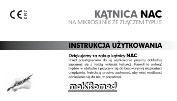 KĄTNICA NAC NA MIKROSILNIK ZE ZŁĄCZEM TYPU E INSTRUKCJA UŻYTKOWANIA Dziękujemy za zakup kątnicy NAC Przed przystąpieniem do jej użytkowania prosimy dokładnie zapoznać się z treścią niniejszej instrukcji. Pozwoli to uniknąć błędów w obsłudze i przyczyni się do bezawaryjnej eksploatacji urządzenia. Instrukcję prosimy zachować, aby mieć możliwość odniesienia się do niej w przyszłości. Do konstrukcji i wytwarzania tego urządzenia ma zastosowanie Dyrektywa UE 93/42/EEC. “łapka“mechanizmu zatrzaskowego korpus Widok KĄTNICY NAC - Typ NAC-E. Nr rozdziału i czego dotyczy Uwagi ogólne 1. Zakładanie wiertła 2. Smarowanie 3. Czyszczenie i Sterylizacja KARTA GWARANCYJNA Strona 2 3 4 5 6-8 Z tekstem w INSTRUKCJI UŻYTKOWANIA wyróżnionym w ten sposób proszę zapoznać się szczególnie uważnie. 1 Uwagi ogólne 2 1. Należy koniecznie poinformować serwis o wszelkich objawach nienormalnej pracy kątnicy. 2. Nie należy kontynuować pracy przed usunięciem stwierdzonej wady lub usterki. 3. W trakcie pracy mikrosilnika, kątnicy nie należy z niego ani zdejmować ani zakładać. 4. Kątnicy nie należy naprawiać, demontować i przerabiać w zakresie własnym. Działania takie są jednoznaczne z utratą praw gwarancyjnych. 5. Należy dbać, aby kątnica nie upadła na twarde podłoże, może to spowodować uszkodzenie główki kątnicy i utratę gwarancji na uszkodzone w ten sposób elementy. 6. Zaleca się uruchomić kątnicę na kilka sekund przed rozpoczęciem pracy. W tym czasie należy zwrócić uwagę czy kątnica pracuje prawidłowo, czy nie występuje nietypowa wibracja wiertła, nadmierny hałas lub przegrzewanie się główki kątnicy. 7. W trakcie pracy unikać przypadkowego naciśnięcia przycisku, przeznaczonego do montowania wierteł, może to spowodować wypadnięcie wiertła. 8. Nie należy używać wierteł uszkodzonych, zdeformowanych lub wygiętych. 9. Nie pracować prostnicą z prędkością obrotową większą niż 30.000 obr./min. 1. Zakładanie wiertła - Kątnicę załóż na mikrosilnik posiadający złącze typu E. Następnie odsuń “łapkę” mechanizmu zatrzaskowego i wsuń wiertło do główki kątnicy. - Lekko obracaj wiertłem do momentu aż natrafisz na miejsce w którym wiertło zagłębi się dalej. Aby unieruchomić wiertło w mechaniźmie zatrzaskowym, przesuń “łapkę” do poprzedniej pozycji. Nie przesuwaj “łapki” podczas pracy kątnicy i unikaj jej przypadkowego przesunięcia, gdyż może to spowodować poluzowanie i wypadnięcie wiertła. 3 2. Smarowanie - W celu przeprowadzenia smarowania, na dyszę pojemnika z olejem w aerozolu nakręć specjalną tulejkę (dostarczoną w komplecie z olejem Pana Spray). - Następnie wsuń tulejkę do oporu w otwór korpusu kątnicy i przez około 2 sekundy aplikuj olej (Rys. 1) 4 tulejka korpus Rys. 1 olej Pojemnik z olejem trzymaj w pozycji pionowej. W trakcie smarowania, kątnicę trzymaj mocno i pewnie, gdyż ciśnienie oleju może spowodować wysunięcie się końcówki z dłoni. Do smarowania stosuj tylko olej produkowany przez NSK (np. Pana Spray). Smarowanie kątnicy należy wykonać przynajmniej raz dziennie, a przy intensywnym korzystaniu z kątnicy, smarowanie należy wykonać kilka razy dziennie. Należy smarować kątnicę przed sterylizacją w autoklawie. 3. Czyszczenie i sterylizacja - Czyszczenie - Po dokladnym usunięciu zanieczyszczeń z korpusu kątnicy, przemyj ją miękką szmatką nasączoną alkoholem. - Sterylizacja - Odłącz kątnicę od mikrosilnika i wykonaj smarowanie opisane w rozdziale 2. - Umieść katnicę w torebce do sterylizacji. - Sterylizuj 20 minut w temp. 121oC lub 15 minut w temp.132oC. Pomiń cykl suszenia, jeśli temperatura w komorze sterylizatora przekroczy 135oC. Element grzejny autoklawu może znajdować się na dole komory sterylizacyjnej i temperatura może lokalnie przekroczyć nastawioną wartość. Kątnicę umieść zatem w centralnej lub górnej części komory sterylizacyjnej. 5 KARTA GWARANCYJNA PRODUCENT: NAKANISHI INC AUTORYZOWANY DYSTRYBUTOR 92-216 ŁÓDŹ, UL. CZECHOSŁOWACKA 1 tel./fax: 42 678 88 54, 42 678 74 80 mail: [email protected] www.makromed.com.pl 6 Na stronie 7 W ORYGINALNEJ INSTRUKCJI UŻYTKOWANIA ZAMIESZCZONA JEST KARTA GWARANCYJNA 7 Warunki gwarancji: 1. Nabywcy udziela się gwarancji na okres 12 miesięcy od daty sprzedaży. 2. Gwarant zapewnia dobrą jakość i poprawne działanie sprzętu pod warunkiem użytkowania go zgodnie z przeznaczeniem i zaleceniami zawartymi w instrukcji użytkowania. 3. Ujawnione w okresie gwarancji wady będą usuwane bezpłatnie przez Gwaranta lub inną wskazaną firmę w terminie do14 dni od daty zgłoszenia. 4. Nabywca ponosi ryzyko utraty lub uszkodzenia sprzętu w czasie transportu do i z miejsca serwisu. 5. Nabywca traci gwarancję w przypadku użytkowania: - niezgodnego z instrukcją użytkowania lub konserwacji; - dokonania przeróbek, napraw i zmian konstrukcyjnych bez upoważnienia ze strony Producenta lub Gwaranta. 6. Gwarancja obejmuje wyłącznie kątnicę. Oryginał wypełnionej karty gwarancyjne stanowi jedyną podstawę do realizacji uprawnień gwarancyjnych. ŻYCZYMY SATYSFAKCJI Z EKSPLOATACJI KĄTNICY NAC. 8 Uwagi dotyczące eksploatacji. Adnotacje serwisu. WSZELKIE PRAWA ZASTRZEŻONE Data wydania: 03.2013