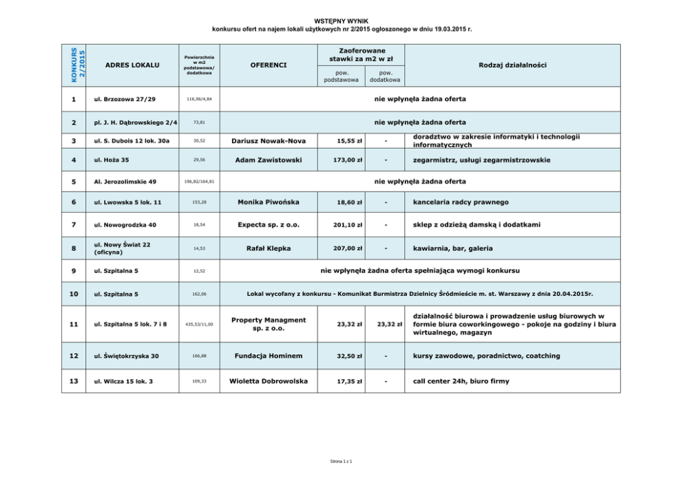 KONKURS 2/2015 WSTĘPNY WYNIK konkursu ofert na najem lokali użytkowych nr 2/2015 ogłoszonego w dniu 19.03.2015 r. ADRES LOKALU Powierzchnia w m2 podstawowa/ dodatkowa OFERENCI Zaoferowane stawki za m2 w zł pow. podstawowa Rodzaj działalności pow. dodatkowa 116,96/4,84 nie wpłynęła żadna oferta pl. J. H. Dąbrowskiego 2/4 73,81 nie wpłynęła żadna oferta 3 ul. S. Dubois 12 lok. 30a 30,52 Dariusz Nowak-Nova 4 ul. Hoża 35 29,56 Adam Zawistowski 5 Al. Jerozolimskie 49 6 ul. Lwowska 5 lok. 11 7 1 ul. Brzozowa 27/29 2 15,55 zł - doradztwo w zakresie informatyki i technologii informatycznych 173,00 zł - zegarmistrz, usługi zegarmistrzowskie nie wpłynęła żadna oferta 196,82/164,81 153,28 Monika Piwońska 18,60 zł - kancelaria radcy prawnego ul. Nowogrodzka 40 18,54 Expecta sp. z o.o. 201,10 zł - sklep z odzieżą damską i dodatkami 8 ul. Nowy Świat 22 (oficyna) 14,53 Rafał Klepka 207,00 zł - kawiarnia, bar, galeria 9 ul. Szpitalna 5 12,52 nie wpłynęła żadna oferta spełniająca wymogi konkursu 10 ul. Szpitalna 5 162,06 Lokal wycofany z konkursu - Komunikat Burmistrza Dzielnicy Śródmieście m. st. Warszawy z dnia 20.04.2015r. 11 ul. Szpitalna 5 lok. 7 i 8 12 13 działalność biurowa i prowadzenie usług biurowych w formie biura coworkingowego - pokoje na godziny i biura wirtualnego, magazyn 435,53/11,00 Property Managment sp. z o.o. 23,32 zł ul. Świętokrzyska 30 166,88 Fundacja Hominem 32,50 zł - kursy zawodowe, poradnictwo, coatching ul. Wilcza 15 lok. 3 109,33 Wioletta Dobrowolska 17,35 zł - call center 24h, biuro firmy Strona 1 z 1 23,32 zł