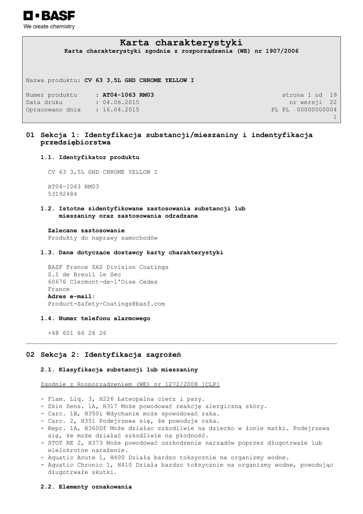 Karta charakterystyki Karta charakterystyki zgodnie z rozporządzenia (WE) nr 1907/2006 Nazwa produktu: CV 63 3,5L GHD CHROME YELLOW I Numer produktu Data druku Opracowano dnia : AT04-1063 RM03 : 04.06.2015 : 16.04.2015 strona 1 od 19 nr wersji 22 PL PL 00000000004 1 01 Sekcja 1: Identyfikacja substancji/mieszaniny i indentyfikacja przedsiębiorstwa 1.1. Identyfikator produktu CV 63 3,5L GHD CHROME YELLOW I AT04-1063 RM03 53192484 1.2. Istotne zidentyfikowane zastosowania substancji lub mieszaniny oraz zastosowania odradzane Zalecane zastosowanie Produkty do naprawy samochodów 1.3. Dane dotyczące dostawcy karty charakterystyki BASF France SAS Division Coatings Z.I de Breuil le Sec 60676 Clermont-de-l'Oise Cedex France Adres e-mail: [email protected] 1.4. Numer telefonu alarmowego +48 601 66 26 26 _____________________________________________________________________________________ 02 Sekcja 2: Identyfikacja zagrożeń 2.1. Klasyfikacja substancji lub mieszaniny Zgodnie z Rozporządzeniem (WE) nr 1272/2008 [CLP] - Flam. Liq. 3, H226 Łatwopalna ciecz i pary. Skin Sens. 1A, H317 Może powodować reakcję alergiczną skóry. Carc. 1B, H350i Wdychanie może spowodować raka. Carc. 2, H351 Podejrzewa się, że powoduje raka. Repr. 1A, H360Df Może działac szkodliwie na dziecko w łonie matki. Podejrzewa się, że może działać szkodliwie na płodność. - STOT RE 2, H373 Może powodować uszkodzenie narządów poprzez długotrwałe lub wielokrotne narażenie. - Aquatic Acute 1, H400 Działa bardzo toksycznie na organizmy wodne. - Aquatic Chronic 1, H410 Działa bardzo toksycznie na organizmy wodne, powodując długotrwałe skutki. 2.2. Elementy oznakowania Karta charakterystyki Karta charakterystyki zgodnie z rozporządzenia (WE) nr 1907/2006 Nazwa produktu: CV 63 3,5L GHD CHROME YELLOW I Numer produktu Data druku Opracowano dnia : AT04-1063 RM03 : 04.06.2015 : 16.04.2015 strona 2 od 19 nr wersji 22 PL PL 00000000004 2 Zgodnie z Rozporządzeniem (WE) nr 1272/2008 [CLP] Piktogram określający rodzaj zagrożenia: Hasło ostrzegawcze: Niebezpieczeństwo Zwroty wskazujące rodzaj zagrożenia: H226 Łatwopalna ciecz i pary. H317 Może powodować reakcję alergiczną skóry. H350i Wdychanie może spowodować raka. H351 Podejrzewa się, że powoduje raka. H360Df Może działac szkodliwie na dziecko w łonie matki. Podejrzewa się, że może działać szkodliwie na płodność. H373 Może powodować uszkodzenie narządów poprzez długotrwałe lub wielokrotne narażenie. H410 Działa bardzo toksycznie na organizmy wodne, powodując długotrwałe skutki. Zwroty wskazujące środki ostrożności (zapobieganie): P201 Przed użyciem zapoznać się ze specjalnymi instrukcjami. P273 Unikać uwolnienia do środowiska. P280 Stosować rękawice ochronne/odzież ochronną/ochronę oczu/ochronę twarzy. P281 Używać wymaganych środków ochrony osobistej. Zwroty wskazujące środki ostrożności (przechowywanie): P403 + P235 Przechowywać w dobrze wentylowanym miejscu. Przechowywać w chłodnym miejscu. Zwroty wskazujące środki ostrożności (usuwanie): P501 Zawartość/pojemnik usuwać do punktów zbiórki odpadów niebezpiecznych lub specjalnych. Składniki wpływające na stopień zagrożenia wymagające etykietowania: tlenek antymonu(III) C.I. Pigment Yellow 34 bis-(1,2,2,6,6-pentametylo-4-piperydynylo) sebacynian Oznakowanie określonej mieszaniny: EUH066 Powtarzające się narażenie może powodować wysuszanie lub pękanie skóry. EUH201 Zawiera ołów. Nie należy stosować na powierzchniach, które Karta charakterystyki Karta charakterystyki zgodnie z rozporządzenia (WE) nr 1907/2006 Nazwa produktu: CV 63 3,5L GHD CHROME YELLOW I Numer produktu Data druku Opracowano dnia : AT04-1063 RM03 : 04.06.2015 : 16.04.2015 strona 3 od 19 nr wersji 22 PL PL 00000000004 3 mogą być gryzione lub ssane przez dzieci. 2.3. Inne zagrożenia Jeśli w tej sekcji zostaną wymienione dodatkowe dane odnośnie pozostałych zagrożeń, które nie wpłyną na klasyfikację, muszą być dodanedo ogólnych zagrożeń substancji lub mieszaniny. _____________________________________________________________________________________ 03 Sekcja 3: Skład/informacja o składnikach 3.1. Substancje nie znajduje zastosowania 3.2. Mieszaniny Charakterystyka chemiczna żywica akrylowa, rozpuszczalnik organiczny, wypełniacze, pigment Składniki niebezpieczne zgodnie z rozporządzeniem (WE) nr 1272/2008 Nr. CAS Nr. WE Nr. Rejestracji Nr. INDEX Ciężar % Klasa, Kategoria, Zwroty wskazujące rodzaj zagrożenia C.I. Pigment Yellow 34 1344-37-2 215-693-7 25,0 - < 30,0 Carc. 1B, H350i Repr. 1A, H360Df STOT RE 2, H373 Aquatic Acute 1, H400 Aquatic Chronic 1, H410 octan butylu 123-86-4 204-658-1 7,0 - < 10,0 Flam. Liq. 3, H226 STOT SE 3, H336 082-009-00-X 01-2119485493-29-XXXX 607-025-00-1 solwent nafta (ropa naftowa), węglowodory lekkie aromatyczne 64742-95-6 265-199-0 01-2119455851-35-XXXX 649-356-00-4 7,0 - < 10,0 Flam. Liq. 3, H226 STOT SE 3, H335 STOT SE 3, H336 Karta charakterystyki Karta charakterystyki zgodnie z rozporządzenia (WE) nr 1907/2006 Nazwa produktu: CV 63 3,5L GHD CHROME YELLOW I Numer produktu Data druku Opracowano dnia : AT04-1063 RM03 : 04.06.2015 : 16.04.2015 strona 4 od 19 nr wersji 22 PL PL 00000000004 4 Asp. Tox. 1, H304 Aquatic Chronic 2, H411 1,2,4-trimetylobenzen 95-63-6 202-436-9 5,0 - < 7,0 Flam. Liq. 3, H226 Acute Tox. 4, H332 Skin Corr./Irrit. 2, H315 Eye Dam./Irrit. 2, H319 STOT SE 3, H335 Aquatic Chronic 2, H411 keton izobutylowo-metylowy 108-10-1 203-550-1 2,0 - < 2,5 Flam. Liq. 2, H225 Acute Tox. 4, H332 Eye Dam./Irrit. 2, H319 STOT SE 3, H335 601-043-00-3 01-2119473980-30-XXXX 606-004-00-4 krysztal kwasu krzemowego 14808-60-7 238-878-4 1,0 - < 2,0 STOT RE 2, H373 mezytylen 108-67-8 203-604-4 1,0 - < 2,0 Flam. Liq. 3, H226 STOT SE 3, H335 Aquatic Chronic 2, H411 tlenek antymonu(III) 1309-64-4 215-175-0 1,0 - < 2,0 Carc. 2, H351 601-025-00-5 051-005-00-X bis-(1,2,2,6,6-pentametylo-4-piperydynylo) seb
