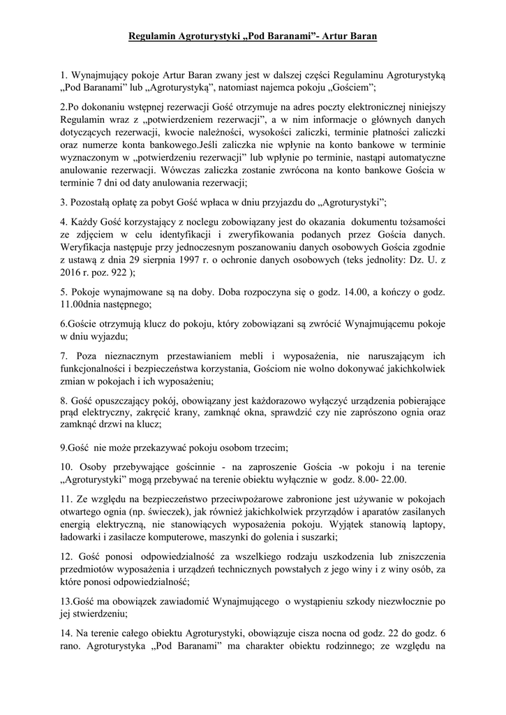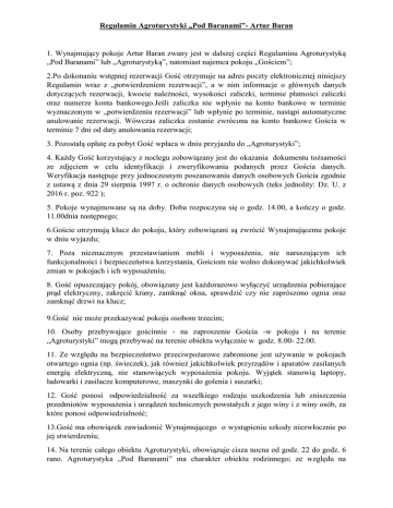 Regulamin Agroturystyki „Pod Baranami”- Artur Baran 1. Wynajmujący pokoje Artur Baran zwany jest w dalszej części Regulaminu Agroturystyką „Pod Baranami” lub „Agroturystyką”, natomiast najemca pokoju „Gościem”; 2.Po dokonaniu wstępnej rezerwacji Gość otrzymuje na adres poczty elektronicznej niniejszy Regulamin wraz z „potwierdzeniem rezerwacji”, a w nim informacje o głównych danych dotyczących rezerwacji, kwocie należności, wysokości zaliczki, terminie płatności zaliczki oraz numerze konta bankowego.Jeśli zaliczka nie wpłynie na konto bankowe w terminie wyznaczonym w „potwierdzeniu rezerwacji” lub wpłynie po terminie, nastąpi automatyczne anulowanie rezerwacji. Wówczas zaliczka zostanie zwrócona na konto bankowe Gościa w terminie 7 dni od daty anulowania rezerwacji; 3. Pozostałą opłatę za pobyt Gość wpłaca w dniu przyjazdu do „Agroturystyki”; 4. Każdy Gość korzystający z noclegu zobowiązany jest do okazania dokumentu tożsamości ze zdjęciem w celu identyfikacji i zweryfikowania podanych przez Gościa danych. Weryfikacja następuje przy jednoczesnym poszanowaniu danych osobowych Gościa zgodnie z ustawą z dnia 29 sierpnia 1997 r. o ochronie danych osobowych (teks jednolity: Dz. U. z 2016 r. poz. 922 ); 5. Pokoje wynajmowane są na doby. Doba rozpoczyna się o godz. 14.00, a kończy o godz. 11.00dnia następnego; 6.Goście otrzymują klucz do pokoju, który zobowiązani są zwrócić Wynajmującemu pokoje w dniu wyjazdu; 7. Poza nieznacznym przestawianiem mebli i wyposażenia, nie naruszającym ich funkcjonalności i bezpieczeństwa korzystania, Gościom nie wolno dokonywać jakichkolwiek zmian w pokojach i ich wyposażeniu; 8. Gość opuszczający pokój, obowiązany jest każdorazowo wyłączyć urządzenia pobierające prąd elektryczny, zakręcić krany, zamknąć okna, sprawdzić czy nie zaprószono ognia oraz zamknąć drzwi na klucz; 9.Gość nie może przekazywać pokoju osobom trzecim; 10. Osoby przebywające gościnnie - na zaproszenie Gościa -w pokoju i na terenie „Agroturystyki” mogą przebywać na terenie obiektu wyłącznie w godz. 8.00- 22.00. 11. Ze względu na bezpieczeństwo przeciwpożarowe zabronione jest używanie w pokojach otwartego ognia (np. świeczek), jak również jakichkolwiek przyrządów i aparatów zasilanych energią elektryczną, nie stanowiących wyposażenia pokoju. Wyjątek stanowią laptopy, ładowarki i zasilacze komputerowe, maszynki do golenia i suszarki; 12. Gość ponosi odpowiedzialność za wszelkiego rodzaju uszkodzenia lub zniszczenia przedmiotów wyposażenia i urządzeń technicznych powstałych z jego winy i z winy osób, za które ponosi odpowiedzialność; 13.Gość ma obowiązek zawiadomić Wynajmującego o wystąpieniu szkody niezwłocznie po jej stwierdzeniu; 14. Na terenie całego obiektu Agroturystyki, obowiązuje cisza nocna od godz. 22 do godz. 6 rano. Agroturystyka „Pod Baranami” ma charakter obiektu rodzinnego; ze względu na komfort wszystkich Gości, uprasza się o ciche zachowanie także poza czasem obowiązywania ciszy nocnej. 15. Na terenie całej „Agroturystyki”, w tym we wszystkich pokojach, poza miejscem do tego wyznaczonym, zgodnie z ustawą z dnia 9 listopada 1995r. o ochronie zdrowia przed następstwami używania tytoniu i wyrobów tytoniowych (tekst jednolity : Dz. U. z 2015, poz. 298)obowiązuje całkowity zakaz palenia papierosów, innych wyrobów tytoniowych oraz papierosów elektronicznych; 16. Do dyspozycji Gości pozostawiony jest niestrzeżony, niedozorowany i nieodpłatny parking znajdujący się na terenie „Agroturystyki”. „Agroturystyka” nie ponosi odpowiedzialności za uszkodzenia i utratę samochodu lub innego pojazdu mechanicznego należącego do Gościa oraz przedmiotów w nim pozostawionych. 17. Na terenie „Agroturystyki” istnieje możliwość korzystania –zgodnie z odrębnym regulaminem - z ogrodu rekreacyjno-wypoczynkowego (plac zabaw z trampoliną i tyrolką, boisko wielofunkcyjne, boisko do siatkówki plażowej, stanowisko grillowe, mini zoo); 18. „Agroturystyka” ponosi odpowiedzialność za utratę lub uszkodzenie rzeczy wniesionych przez Gości do „Agroturystyki” w zakresie określonym przepisami Kodeksu Cywilnego; 19. „Agroturystyce” przysługuje ustawowe prawo zastawu na rzeczach wniesionych przez Gościa do „Agroturystyki”, w przypadku opóźnienia się Gościa z uregulowaniem płatności za pobyt lub nieuregulowania należności za świadczone usługi; 20. Gość wyraża zgodę na przechowywanie i przetwarzanie danych osobowych zgodnie z ustawą o ochronie danych osobowych (tekst jednolity: Dz. U. z 2016 r. poz. 922) przez Artura Barana – „Pod Baranami”z siedzibą w Ujeździe ul. Sosnowa 3,32-080 Ujazd dla potrzeb niezbędnych do realizacji pobytu Gościa w „Agroturystyce”, korzystania przez Gościa z pozostałych usług świadczonych przez „Agroturystykę”. Gość ma prawo wglądu do swoich danych osobowych oraz ich poprawiania lub usuwania; 21. Niniejszy regulamin obowiązuje Gości oraz wszystkie osoby przebywające na terenie „Agroturystyki”; 22. W przypadku naruszenia postanowień niniejszego regulaminu, „Agroturystyka” może odmówić dalszego świadczenia usług osobie, która je narusza; 23. Niniejszy Regulamin dostępny jest w holu głównym przy drzwiach wejściowych, w każdym pokoju, a także na stronie internetowej Agroturystyki „Pod Baranami” www.podbaranami.com.pl; 24. Wpłacając zaliczkę lub uiszczając opłatę za pobyt, a także rozpoczynając pobyt w Agroturystyce Gość potwierdza, że zapoznał się z regulaminem i akceptuje jego warunki; 25. We wszystkich sprawach nieuregulowanych w Regulaminie mają zastosowanie powszechnie obowiązujące przepisy prawa; 26. Regulamin obowiązuje od dnia. 10.10.2016r.