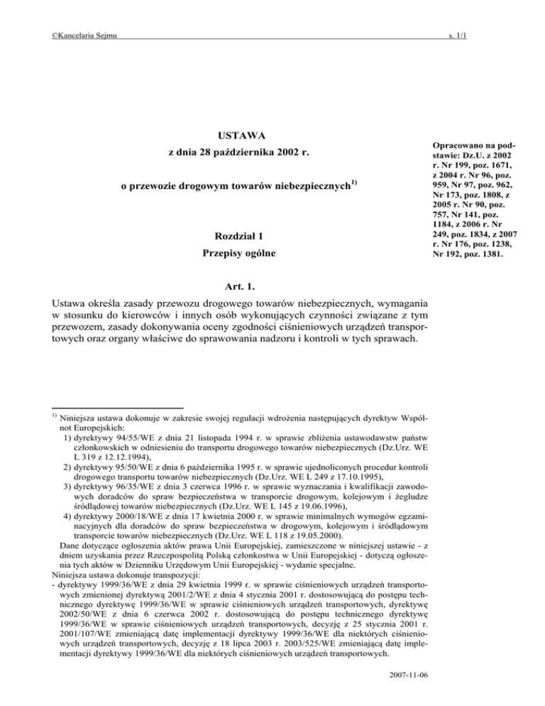 ©Kancelaria Sejmu s. 1/1 USTAWA Opracowano na podstawie: Dz.U. z 2002 r. Nr 199, poz. 1671, z 2004 r. Nr 96, poz. 959, Nr 97, poz. 962, Nr 173, poz. 1808, z 2005 r. Nr 90, poz. 757, Nr 141, poz. 1184, z 2006 r. Nr 249, poz. 1834, z 2007 r. Nr 176, poz. 1238, Nr 192, poz. 1381. z dnia 28 października 2002 r. o przewozie drogowym towarów niebezpiecznych1) Rozdział 1 Przepisy ogólne Art. 1. Ustawa określa zasady przewozu drogowego towarów niebezpiecznych, wymagania w stosunku do kierowców i innych osób wykonujących czynności związane z tym przewozem, zasady dokonywania oceny zgodności ciśnieniowych urządzeń transportowych oraz organy właściwe do sprawowania nadzoru i kontroli w tych sprawach. 1) Niniejsza ustawa dokonuje w zakresie swojej regulacji wdrożenia następujących dyrektyw Wspólnot Europejskich: 1) dyrektywy 94/55/WE z dnia 21 listopada 1994 r. w sprawie zbliżenia ustawodawstw państw członkowskich w odniesieniu do transportu drogowego towarów niebezpiecznych (Dz.Urz. WE L 319 z 12.12.1994), 2) dyrektywy 95/50/WE z dnia 6 października 1995 r. w sprawie ujednoliconych procedur kontroli drogowego transportu towarów niebezpiecznych (Dz.Urz. WE L 249 z 17.10.1995), 3) dyrektywy 96/35/WE z dnia 3 czerwca 1996 r. w sprawie wyznaczania i kwalifikacji zawodowych doradców do spraw bezpieczeństwa w transporcie drogowym, kolejowym i żegludze śródlądowej towarów niebezpiecznych (Dz.Urz. WE L 145 z 19.06.1996), 4) dyrektywy 2000/18/WE z dnia 17 kwietnia 2000 r. w sprawie minimalnych wymogów egzaminacyjnych dla doradców do spraw bezpieczeństwa w drogowym, kolejowym i śródlądowym transporcie towarów niebezpiecznych (Dz.Urz. WE L 118 z 19.05.2000). Dane dotyczące ogłoszenia aktów prawa Unii Europejskiej, zamieszczone w niniejszej ustawie - z dniem uzyskania przez Rzeczpospolitą Polską członkostwa w Unii Europejskiej - dotyczą ogłoszenia tych aktów w Dzienniku Urzędowym Unii Europejskiej - wydanie specjalne. Niniejsza ustawa dokonuje transpozycji: - dyrektywy 1999/36/WE z dnia 29 kwietnia 1999 r. w sprawie ciśnieniowych urządzeń transportowych zmienionej dyrektywą 2001/2/WE z dnia 4 stycznia 2001 r. dostosowującą do postępu technicznego dyrektywę 1999/36/WE w sprawie ciśnieniowych urządzeń transportowych, dyrektywę 2002/50/WE z dnia 6 czerwca 2002 r. dostosowującą do postępu technicznego dyrektywę 1999/36/WE w sprawie ciśnieniowych urządzeń transportowych, decyzję z 25 stycznia 2001 r. 2001/107/WE zmieniającą datę implementacji dyrektywy 1999/36/WE dla niektórych ciśnieniowych urządzeń transportowych, decyzję z 18 lipca 2003 r. 2003/525/WE zmieniającą datę implementacji dyrektywy 1999/36/WE dla niektórych ciśnieniowych urządzeń transportowych. 2007-11-06 ©Kancelaria Sejmu s. 2/2 Art. 2. Użyte w ustawie określenia oznaczają: 1) „umowa ADR” – Umowę europejską dotyczącą międzynarodowego przewozu drogowego towarów niebezpiecznych (ADR), sporządzoną w Genewie dnia 30 września 1957 r. (Dz. U. z 1975 r. Nr 35, poz. 189 i 190, z 1977 r. Nr 36, poz. 157, z 1978 r. Nr 31, poz. 134, z 1981 r. Nr 32, poz. 180, z 1982 r. Nr 38, poz. 249, z 1986 r. Nr 14, poz. 81, z 1990 r. Nr 84, poz. 490, z 1993 r. Nr 61, poz. 293, z 1995 r. Nr 50, poz. 270, z 1997 r. Nr 59, poz. 367 i z 1999 r. Nr 30, poz. 287), wraz ze zmianami obowiązującymi od daty ich wejścia w życie w stosunku do Rzeczypospolitej Polskiej, podanymi do publicznej wiadomości we właściwy sposób; 2) „towar niebezpieczny” – materiał lub przedmiot (rzecz), który zgodnie z umową ADR jest niedopuszczony do międzynarodowego przewozu drogowego lub jest dopuszczony do takiego przewozu na warunkach określonych w tej umowie; 3) „przewóz drogowy” – każde przemieszczenie towaru niebezpiecznego przy użyciu pojazdu po drodze publicznej i po innych drogach ogólnodostępnych; 4) „zaświadczenie ADR” – zaświadczenie o ukończeniu przez kierowcę, z wynikiem pozytywnym, kursu dokształcającego początkowego lub kursu dokształcającego doskonalącego dla kierowców przewożących towary niebezpieczne, zwanych dalej „kursami dokształcającymi”; 5) ciśnieniowe urządzenia transportowe: a) naczynia takie jak: butle, zbiorniki rurowe, bębny ciśnieniowe, naczynia kriogeniczne, wiązki butli, b) cysterny, łącznie z cysternami odejmowalnymi, cysternami, pojazdami-bateriami, pojazdami cysternami kontenerami- - stosowane w transporcie gazów klasy 2 oraz w transporcie określonych towarów niebezpiecznych innych klas, łącznie z ich zaworami i innym wyposażeniem zgodnie z umową ADR; 6) ocena zgodności - sprawdzanie, przed wprowadzeniem do obrotu, ciśnieniowego urządzenia transportowego, projektu lub procesu jego wytwarzania, w zakresie zgodności z wymaganiami określonymi w umowie ADR; 7) ponowna ocena zgodności - sprawdzanie znajdującego się w obrocie ciśnieniowego urządzenia transportowego, w zakresie zgodności z wymaganiami określonymi w umowie ADR, na żądanie właściciela, jego upoważnionego przedstawiciela albo użytkownika, w celu potwierdzenia zgodności z tymi wymaganiami; 8) okresowe badanie - badanie kontrolne znajdujących się w obrocie ciśnieniowych urządzeń transportowych stwierdzające ich zgodność podczas eksploatacji z wymaganiami określonymi w umowie ADR; 9) oznakowanie ∏ - oznakowanie potwierdzające zgodność ciśnieniowego urządzenia transportowego z wymaganiami określonymi w umowie ADR. 2007-11-06 ©Kancelaria Sejmu s. 3/3 Art. 3. 1. W sprawach nie uregulowanych ustawą do przewozu drogowego towarów niebezpiecznych stosuje się umowę ADR. 2. Przepisy ustawy stosuje się odpowiednio do nadawcy, odbiorcy oraz innych osób wykonujących czynności związane z przewozem drogowym towarów niebezpiecznych. Art. 4. 1. Zabrania się przewozu drogowego towarów niebezpiecznych określonych w przepisach umowy ADR jako towary niedopuszczone do międzynarodowego przewozu drogowego. 2. Zezwala si