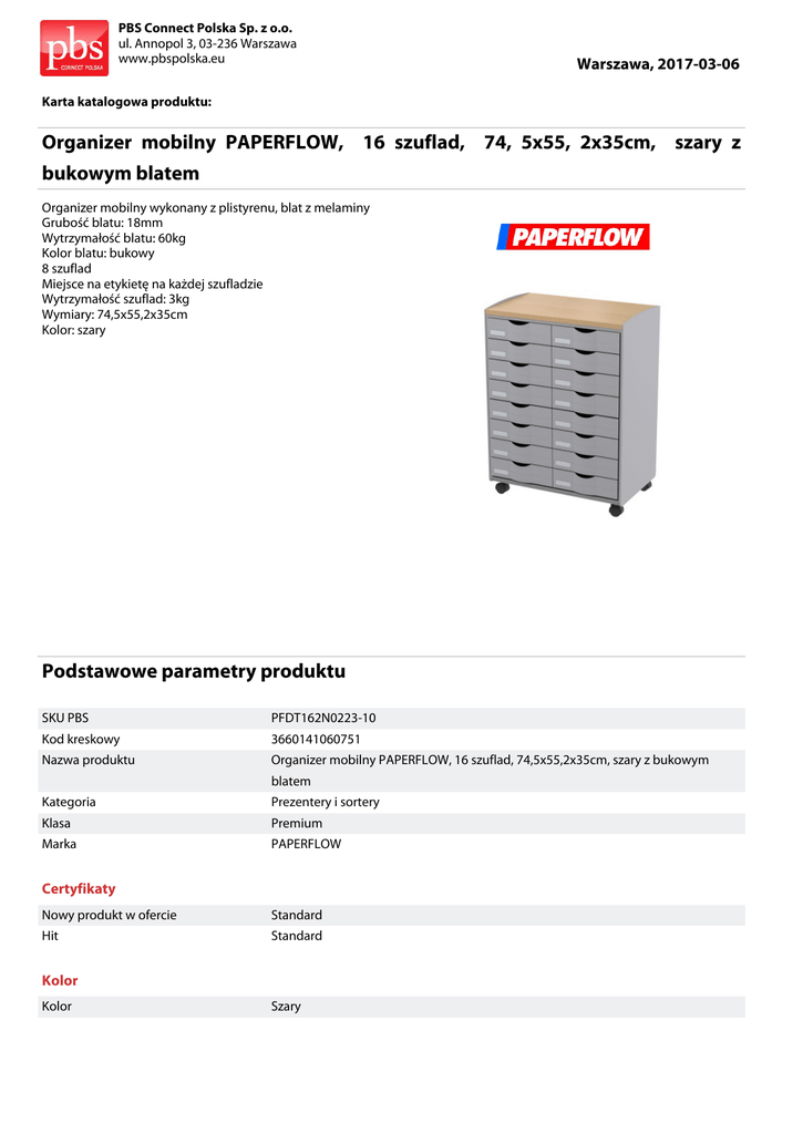 PBS Connect Polska Sp. z o.o. ul. Annopol 3, 03-236 Warszawa www.pbspolska.eu Warszawa, 2017-03-06 Karta katalogowa produktu: Organizer mobilny PAPERFLOW, 16 szuflad, 74, 5x55, 2x35cm, szary z bukowym blatem Organizer mobilny wykonany z plistyrenu, blat z melaminy Grubość blatu: 18mm Wytrzymałość blatu: 60kg Kolor blatu: bukowy 8 szuflad Miejsce na etykietę na każdej szufladzie Wytrzymałość szuflad: 3kg Wymiary: 74,5x55,2x35cm Kolor: szary Podstawowe parametry produktu SKU PBS PFDT162N0223-10 Kod kreskowy 3660141060751 Nazwa produktu Organizer mobilny PAPERFLOW, 16 szuflad, 74,5x55,2x35cm, szary z bukowym blatem Kategoria Prezentery i sortery Klasa Premium Marka PAPERFLOW Certyfikaty Nowy produkt w ofercie Standard Hit Standard Kolor Kolor Szary PBS Connect Polska Sp. z o.o. ul. Annopol 3, 03-236 Warszawa www.pbspolska.eu Warszawa, 2017-03-06 Karta katalogowa produktu cd. Organizer mobilny PAPERFLOW, 16 szuflad, 74, 5x55, 2x35cm, szary z bukowym blatem Podstawowe parametry produktu Cecha Produkt Organizer Typ Mobilny Przegrody 16 W ofercie od 2016-09 Wymiary Rozmiar 16 szuflad Wymiary (mm) 745x552x350 Wspólny słownik zamówień CPV 30193500-3 Stojak na materiały reklamowe