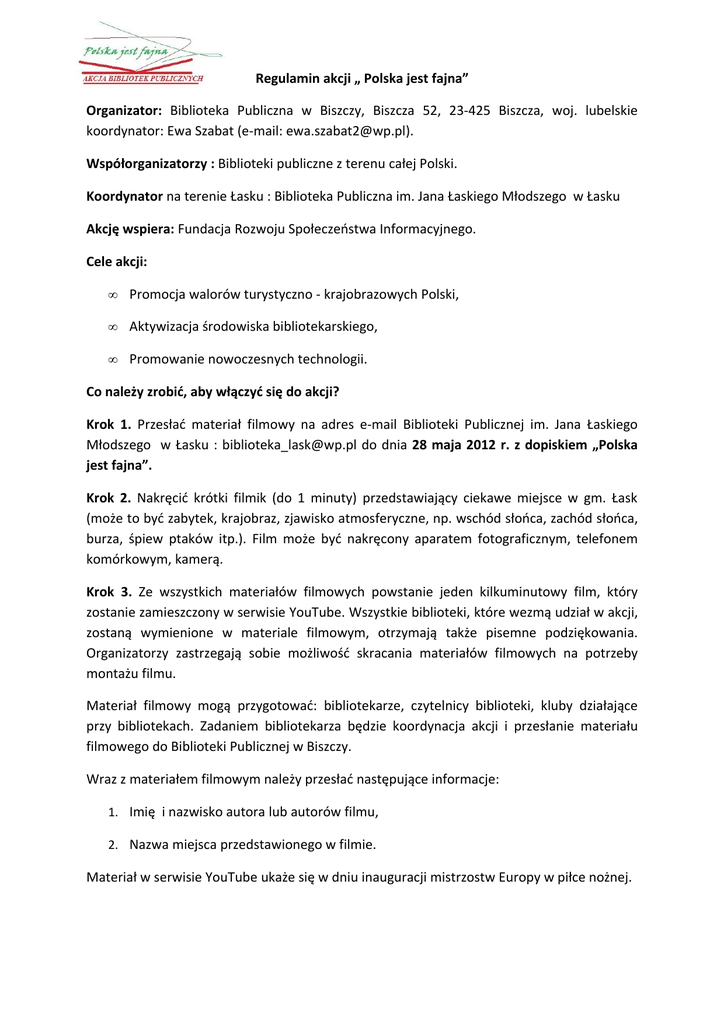 Regulamin akcji „ Polska jest fajna” Organizator: Biblioteka Publiczna w Biszczy, Biszcza 52, 23-425 Biszcza, woj. lubelskie koordynator: Ewa Szabat (e-mail: [email protected]). Współorganizatorzy : Biblioteki publiczne z terenu całej Polski. Koordynator na terenie Łasku : Biblioteka Publiczna im. Jana Łaskiego Młodszego w Łasku Akcję wspiera: Fundacja Rozwoju Społeczeństwa Informacyjnego. Cele akcji: • Promocja walorów turystyczno - krajobrazowych Polski, • Aktywizacja środowiska bibliotekarskiego, • Promowanie nowoczesnych technologii. Co należy zrobić, aby włączyć się do akcji? Krok 1. Przesłać materiał filmowy na adres e-mail Biblioteki Publicznej im. Jana Łaskiego Młodszego w Łasku : [email protected] do dnia 28 maja 2012 r. z dopiskiem „Polska jest fajna”. Krok 2. Nakręcić krótki filmik (do 1 minuty) przedstawiający ciekawe miejsce w gm. Łask (może to być zabytek, krajobraz, zjawisko atmosferyczne, np. wschód słońca, zachód słońca, burza, śpiew ptaków itp.). Film może być nakręcony aparatem fotograficznym, telefonem komórkowym, kamerą. Krok 3. Ze wszystkich materiałów filmowych powstanie jeden kilkuminutowy film, który zostanie zamieszczony w serwisie YouTube. Wszystkie biblioteki, które wezmą udział w akcji, zostaną wymienione w materiale filmowym, otrzymają także pisemne podziękowania. Organizatorzy zastrzegają sobie możliwość skracania materiałów filmowych na potrzeby montażu filmu. Materiał filmowy mogą przygotować: bibliotekarze, czytelnicy biblioteki, kluby działające przy bibliotekach. Zadaniem bibliotekarza będzie koordynacja akcji i przesłanie materiału filmowego do Biblioteki Publicznej w Biszczy. Wraz z materiałem filmowym należy przesłać następujące informacje: 1. Imię i nazwisko autora lub autorów filmu, 2. Nazwa miejsca przedstawionego w filmie. Materiał w serwisie YouTube ukaże się w dniu inauguracji mistrzostw Europy w piłce nożnej. Deklaracje : 1. Przystąpienie do akcji i przesłanie nagranego materiału filmowego na adres e-mailowy Biblioteki Publicznej w Łasku jest równoznaczne z wyrażeniem zgody autorów nadesłanych filmów na wykorzystanie ich danych osobowych do celów związanych z akcją (zgodnie z przepisami ustawy z dnia 29 sierpnia 1997 roku o ochronie danych osobowych) i publikację przesłanych nagrań przez Bibliotekę Publiczną w Biszczy w serwisie Youtube. 2. Zgłoszenie nagranego materiału filmowego do akcji „Polska jest fajna” jest równoznaczne z oświadczeniem, że zgłaszający jest autorem nadesłąnego materiału.