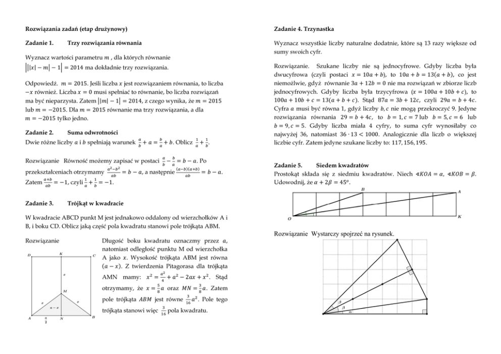 Rozwiązania zadań (etap drużynowy) Zadanie 4. Trzynastka Zadanie 1. Wyznacz wszystkie liczby naturalne dodatnie, które są 13 razy większe od sumy swoich cyfr. Trzy rozwiązania równania Wyznacz wartości parametru | | 1 , dla których równanie 2014 ma dokładnie trzy rozwiązania. Odpowiedź. 2015. Jeśli liczba jest rozwiązaniem równania, to liczba również. Liczba 0 musi spełniać to równanie, bo liczba rozwiązań ma być nieparzysta. Zatem | | 1 2014, z czego wynika, że 2015 lub 2015. Dla 2015 równanie ma trzy rozwiązania, a dla 2015 tylko jedno. Zadanie 2. Suma odwrotności Dwie różne liczby i spełniają warunek . Oblicz Rozwiązanie Równość możemy zapisać w postaci przekształceniach otrzymamy Zatem Zadanie 3. 1, czyli . . Po , a następnie . 1. Rozwiązanie. Szukane liczby nie są jednocyfrowe. Gdyby liczba była dwucyfrowa (czyli postaci 10 ), to 10 13 , co jest niemożlwie, gdyż równanie 3 12 0 nie ma rozwiązań w zbiorze liczb jednocyfrowych. Gdyby liczba była trzycyfrowa ( 100 10 #), to 100 10 # 13 # . Stąd 87 3 12#, czyli 29 4#. Cyfra musi być równa 1, gdyż liczby , # nie mogą przekroczyć 9. Jedyne rozwiązania równania 29 4#, to 1, # 7lub 5, # 6 lub 9, # 5. Gdyby liczba miała 4 cyfry, to suma cyfr wynosiłaby co najwyżej 36, natomiast 36 ∙ 13 + 1000. Analogicznie dla liczb o większej liczbie cyfr. Zatem jedyne szukane liczby to: 117, 156, 195. Zadanie 5. Siedem kwadratów Prostokąt składa się z siedmiu kwadratów. Niech ∢-. Udowodnij, że / 20 452 . Trójkąt w kwadracie W kwadracie ABCD punkt M jest jednakowo oddalony od wierzchołków A i B, i boku CD. Oblicz jaką część pola kwadratu stanowi pole trójkąta ABM. Rozwiązanie Wystarczy spojrzeć na rysunek. Rozwiązanie Długość boku kwadratu oznaczmy przez , natomiast odległość punktu M od wierzchołka A jako . Wysokość trójkąta ABM jest równa . Z twierdzenia Pitagorasa dla trójkąta 2 AMN mamy: otrzymamy, że pole trójkąta oraz jest równe trójkąta stanowi więc ! . Stąd . Zatem ! . Pole tego pola kwadratu. /, ∢-. 0.