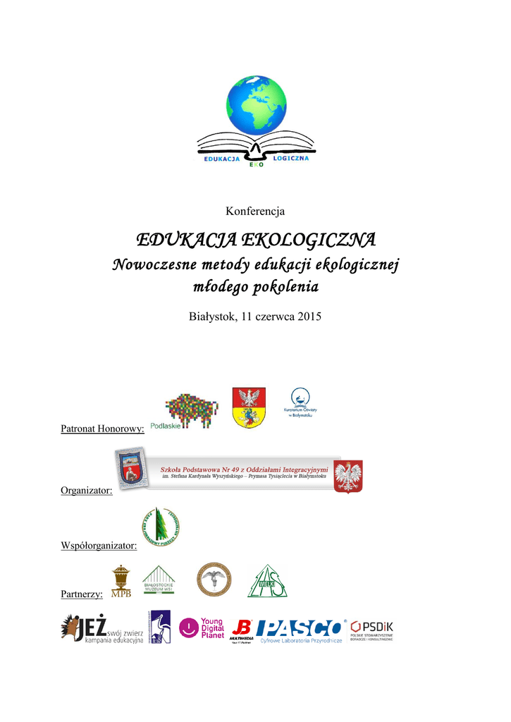 Konferencja EDUKACJA EKOLOGICZNA Nowoczesne metody edukacji ekologicznej młodego pokolenia Białystok, 11 czerwca 2015 Patronat Honorowy: Organizator: Współorganizator: Partnerzy: Szanowni Państwo! Serdecznie zapraszamy do udziału w konferencji: „Edukacja ekologiczna. Nowoczesne metody edukacji ekologicznej młodego pokolenia”, organizowanej przez: Szkołę Podstawową Nr 49 z Oddziałami Integracyjnymi im. Stefana Kardynała Wyszyńskiego – Prymasa Tysiąclecia w Białymstoku, przy współpracy z: Parkiem Krajobrazowym Puszczy Knyszyńskiej z/s w Supraślu oraz partnerami: Departamentem Ochrony Środowiska i Gospodarki Komunalnej Urzędu Miejskiego w Białymstoku, Białostockim Muzeum Wsi, Oddziałem Muzeum Podlaskiego w Białymstoku, Stowarzyszeniem Przyjaciół Puszczy Knyszyńskiej „Wielki Las” (działające przy PKPK), Polskim Stowarzyszeniem Ochrony Jeży "Nasze Jeże", Polskim Stowarzyszeniem Doradczym i Konsultingowym i firmą „JBMultimedia”. Przyszłość nasza i naszych dzieci zależy od czystości środowiska i ilości zasobów przyrodniczych, dlatego też edukację ekologiczna należy rozpoczynać już od najmłodszych lat. Dzieci mogą być partnerami dorosłych w walce o ochronę środowisk, są one bowiem bacznymi obserwatorami wszystkiego co się wokół dzieje. Należy dać im szansę, wskazać drogi postępowania, a będą w sposób rozsądny i umiejętny korzystać z darów Ziemi i rozwijającej się cywilizacji. Dając dobry przykład młodym ludziom, stosując odpowiednie formy i metody pracy można skutecznie i efektywnie kształtować ich postawę zgodną z etyką ekologiczną. Na kształtowanie postaw wpływa wiele czynników między innymi: rodzina, proces nauczania i wychowania, zajęcia pozaszkolne, środki masowego przekazu, grupa rówieśnicza. Uważa się jednak, że największą rolę do odegrania ma szkoła i sam nauczyciel. Jednak edukacja ekologiczna w szkole to nie tylko zajęcia w ławkach i wiedza teoretyczna, choćby największa. Nie jest to podawanie gotowej recepty na lepsze jutro. Edukacja ekologiczna to konkretne działanie w środowisku i dla środowiska. To stwarzanie dzieciom i młodzieży sytuacji, aby mogli samodzielnie dochodzić do prawd i zasad związanych z ekologią, aby umiały wyciągać wnioski, a co za tym idzie – myśleć perspektywicznie. Ważne jest również to, aby dzięki swojej bezpośredniości, zadawaniu dorosłym “niewygodnych ekologicznych pytań”, wytykaniu sprawców zagrożeń, ukazywaniu piękna swojego regionu, poruszyły jednocześnie serca dorosłych i skłoniły ich do refleksji nad swoim stosunkiem do przyrody, a potem do zmiany postawy wobec niej w swoim codziennym życiu. Celem niniejszej konferencji jest skupienie uwagi na edukacji ekologicznej społeczeństwa oraz kształtowanie postaw dzieci i młodzieży zgodnych z etyką ekologiczną. Osiągniecie powyższych celów możliwe jest dzięki: rozbudzaniu potrzeby kontaktu z przyrodą, wyrabianiu szacunku do przyrody, uczestnictwie w działaniach mających na celu ochronę i zapobieganie dewastacji środowiska, rozwijaniu poczucia odpowiedzialności i potrzeby szybkiej reakcji na problemy ekologiczne, zachęcaniu do aktywnej obecności we własnym środowisku, nauce ekologicznego życia we własnym domu, rozwijaniu poczucia przynależności do społeczności szkolnej, środowiska lokalnego, regionu i kraju, kształtowaniu umiejętności nawiązywania i utrzymywania poprawnych kontaktów z innym dziećmi, dorosłymi, osobami niepełnosprawnymi i przedstawicielami innej narodowości, rozwijaniu umiejętności służących zdobywaniu wiedzy, samodzielnego wyszukiwania informacji w różnych źródłach i umiejętne ich wykorzystywanie oraz wyciągania właściwych wniosków. Celem konferencji jest również zwrócenie uwagi na konieczność perspektywicznego myślenia i przewidywania skutków działalności człowieka oraz uzmysłowienie młodym ludziom, że troska o przyrodę jest troską o nas samych i nasze spokojne życie. Efektem konferencji będzie wypracowanie wspólnych działań, metod, narzędzi wspomagających nauczycieli i edukatorów oraz wpływających rozwój edukacji ekologicznej, a także podjęcie wspólnych działań kształtujących proekologiczne postawy młodego człowieka. Konferencja jest elementem projektu edukacyjnego, podczas którego zachęcać będziemy dzieci, nauczycieli, rodziców i animatorów oraz współorganizatorów do wypraw „w przyrodę”. W ramach projektu nauczyciele i edukatorzy ekologiczni zostaną przeszkoleni do prowadzenia zajęć przyrodniczych w terenie przy użyciu metod eksperymentalnych, doświadczalnych, edukacji leśnej, outdoor education, na terenie Szkoły Podstawowej Nr 49 w Białymstoku powstanie Szkoła Trenerów Terenowej Edukacji Ekologicznej oraz Terenowego Ośrodka Poznawania Przyrody (TOPP), zostanie przeprowadzony cykl zajęć w roku szkolnym 2015/2016, zostaną zorganizowane wyjazdy z programem ekologicznoprzyrodniczym dla dzieci i młodzieży. Projekt zakończy wspólna publikacja materiałów edukacyjnych: scenariuszy zajęć, poradnika edukacji terenowej. Program konferencji Edukacja Ekologiczna. Nowoczesne metody edukacji ekologicznej młodego pokolenia Białystok, 11 czerwca 2015 r., w godz. 8.00-12.00 Miejsce: Szkoła Podstawowa Nr 49 z Oddziałami Integracyjnymi im. Stefana Kardynała Wyszyńskiego - Prymasa Tysiąclecia w Białymstoku, ul. Armii Krajowej 32 8:00-8:15 Rejestracja uczestników 8:15-8:25 Przywitanie uczestników przez Tomasza Blecharczyka, Dyrektora Szkoły Podstawowej Nr 49 z Oddziałami Integracyjnymi 8.30-09.00 Kabaret Inaczej z Białegostoku Sesja referatów: 9.00-9.30 Joanna Kurzawa, Dyrektor Parku Krajobrazowego Puszczy Knyszyńskiej Temat: Edukacja przyrodnicza prowadzona przez pracowników służby PKPK Maciej Arciszewski, specjalista ds. ochrony przyrody Temat: Płazy i żaby w PKPK lekcja pełna ciekawostek. 9.30-10.00 Andrzej Koralski, Dyrek