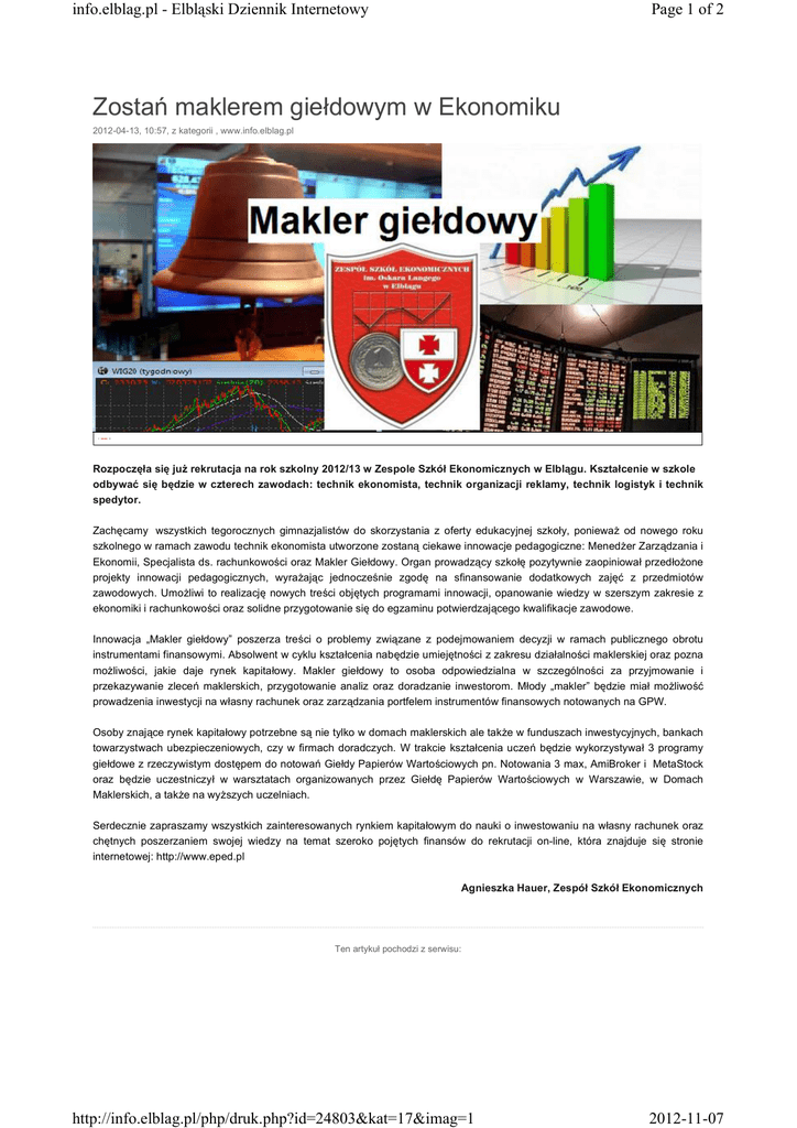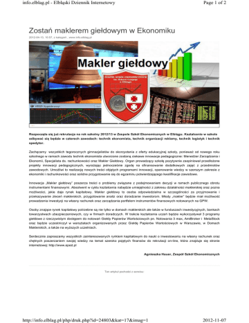 info.elblag.pl - Elbląski Dziennik Internetowy Page 1 of 2 Zostań maklerem giełdowym w Ekonomiku 2012-04-13, 10:57, z kategorii , www.info.elblag.pl Rozpoczęła się już rekrutacja na rok szkolny 2012/13 w Zespole Szkół Ekonomicznych w Elblągu. Kształcenie w szkole odbywać się będzie w czterech zawodach: technik ekonomista, technik organizacji reklamy, technik logistyk i technik spedytor. Zachęcamy wszystkich tegorocznych gimnazjalistów do skorzystania z oferty edukacyjnej szkoły, ponieważ od nowego roku szkolnego w ramach zawodu technik ekonomista utworzone zostaną ciekawe innowacje pedagogiczne: Menedżer Zarządzania i Ekonomii, Specjalista ds. rachunkowości oraz Makler Giełdowy. Organ prowadzący szkołę pozytywnie zaopiniował przedłożone projekty innowacji pedagogicznych, wyrażając jednocześnie zgodę na sfinansowanie dodatkowych zajęć z przedmiotów zawodowych. Umożliwi to realizację nowych treści objętych programami innowacji, opanowanie wiedzy w szerszym zakresie z ekonomiki i rachunkowości oraz solidne przygotowanie się do egzaminu potwierdzającego kwalifikacje zawodowe. Innowacja „Makler giełdowy” poszerza treści o problemy związane z podejmowaniem decyzji w ramach publicznego obrotu instrumentami finansowymi. Absolwent w cyklu kształcenia nabędzie umiejętności z zakresu działalności maklerskiej oraz pozna możliwości, jakie daje rynek kapitałowy. Makler giełdowy to osoba odpowiedzialna w szczególności za przyjmowanie i przekazywanie zleceń maklerskich, przygotowanie analiz oraz doradzanie inwestorom. Młody „makler” będzie miał możliwość prowadzenia inwestycji na własny rachunek oraz zarządzania portfelem instrumentów finansowych notowanych na GPW. Osoby znające rynek kapitałowy potrzebne są nie tylko w domach maklerskich ale także w funduszach inwestycyjnych, bankach towarzystwach ubezpieczeniowych, czy w firmach doradczych. W trakcie kształcenia uczeń będzie wykorzystywał 3 programy giełdowe z rzeczywistym dostępem do notowań Giełdy Papierów Wartościowych pn. Notowania 3 max, AmiBroker i MetaStock oraz będzie uczestniczył w warsztatach organizowanych przez Giełdę Papierów Wartościowych w Warszawie, w Domach Maklerskich, a także na wyższych uczelniach. Serdecznie zapraszamy wszystkich zainteresowanych rynkiem kapitałowym do nauki o inwestowaniu na własny rachunek oraz chętnych poszerzaniem swojej wiedzy na temat szeroko pojętych finansów do rekrutacji on-line, która znajduje się stronie internetowej: http://www.eped.pl Agnieszka Hauer, Zespół Szkół Ekonomicznych Ten artykuł pochodzi z serwisu: http://info.elblag.pl/php/druk.php?id=24803&kat=17&imag=1 2012-11-07 info.elblag.pl - Elbląski Dziennik Internetowy Page 2 of 2 http://info.elblag.pl/php/druk.php?id=24803&kat=17&imag=1 2012-11-07
