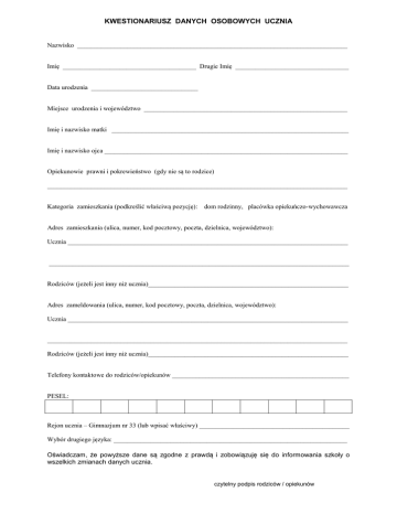 KWESTIONARIUSZ DANYCH OSOBOWYCH UCZNIA Nazwisko _________________________________________________________________________________ Imię ________________________________________ Drugie Imię __________________________________ Data urodzenia ________________________________ Miejsce urodzenia i województwo _____________________________________________________________ Imię i nazwisko matki _______________________________________________________________________ Imię i nazwisko ojca _________________________________________________________________________ Opiekunowie prawni i pokrewieństwo (gdy nie są to rodzice) __________________________________________________________________________________________ Kategoria zamieszkania (podkreślić właściwą pozycję): dom rodzinny, placówka opiekuńczo-wychowawcza Adres zamieszkania (ulica, numer, kod pocztowy, poczta, dzielnica, województwo): Ucznia ____________________________________________________________________________________ __________________________________________________________________________________________ Rodziców (jeżeli jest inny niż ucznia)____________________________________________________________ Adres zameldowania (ulica, numer, kod pocztowy, poczta, dzielnica, województwo): Ucznia ____________________________________________________________________________________ __________________________________________________________________________________________ Rodziców (jeżeli jest inny niż ucznia)____________________________________________________________ Telefony kontaktowe do rodziców/opiekunów _____________________________________________________ PESEL: Rejon ucznia – Gimnazjum nr 33 (lub wpisać właściwy) _____________________________________________ Wybór drugiego języka: ______________________________________________________________________ Oświadczam, że powyższe dane są zgodne z prawdą i zobowiązuję się do informowania szkoły o wszelkich zmianach danych ucznia. czytelny podpis rodziców / opiekunów