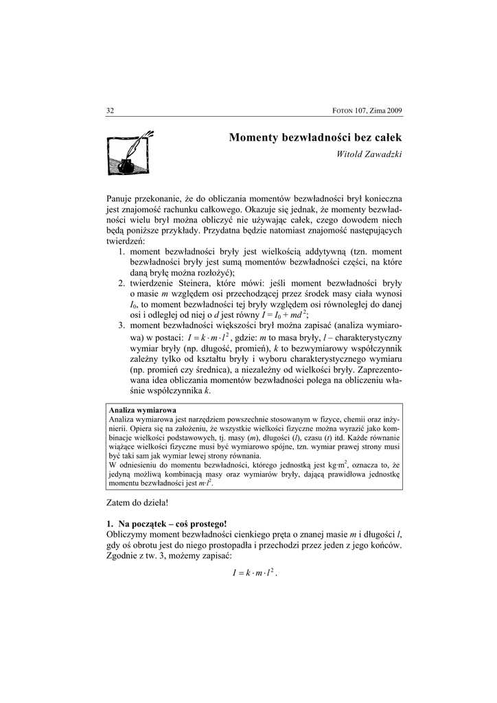 32 FOTON 107, Zima 2009 Momenty bezwładności bez całek Witold Zawadzki Panuje przekonanie, że do obliczania momentów bezwładności brył konieczna jest znajomość rachunku całkowego. Okazuje się jednak, że momenty bezwładności wielu brył można obliczyć nie używając całek, czego dowodem niech będą poniższe przykłady. Przydatna będzie natomiast znajomość następujących twierdzeń: 1. moment bezwładności bryły jest wielkością addytywną (tzn. moment bezwładności bryły jest sumą momentów bezwładności części, na które daną bryłę można rozłożyć); 2. twierdzenie Steinera, które mówi: jeśli moment bezwładności bryły o masie m względem osi przechodzącej przez środek masy ciała wynosi I0, to moment bezwładności tej bryły względem osi równoległej do danej osi i odległej od niej o d jest równy I = I0 + md 2; 3. moment bezwładności większości brył można zapisać (analiza wymiarowa) w postaci: I = k ⋅ m ⋅ l 2 , gdzie: m to masa bryły, l – charakterystyczny wymiar bryły (np. długość, promień), k to bezwymiarowy współczynnik zależny tylko od kształtu bryły i wyboru charakterystycznego wymiaru (np. promień czy średnica), a niezależny od wielkości bryły. Zaprezentowana idea obliczania momentów bezwładności polega na obliczeniu właśnie współczynnika k. Analiza wymiarowa Analiza wymiarowa jest narzędziem powszechnie stosowanym w fizyce, chemii oraz inżynierii. Opiera się na założeniu, że wszystkie wielkości fizyczne można wyrazić jako kombinacje wielkości podstawowych, tj. masy (m), długości (l), czasu (t) itd. Każde równanie wiążące wielkości fizyczne musi być wymiarowo spójne, tzn. wymiar prawej strony musi być taki sam jak wymiar lewej strony równania. W odniesieniu do momentu bezwładności, którego jednostką jest kg·m2, oznacza to, że jedyną możliwą kombinacją masy oraz wymiarów bryły, dającą prawidłowa jednostkę momentu bezwładności jest m·l2. Zatem do dzieła! 1. Na początek – coś prostego! Obliczymy moment bezwładności cienkiego pręta o znanej masie m i długości l, gdy oś obrotu jest do niego prostopadła i przechodzi przez jeden z jego końców. Zgodnie z tw. 3, możemy zapisać: I = k ⋅m⋅l2 . FOTON 107, Zima 2009 33 Przetnijmy „myślowo” nasz pręt w bardzo małej odległości Δl od jego końca nie leżącego na osi obrotu (rys. 1). Rys. 1. Korzystając z tw. 1 moment bezwładności całego pręta możemy zapisać w postaci sumy momentu bezwładności pręta o długości l – Δl i masie m1 oraz cienkiego plasterka (który możemy potraktować jako punkt materialny o masie m2) znajdującego się w odległości l – Δl/2 od osi obrotu (1): 2 I = k ⋅ m1 ⋅ (l − Δl ) 2 + m2 ⋅ ⎛⎜ l − Δl ⎞⎟ . 2 ⎠ ⎝ Jak widać, w pierwszym składniku występuje ten sam, szukany współczynnik k, charakterystyczny dla cienkiego pręta. Masy m1 i m2 obliczamy z proporcji: m1 l − Δl m2 Δl , . = = m l m l Mamy zatem 2 ( l − Δl ) 3 + m Δl ⋅ ⎛⎜ l − Δl ⎞⎟ = 2 ⎠ l l ⎝ 3 2 2 3 ⎛ ( Δl ) 2 l − 3l Δl + 3l ( Δl ) − ( Δl ) = k ⋅m + m Δl ⋅ ⎜⎜ l 2 − lΔl + 4 l ⎝ l I = k ⋅m ⎞ ⎟⎟. ⎠ „Odcięty” kawałek pręta jest bardzo krótki (Δl << l), zatem w powyższym wyrażeniu możemy pominąć wyrazy mniejsze niż Δl, czyli te z (Δl)2 itd.: 3 2 I = k ⋅ m l − 3l Δl + m Δl ⋅ l 2 = k ⋅ m (l 2 − 3lΔl ) + m ⋅ lΔl = l l 2 = kml − 3kmlΔl + mlΔl = kml 2 + (1 − 3k ) mlΔl Przyrównując otrzymane wyrażenie z założonym I = k ⋅ m ⋅ l 2 , otrzymujemy równanie: kml 2 = kml 2 + (1 − 3k ) mlΔl , 1 Przyjęcie odległości odciętego kawałka pręta od osi obrotu równej l zamiast l–Δl/2 nie zmieni końcowego wyniku, a uprości obliczenia. 34 FOTON 107, Zima 2009 które przy dowolnie małym, lecz niezerowym Δl jest spełnione tylko wtedy, gdy 1 – 3k = 0, czyli k = 1/3. Zatem moment bezwładności cienkiego pręta względem osi obrotu prostopadłej do niego i przechodzącej przez jeden z jego końców wyraża się wzorem I = 1 ⋅m⋅l2 . 3 2. Coś okrągłego Obliczymy moment bezwładności walca o znanej masie m i promieniu r, względem osi symetrii. Moment bezwładności punktu materialnego zależy od odległości od osi obrotu, zatem moment bezwładności walca zależy od jego promienia r, a nie zależy od jego długości (wysokości)2. Zgodnie z tw. 3, możemy zatem zapisać I = k ⋅m⋅r2 . Podzielmy „myślowo” nasz walec na cienkościenną rurę oraz walec o zmniejszonym promieniu (rys. 2). Rys. 2. Korzystając z tw. 1 moment bezwładności całego walca możemy zapisać jako sumę momentu bezwładności mniejszego walca o promieniu r – Δr i masie m1 oraz rury o grubości Δr, promieniu r – Δr/2 ≈ r i masie m2. I = k ⋅ m1 ⋅ ( r − Δr ) 2 + m2 ⋅ r 2 . Masy obu części jak poprzednio obliczamy z proporcji: m1 π ( r − Δr ) 2 ( r − Δr ) 2 = = , m π r2 r2 Mamy zatem: 2 Przy założeniu niezmiennej masy m walca. m2 2π rΔr 2 Δr = = . r m π r2 FOTON 107, Zima 2009 I = k ⋅m 35 4 ( r − Δr ) 2 2 Δr r 2 = k ⋅ m ( r − Δr ) + 2 mrΔr 2 ( r − Δ r ) + m r r2 r2 Podobnie, jak w poprzednim zadaniu pomijamy wyrazy wyższej potęgi Δr i otrzymujemy: I = k ⋅ m ( r 2 − 4 rΔr ) + 2 mrΔr = kmr 2 − 4 kmrΔr + 2 mrΔr = kmr 2 + ( 2 − 4 k ) mrΔr . Przyrównując otrzymane wyrażenie z założonym I = k ⋅ m ⋅ r 2 , otrzymujemy równanie kmr 2 = kmr 2 + ( 2 − 4 r ) mrΔr , które przy dowolnie małym, lecz niezerowym Δr jest spełnione tylko wtedy, gdy 2 – 4k = 0, czyli k = 1/2. Zatem moment bezwładności walca (oraz płaskiego krążka) względem osi symetrii wyraża się wzorem I = 1 ⋅m⋅r2. 2 3. Pora na stożek Obliczymy moment bezwładności stożka o znanej masie m, wysokości h i promieniu podstawy r, względem osi symetrii. Jak poprzednio, moment bezwładności stożka zależy od jego promienia r, a nie zależy bezpośred