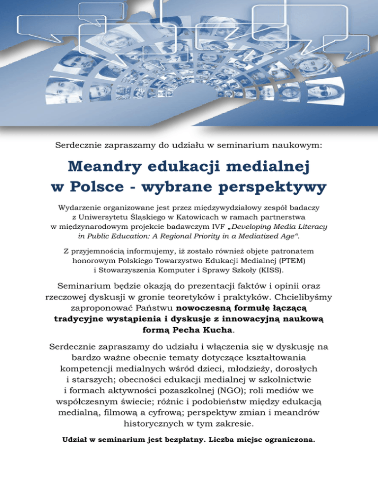 Serdecznie zapraszamy do udziału w seminarium naukowym: Meandry edukacji medialnej w Polsce - wybrane perspektywy Wydarzenie organizowane jest przez międzywydziałowy zespół badaczy z Uniwersytetu Śląskiego w Katowicach w ramach partnerstwa w międzynarodowym projekcie badawczym IVF „Developing Media Literacy in Public Education: A Regional Priority in a Mediatized Age“. Z przyjemnością informujemy, iż zostało również objęte patronatem honorowym Polskiego Towarzystwo Edukacji Medialnej (PTEM) i Stowarzyszenia Komputer i Sprawy Szkoły (KISS). Seminarium będzie okazją do prezentacji faktów i opinii oraz rzeczowej dyskusji w gronie teoretyków i praktyków. Chcielibyśmy zaproponować Państwu nowoczesną formułę łączącą tradycyjne wystąpienia i dyskusje z innowacyjną naukową formą Pecha Kucha. Serdecznie zapraszamy do udziału i włączenia się w dyskusję na bardzo ważne obecnie tematy dotyczące kształtowania kompetencji medialnych wśród dzieci, młodzieży, dorosłych i starszych; obecności edukacji medialnej w szkolnictwie i formach aktywności pozaszkolnej (NGO); roli mediów we współczesnym świecie; różnic i podobieństw między edukacją medialną, filmową a cyfrową; perspektyw zmian i meandrów historycznych w tym zakresie. Udział w seminarium jest bezpłatny. Liczba miejsc ograniczona. Zapraszamy teoretyków i praktyków dyscypliny. Chetni do udziału słuchacze i dyskutanci proszeni są o zapisy drogą e-mailową. Zgłoszenie zawierające imię, nazwisko wraz z tytułem/stopniem; reprezentowaną instytucję oraz/lub stanowisko/status w instytucji należy przesłać do dnia 14.01.2016 na adres: [email protected] Zaświadczenia uczestnictwa będą wydawane tylko zrejestrowanym wcześniej osobom. Termin wydarzenia: 15.01.2015, godzina 10:00 (zapraszamy do zajmowania miejsc w sali od 9:45) Miejsce: Uniwerystet Śląski/budynek CINiBA Centrum Informacji Naukowej i Bibliotka Akademicka Uniwersytetu Śląskiego i Akademi Ekonomicznej, Katowice, ul. Bankowa 11A, sala seminaryjna (poziom II) PROGRAM WYDARZENIA 10:00-10:10 Oficjalne otwarcie seminarium i przywitanie uczestników Sesja wystąpień i prezentacji gości – teoretyków i praktyków (moderatorzy: Monika Frania, Michał Brol) 10:15-10:30 Grzegorz Ptaszek (Polskie Towarzystwo Edukacji Medialnej/ Akademia Górniczo-Hutnicza w Krakowie) - Edukacja medialna 2.0 10:40-10:55 Łukasz Tomczyk (Instytut Nauk o Wychowaniu, Uniwersytet Pedagogiczny w Krakowie) - Kształtowanie kompetencji ochrony wizerunku w sieci wśród adolescentów 11:05-11:20 Barbara Krywoszejew (Fundacja Nowoczesna Polska, Warszawa) Działania fundacji Nowoczesna Polska w zakresie edukacji medialnej 11:30-11:45 Barbara Halska (Polski Nauczyciel roku 2014, Zespół Szkół nr 6 im. Króla Jana III Sobieskiego, Jastrzębie-Zdrój) Współpraca szkołabiznes na rzecz edukacji medialnej w Polsce 11:55-12:10 Krzysztof Kalinowski (dyrektor Gimnazjum nr 2 in. Sprawiedliwych Wśród Narodów Świata, Czerwionka-Leszczyny) – Edukacja medialna w gimnazjum w spojrzeniu praktyka 12:20-12:35 Justyna Budzik (Zakład Filmoznawstwa i Wiedzy o Mediach, Wydział Filologiczny Uniwersytetu Śląskiego) Po co uczniom filmoznawca, czyli jak można wykorzystać w szkole historię i teorię filmu i mediów 12:45-12:50 Podsumowanie i zakończenie sesji gości 12:50-13:10 Przerwa kawowa Kwadrans inspiracji: prezentacje i zaproszenia 13:10-13:15 Grzegorz Ptaszek: Prezentacja Polskiego Towarzystwa Edukacji Medialnej (PTEM) i zaproszenie na II Kongres Edukacji Medialnej w Krakowie 13:15-13:20 Elżbieta Bowdur: Prezentacja Stowarzyszenia Komputer i Sprawy Szkoły (KISS) i zaproszenie na XII Konferencję NaukowoMetodyczną im. dr. Janusza Trawki – Technologia informacyjna w społeczeństwie wiedzy 13:20-13:25 Ilona Copik, Justyna Budzik: Prezentacja książki „Edukacja przez słowo–obraz dźwięk“ - najnowszej pozycji Wydawnictwa Uniwersytetu Śląskiego Sesja „Naukowa Pecha Kucha 6:40 (20x20)“, czyli meandry edukacji medialnej w spojrzeniu badaczy Uniwersytetu Śląskiego (moderatorzy: Anna Brosch, Marcin Musioł) 13:30-13:40 Ewa Walewska Polskie społeczeństwo zmediatyzowane definicje edukacji medialnej, skala upowszechnienia mediów, cyfrowi tubylcy 13:40-13:50 Agnieszka Skorupa Idea kształtowania refleksyjnego odbioru przekazów medialnych 13:50-14:00 Anna Brosch Edukacja medialna w szkole – potrzeby versus rzeczywistość 14:00-14:10 Magdalena Christ Jeśli nie ścieżka edukacyjna „Edukacja czytelnicza i medialna”, to co? Przykładowe projekty edukacyjne i działania na rzecz edukacji medialnej 14:10-14:20 Michał Brol Edukacja filmowa w Polsce. Mocne i słabe strony oraz szanse i zagrożenia 14:20-14:30 Marcin Musioł E-edukacja medialna – pomysły na nowoczesne kształcenie 14:30-14:40 Monika Frania Rozdroża edukacji oraz alfabetyzacji medialnej 14:40-14:55 Pytania publiczności i dyskusja 14:55-15:00 Oficjalne zakończenie i pożegnanie gości Dodatkowo: Sesja: Kropka nad „i“ 15:05-15:15 Monika Frania Spojrzenie na szkolnictwo wyższe w Splicie i rolę mediów oraz nowych technologii w kształceniu przyszłych nauczycieli i pedagogów 15:15-15:35 Panel dyskusji nieformalnych Patronat honorowy nad seminarium objęło Polskie Towarzystwo Edukacji Medialnej (PTEM) oraz Stowarzyszenie Komputer i Sprawy Szkoły (KISS) Organizatorzy: międzywydziałowy zespół badaczy Uniwersytetu Śląskiego – Wydział Pedagogiki i Psychologii (Katedra Pedagogiki Wczesnoszkolnej i Pedagogiki Mediów; Zakład Psychologii Pracy i Organizacji); Wydział Filologiczny Współorganizator: Centrum Informacji Naukowej i Biblioteka Akademicka (CINiBA) Informacje praktyczne: Gmach CINiBA znajduje się przy ulicy Bankowej między Wydziałem Nauk Społecznych, a Wydziałem Prawa i Administracji Uniwersytetu Śląskiego w Katowicach Dla osób podróżujących pociągiem: Dworzec PKP należy opuścić wyjściem od strony Galerii Katowickiej i Plac