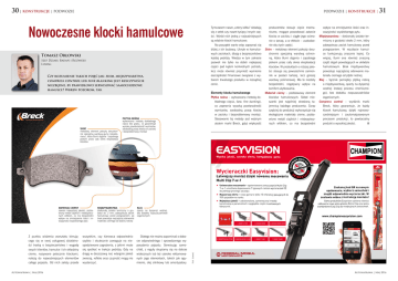30 | KONSTRUKCJE | PODWOZIE PODWOZIE | KONSTRUKCJE | Tomasz Orłowski Szef Działu Badań i Rozwoju Lumag Czy rozumienie takich pojęć jak: shim, międzywarstwa, compress control lub fine blanking jest rzeczywiście niezbędne, by prawidłowo serwisować samochodowe hamulce? Wbrew pozorom, tak SHIM metalowy element pokryty dwustron nie specjalną warstwą gumy (eleasto meru), która tłumi drgania i zapobiega piskom przez cały okres eksploatacji klocków Elementy klocka hamulcowego Płytka nośna – wytwarzana metodą do kładnego cięcia, (tzw. fine banking), co zapewnia wysoką powtarzalność wymiarów, swobodną pracę klocka w zacisku i bezproblemowy montaż. Stosowanie tej metody jest ważnym atutem marki Breck, gdyż większość PŁYTKA NOŚNA wytwarzana metodą dokładnego cięcia bez gradu, co gwarantuje wysoką powtarzalność wymiarów, swobodną pracę klocka w zacisku i bezproblemowy montaż producentów stosuje cięcie mecha niczne, mogące powodować zatarcie klocka w zacisku i ciągłe jego ociera nie o tarczę, a w efekcie – uszkodze nie obu tych części. Shim – metalowy element pokryty dwu stronnie specjalną warstwą ochron ną, która tłumi drgania i zapobiega piskom przez cały okres eksploatacji klocków. W produktach o niższej jako ści stosuje się powszechnie zamien nik w postaci tańszej, lecz gorszej warstwy polimerowej. Ma to niestety bezpośredni, negatywny wpływ na komfort użytkowania. Materiał cierny – podstawowy element klocków hamulcowych. Skład mie szanki jest najpilniej strzeżoną ta jemnicą każdego producenta. Coraz częściej do produkcji wykorzystuje się ekologiczne materiały cierne, pozba wione metali ciężkich i niebezpiecz nych włókien, co ma bezpośredni Łatwiejszy montaż dzięki nowemu mocowaniu Multi Clip 7-w-1 Uniwersalne mocowanie – opatentowane zamocowanie Multi Clip 7-w-1 umożliwia dopasowanie 7 typowych ramion wycieraczek OE do jednego prostego zaczepu. Najszersza oferta – nowa gama to tylko 15 referencji pasujących do 95% pojazdów na rynku. Z punktu widzenia warsztatu kierują cego się w swej usługowej działalno ści troską o bezpieczeństwo i wygodę swych klientów, hamulce i ich okładziny cierne, nazywane potocznie klockami, należą do najważniejszych elementów całego pojazdu. Od nich zależy przede Autonaprawa | Maj 2016 MIĘDZYWARSTWA doskonały izolator termiczny o gru bości ok. 2 mm; zabezpiecza zacisk hamulcowy przed przegrzaniem; jej brak powoduje najczęściej oderwanie materiału ciernego od blachy nośnej wszystkim, czy kierowca odpowiednio szybko i skutecznie zareaguje na nie spodziewane zagrożenia, z jakimi może się spotkać w trakcje podróży. Gdy na drogę w deszczową noc wtargnie jakieś zwierzę, refleks oraz czujność mogą nie wystarczyć. KLEJ oparty na dyspersji wodnej, bez dodatku rozpuszczalników organicznych E IWERSA Zeskanuj kod QR na nowym opakowaniu, wybierz samochód i znajdź odpowiednie wycieraczki. W zestawie wideo z instrukcją montażu! Gama produktów Easyvision zawiera również całkowicie nowe pióra płaskie Retro Clip oraz pióra standardowe Easy Clip do tradycyjnych zastosowań. www.championeasyvision.com 7-w-1 1. BAGNET 22 MM Dlatego nie można zapominać o dobo rze odpowiedniego i sprawdzonego wy posażenia pojazdu. Serwisując samo chód, z reguły skupiamy się na dobrze widocznych lub też szeroko reklamowa nych jego elementach, takich jak ogu mienie, olej silnikowy lub amortyzatory. UN IE MULTI C 4. SWORZEŃ BOCZNY 19 MM 5. SWORZEŃ BOCZNY 22 MM 2. ZATRZASK GÓRNY 3. ZATRZASK GÓRNY (BMW) 6. BAGNET 19 MM 7. BAGNET PŁASKI Fot. Lumag MATERIAŁ CIERNY zawsze najwyższej jakości, pozba wiony metali ciężkich i niebezpiecz nych włókien, co ma bezpośredni wpływ na zmniejszenie ilości i in wazyjności wydzielanego pyłu Najwyższa jakość – udoskonalona, symetryczna i trwała konstrukcja o parametrach i wyglądzie części montowanych fabrycznie. M O CO Wycieraczki Easyvision: AN L IP W Wysoka jakość, szeroka oferta, kompaktowa gama wpływ na zmniejszenie ilości oraz in wazyjności wydzielanego pyłu. Międzywarstwa – doskonały izolator ter miczny o grubości około 2 mm, który zabezpiecza zacisk hamulcowy przed przegrzaniem. W rezultacie hamul ce funkcjonują znacznie lepiej. Co więcej, tłumi ona również znaczną część drgań powstających w układzie hamulcowym. Brak międzywarstwy powoduje najczęściej oderwanie ma teriału ciernego od płytki nośnej. Klej – łącznik pomiędzy płytką nośną a międzywarstwą, oparty na dyspersji wodnej (rodzaj procesu chemiczne go), bez dodatku rozpuszczalników organicznych. Compress control – wyróżnik marki Breck, który gwarantuje, że każdy klocek hamulcowy, dzięki najnowo cześniejszym i zautomatyzowanym procesom produkcji, to powtarzalny produkt o wysokiej jakości. n LN Nowoczesne klocki hamulcowe Tymczasem nasze „cztery kółka” składają się z setek czy nawet tysięcy innych czę ści. Wśród nich jedną z najważniejszych są właśnie klocki hamulcowe. Na początek warto więc zapoznać się bliżej z ich budową. Ukryte w hamulco wych zaciskach, dbają o bezpieczeństwo każdej podróży. Wiedza w tym zakresie pozwoli nie tylko na dobór najlepszej części pod kątem konkretnych potrzeb, lecz może również przynieść wymierne oszczędności finansowe związane z wy borem trwalszego produktu w rozsądnej cenie. 31 champion-easyvisionwipers-PL-185x131.indd 1 17/08/2015 12:41:07 Autonaprawa | Maj 2016