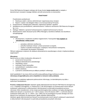 Firma FSB Piekarnia Strzegom należąca do Grupy Aryzta (www.aryzta.com) w związku z dynamicznym rozwojem swojego Zakładu zatrudni pracownika na stanowisko: PRAKTYKANT 1. 2. 3. 4. Przedmiotem praktyki jest: Realizacja zadań z zakresu administracji i organizacja pracy recepcji Rejestr i nadzór nad obiegiem faktur oraz korespondencji firmowej Przyjmowanie i obsługa gości jednostki, organizacja spotkań i zjazdów. Współpraca przy prowadzeniu, administrowaniu i nadzorze nad biurem FSB Piekarnia Strzegom Sp. z o.o. Obsługa i dbałość o sprawne funkcjonowanie urządzeń technicznych w biurze. Wykonywanie zadań zlecanych przez Office Managera, Dyrektora Zakładu oraz Dyrektora Zarządzającego. Jeżeli jesteś absolwentem / studentem studiów magisterskich / licencjackich bez względu na specjalizację i rodzaj uczelni i: o posiadasz zdolności analityczne, o potrafisz budować relacje i umiesz pracować w zespole, o myślisz w sposób innowacyjny i znajdujesz nietuzinkowe rozwiązania, o interesujesz się światem i biznesem, FSB jest najlepszym miejscem do zdobycia doświadczenia zawodowego w dużej i międzynarodowej organizacji!!! Oferujemy: Oprócz pracy w miłym środowisku oferujemy Ci: poszerzenie horyzontów zdobycia doświadczenia zawodowego satysfakcję z pracy realizację Twoich pomysłów samodzielność i swobodę w pracy telefon służbowy a ponad to zaświadczenie po odbyciu praktyki i referencje. Jeżeli spodobała Ci się nasza oferta prześlij swoją aplikację drogą mailową na adres: [email protected] (z dopiskiem w temacie maila praktyka). Dziękujemy za nadesłane ogłoszenia jednocześnie informując, że skontaktujemy się tylko z wybranymi kandydatami. Prosimy o dołączenie klauzuli: Udzielam zgody Administratorowi Danych FSB Piekarnia Strzegom Sp. z o.o. z siedzibą w Strzegomiu, ul. Piekarnicza 2, 58-150 Strzegom na przetwarzanie moich danych osobowych ujawnionych w dokumentach rekrutacyjnych na potrzeby prowadzenia procesu rekrutacji. Mam świadomość, że bez mojej wyraźnej zgody dane osobowe nie będą udostępniane odbiorcom danych w rozumieniu art. 7 pkt 6 ustawy z dnia 29 sierpnia 1997 r. o ochronie danych osobowych (tekst jedn. Dz. U. z 2014 r. poz. 1182) oraz że przysługuje mi prawo dostępu do treści danych oraz możliwość ich poprawiania. Zgody udzielam dobrowolnie. Udzielam zgody Administratorowi Danych na przetwarzanie moich danych osobowych ujawnionych w dokumentach rekrutacyjnych na potrzeby prowadzenia przyszłych rekrutacji.