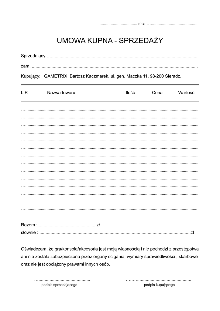 .................................. dnia ….......................................... UMOWA KUPNA - SPRZEDAŻY Sprzedający:…....................................................................................................................... zam. ....................................................................................................................................... Kupujący: GAMETRIX Bartosz Kaczmarek, ul. gen. Maczka 11, 98-200 Sieradz. L.P. Nazwa towaru Ilość Cena Wartość …............................................................................................................................................................ …............................................................................................................................................................ …............................................................................................................................................................ …............................................................................................................................................................ …............................................................................................................................................................ …............................................................................................................................................................ …............................................................................................................................................................ …............................................................................................................................................................ …............................................................................................................................................................ …............................................................................................................................................................ …............................................................................................................................................................ …............................................................................................................................................................ …............................................................................................................................................................ …........................................................................................................................................................... Razem :............................................... zł słownie : ...........................................................................................................................zł Oświadczam, że gra/konsola/akcesoria jest moją własnością i nie pochodzi z przestępstwa ani nie została zabezpieczona przez organy ścigania, wymiary sprawiedliwości , skarbowe oraz nie jest obciążony prawami innych osób. ….......................................... podpis sprzedającego …..…............................................ podpis kupującego