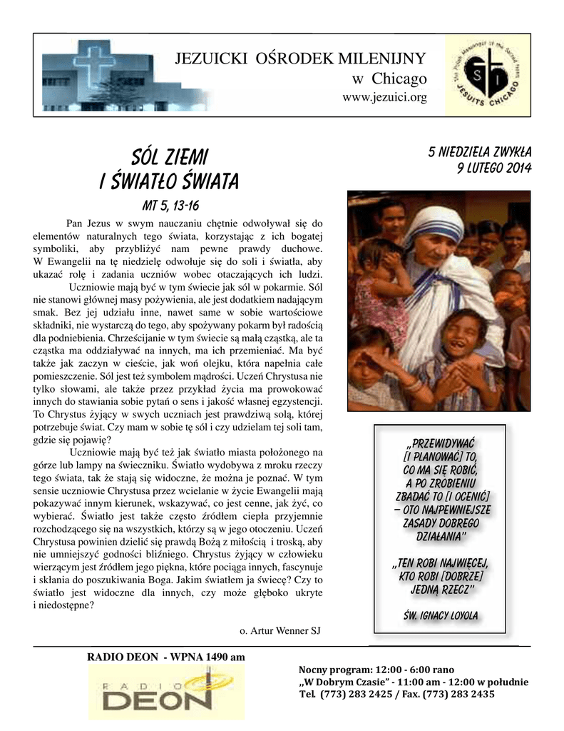 JEZUICKI OŚRODEK MILENIJNY w Chicago www.jezuici.org 5 niedziela Zwykła 9 lutego 2014 Sól ziemi i światło świata Mt 5, 13-16 Pan Jezus w swym nauczaniu chętnie odwoływał się do elementów naturalnych tego świata, korzystając z ich bogatej symboliki, aby przybliżyć nam pewne prawdy duchowe. W Ewangelii na tę niedzielę odwołuje się do soli i światła, aby ukazać rolę i zadania uczniów wobec otaczających ich ludzi. Uczniowie mają być w tym świecie jak sól w pokarmie. Sól nie stanowi głównej masy pożywienia, ale jest dodatkiem nadającym smak. Bez jej udziału inne, nawet same w sobie wartościowe składniki, nie wystarczą do tego, aby spożywany pokarm był radością dla podniebienia. Chrześcijanie w tym świecie są małą cząstką, ale ta cząstka ma oddziaływać na innych, ma ich przemieniać. Ma być także jak zaczyn w cieście, jak woń olejku, która napełnia całe pomieszczenie. Sól jest też symbolem mądrości. Uczeń Chrystusa nie tylko słowami, ale także przez przykład życia ma prowokować innych do stawiania sobie pytań o sens i jakość własnej egzystencji. To Chrystus żyjący w swych uczniach jest prawdziwą solą, której potrzebuje świat. Czy mam w sobie tę sól i czy udzielam tej soli tam, gdzie się pojawię? Uczniowie mają być też jak światło miasta położonego na górze lub lampy na świeczniku. Światło wydobywa z mroku rzeczy tego świata, tak że stają się widoczne, że można je poznać. W tym sensie uczniowie Chrystusa przez wcielanie w życie Ewangelii mają pokazywać innym kierunek, wskazywać, co jest cenne, jak żyć, co wybierać. Światło jest także często źródłem ciepła przyjemnie rozchodzącego się na wszystkich, którzy są w jego otoczeniu. Uczeń Chrystusa powinien dzielić się prawdą Bożą z miłością i troską, aby nie umniejszyć godności bliźniego. Chrystus żyjący w człowieku wierzącym jest źródłem jego piękna, które pociąga innych, fascynuje i skłania do poszukiwania Boga. Jakim światłem ja świecę? Czy to światło jest widoczne dla innych, czy może głęboko ukryte i niedostępne? ,,Przewidywać [i planować] to, co ma się robić, a po zrobieniu zbadać to [i ocenić] – oto najpewniejsze zasady dobrego działania” ,,Ten robi najwięcej, kto robi [dobrze] jedną rzecz” św. Ignacy LOyola o. Artur Wenner SJ RADIO DEON - WPNA 1490 am Nocny program: 12:00 - 6:00 rano ,,W Dobrym Czasie” - 11:00 am - 12:00 w południe Tel. (773) 283 2425 / Fax. (773) 283 2435 PORZĄDEK MSZY ŚWIĘTYCH Poniedziałek - pi¹tek: 8:00, 18:00, 19:00 (radiowa: WCEV 1450) I piątek miesiąca: 8:00, 19:00, 20:30 Środa: 19:00 - nowenna do Matki Bożej Nieustającej Pomocy Sobota: 8:00, tylko w I sobotę miesiąca o 17:00 dla chorych, 19:00 Niedziela: 8:00 (radiowa), 9:30, 11:00, 13:00, 19:00, 20:30 -=- SpowiedŸ św.: od poniedziałku do soboty - 7:30 i 18:30, w niedzielę - pó³ godziny przed ka¿d¹ Msz¹ Œwiêt¹, w1. pi¹tek miesi¹ca - od 18:30 do 21:00 Adoracja Najświętszego Sakramentu - od poniedziałku do czwartku - od 18:30 do 19:00 sobota - od 18:00 do 19:00 Sanktuarium Najświętszego Serca Pana Jezusa Jezuicki Ośrodek Milenijny 5835 W. Irving Park Rd.; Chicago, IL 60634, Tel. 773 777 7000; fax 773 427 0126 www.jezuici.org e-mail: [email protected] Audycje Radia DEON: tel. 773 283 2425 Fax. 773 283 2435 Biuro czynne: od poniedziałku do piątku: 8:30 - 9:00, 15:30 - 20:30 sobota: 9:30 - 20:30, niedziela: 8:30 - 14:30, 18:30 - 21:30 Biblioteka czynna: sobota: 18:00 - 19:00; niedziela: 10:30 - 14:30; 19:00 - 21:00 Kawiarenka czynna: niedz.: 10:00 - 15:00, 19:00 - 22:00 Sacred Heart Mission House 4105 N. Avers Ave., Chicago, IL 60618 Tel. 773 588 74 76; fax 773 588 65 17 Rektor Sanktuarium i Przełożony Jezuitów o. Jerzy Sermak, SJ (773-588-7476 - ext. 224) o. Józef Birecki, SJ (773-777-7000 - ext. 121) o. Jerzy Mordarski, SJ (773-588-7476 - ext. 234) o. Jerzy Karpiński, SJ (773-588-7476 - ext. 237) o. Piotr Kochanowicz, SJ (773-588-7476 - ext. 227) br. Adam Poręba, SJ (773-777-7000 - ext. 122) Wszelkie ofiary i donacje prosimy kierowaæ na adres Sanktuarium. Donacje s¹ wolne od podatku i mo¿na je odpisywaæ przy rozliczeniu z IRS. TRANSMISJE RADIOWE I INTERNETOWE od poniedziałku do piątku,transmisja Mszy Św. z godz. 19:00 Radio WCEV 1450 (www.wcev1450.com) w niedziele: godz 8-9, Radio WCEV 1450, oraz Polskie Radio Chicago 1030 WNVR (www.polskieradio.com) Codziennie przez całą dobę: Kamera internetowa z Sanktuarium (obraz i dźwięk; używać Internet Explorer): www.jezuici.org - link „Transmisje na żywo” – wpisać jako użytkownik i hasło: 5835 INTENCJE MSZY ŚWIĘTYCH Niedziela, 9 II 2014 8:00 o potrzebne łaski dla Leontyny Szklarzewskiej z rodziną: za zmarłych z rodziny Szklarzewski 9:30 Zbiorowa 11:00 mąż, ojciec, syna i brat + Jan Kuczaj 13:00 + Franciszka Dworszczak w 1. rocznicę śmierci 19:00 Zbiorowa 20:30 + Stanisław Tokarski Poniedziałek, 10 II - św. Scholastyki 8:00 + Zofia Czuprynko, + + Waleria i Aleksander Kazimierczuk 18:00 dziękczynna w 80 rocznicę urodzin Wandy Roćko o zdrowie, błogosławieństwo i potrzebne łaski na dalsze lata 19:00 Zbiorowa Wtorek, 11 II - wspomnienie Najświętszej Maryi Panny z Lourdes (Światowy Dzień Chorych) 8:00 o łaskę zdrowia i Boże błogosławieństwo dla córki Doroty z okazji urodzin 18:00 + Bolesław Makowski 19:00 Zbiorowa Środa, 12 II 8:00 za Dobroczyńców Jezuickiego Ośrodka Milenijnego 18:00 + + Marianna i Edward Olszewscy, + + Edward i Zdzisław Olszewscy 19:00 Zbiorowa Czwartek, 13 II 8:00 + + Halina i Marek Łagodzcy 18:00 z okazji urodzin Diany i Danusi 19:00 Zbiorowa Piątek, 14 II - śś. Cyryla i Metodego, patronów Europy 8:00 + + Stanisław i Felicja Rakoczy, o spokój duszy i łaskę nieba 18:00 o Boże błogosławieństwo i zdrowie dla Barbary Michalski w dniu urodzin 19:00 Zbiorowa Sobota, 15 II - św. Klaudiusza la Colombiere 8:00 o dary Ducha Św. i przemianę ż