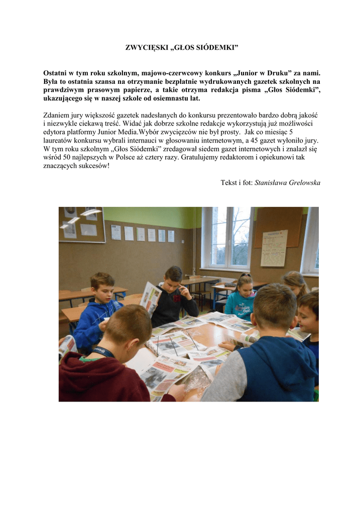 ZWYCIĘSKI „GŁOS SIÓDEMKI” Ostatni w tym roku szkolnym, majowo-czerwcowy konkurs „Junior w Druku” za nami. Była to ostatnia szansa na otrzymanie bezpłatnie wydrukowanych gazetek szkolnych na prawdziwym prasowym papierze, a takie otrzyma redakcja pisma „Głos Siódemki”, ukazującego się w naszej szkole od osiemnastu lat. Zdaniem jury większość gazetek nadesłanych do konkursu prezentowało bardzo dobrą jakość i niezwykle ciekawą treść. Widać jak dobrze szkolne redakcje wykorzystują już możliwości edytora platformy Junior Media.Wybór zwycięzców nie był prosty. Jak co miesiąc 5 laureatów konkursu wybrali internauci w głosowaniu internetowym, a 45 gazet wyłoniło jury. W tym roku szkolnym „Głos Siódemki” zredagował siedem gazet internetowych i znalazł się wśród 50 najlepszych w Polsce aż cztery razy. Gratulujemy redaktorom i opiekunowi tak znaczących sukcesów! Tekst i fot: Stanisława Grelowska