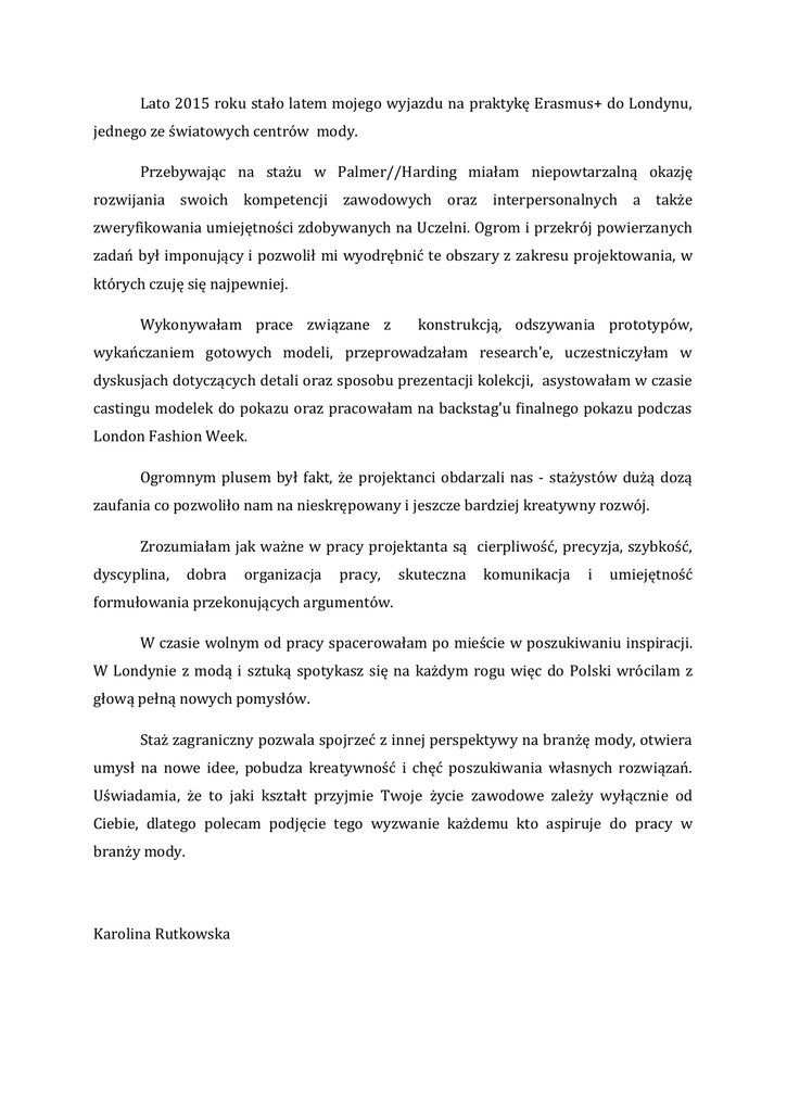 Lato 2015 roku stało latem mojego wyjazdu na praktykę Erasmus+ do Londynu, jednego ze światowych centrów mody. Przebywając na stażu w Palmer//Harding miałam niepowtarzalną okazję rozwijania swoich kompetencji zawodowych oraz interpersonalnych a także zweryfikowania umiejętności zdobywanych na Uczelni. Ogrom i przekrój powierzanych zadań był imponujący i pozwolił mi wyodrębnić te obszary z zakresu projektowania, w których czuję się najpewniej. Wykonywałam prace związane z konstrukcją, odszywania prototypów, wykańczaniem gotowych modeli, przeprowadzałam research'e, uczestniczyłam w dyskusjach dotyczących detali oraz sposobu prezentacji kolekcji, asystowałam w czasie castingu modelek do pokazu oraz pracowałam na backstag'u finalnego pokazu podczas London Fashion Week. Ogromnym plusem był fakt, że projektanci obdarzali nas - stażystów dużą dozą zaufania co pozwoliło nam na nieskrępowany i jeszcze bardziej kreatywny rozwój. Zrozumiałam jak ważne w pracy projektanta są cierpliwość, precyzja, szybkość, dyscyplina, dobra organizacja pracy, skuteczna komunikacja i umiejętność formułowania przekonujących argumentów. W czasie wolnym od pracy spacerowałam po mieście w poszukiwaniu inspiracji. W Londynie z modą i sztuką spotykasz się na każdym rogu więc do Polski wrócilam z głową pełną nowych pomysłów. Staż zagraniczny pozwala spojrzeć z innej perspektywy na branżę mody, otwiera umysł na nowe idee, pobudza kreatywność i chęć poszukiwania własnych rozwiązań. Uświadamia, że to jaki kształt przyjmie Twoje życie zawodowe zależy wyłącznie od Ciebie, dlatego polecam podjęcie tego wyzwanie każdemu kto aspiruje do pracy w branży mody. Karolina Rutkowska