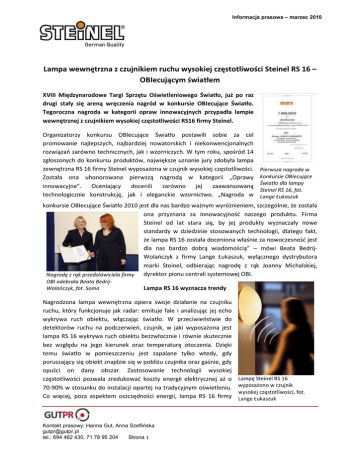 Informacja prasowa – marzec 2010 Lampa wewnętrzna z czujnikiem ruchu wysokiej częstotliwości Steinel RS 16 – OBIecującym światłem XVIII Międzynarodowe Targi Sprzętu Oświetleniowego Światło, już po raz drugi stały się areną wręczenia nagród w konkursie OBIecujące Światło. Tegoroczna nagroda w kategorii opraw innowacyjnych przypadła lampie wewnętrznej z czujnikiem wysokiej częstotliwości RS16 firmy Steinel. Organizatorzy konkursu OBIecujące Światło postawili sobie za cel promowanie najlepszych, najbardziej nowatorskich i niekonwencjonalnych rozwiązań zarówno technicznych, jak i wzorniczych. W tym roku, spośród 14 zgłoszonych do konkursu produktów, największe uznanie jury zdobyła lampa zewnętrzna RS 16 firmy Steinel wyposażona w czujnik wysokiej częstotliwości. Została ona uhonorowana pierwszą nagrodą w kategorii „Oprawy innowacyjne”. Oceniający docenili zarówno jej zaawansowaną technologicznie konstrukcję, jak i eleganckie wzornictwo. „Nagroda w Pierwsza nagroda w konkursie OBIecujące Światło dla lampy Steinel RS 16, fot. Lange Łukaszuk konkursie OBIecujące Światło 2010 jest dla nas bardzo ważnym wyróżnieniem, szczególnie, że została ona przyznana za innowacyjność naszego produktu. Firma Steinel od lat stara się, by jej produkty wyznaczały nowe standardy w dziedzinie stosowanych technologii, dlatego fakt, że lampa RS 16 została doceniona właśnie za nowoczesność jest dla nas bardzo dobrą wiadomością” – mówi Beata BedrijWolańczyk z firmy Lange Łukaszuk, wyłącznego dystrybutora marki Steinel, odbierając nagrodę z rąk Joanny Michalskiej, dyrektor pionu centrali systemowej OBI. Nagrodę z rąk przedstawiciela firmy OBI odebrała Beata BedrijWolańczyk, fot. Soma Lampa RS 16 wyznacza trendy Nagrodzona lampa wewnętrzna opiera swoje działanie na czujniku ruchu, który funkcjonuje jak radar: emituje fale i analizując jej echo wykrywa ruch obiektu, włączając światło. W przeciwieństwie do detektorów ruchu na podczerwień, czujnik, w jaki wyposażona jest lampa RS 16 wykrywa ruch obiektu bezzwłocznie i równie skutecznie bez względu na jego kierunek oraz temperaturę otoczenia. Dzięki temu światło w pomieszczeniu jest zapalane tylko wtedy, gdy poruszający się obiekt znajdzie się w pobliżu czujnika oraz gaśnie, gdy opuści on dany obszar. Zastosowanie technologii wysokiej częstotliwości pozwala zredukować koszty energii elektrycznej aż o 70-90% w stosunku do instalacji opartej na tradycyjnym oświetleniu. Co więcej, poza aspektem oszczędności energii, lampa RS 16 firmy Kontakt prasowy: Hanna Gut, Anna Szeflińska [email protected] tel.: 694 462 430, 71 78 95 204 Strona 1 Lampę Steinel RS 16 wyposażono w czujnik wysokej częstotliwości, fot. Lange Łukaszuk Informacja prasowa – marzec 2010 Steinel pozwala także zwiększyć bezpieczeństwo. Wysoka dokładność czujnika eliminuje sytuacje, w których bardzo łatwo o wypadek, np. po wejściu do nieoświetlonej piwnicy lub klatki schodowej. Zasięg detektora można regulować bezstopniowo w zakresie od jednego do ośmiu metrów (średnica). Lampa RS 16 firmy Steinel posiada zintegrowany czujnik zmierzchowy (2 do 2000 luxów). Użytkownik ma również możliwość ustawienia czasu, przez jaki lampa RS 16 pozostanie zapalona po tym, jak czujnik przestanie wykrywać ruch. Z uwagi na to, że szkło nie jest przeszkodą dla fal wysokiej częstotliwości, czujniki te moga być umieszczane wewnątrz lamp, co uczyni je niewidocznymi od zewnątrz. Dzięki temu żadne elementy czujników lamp nie zakłócają atrakcyjnego wyglądu lamp, a tym samym nie prowokują do kradzieży czy wandalizmu w miejscach publicznych. Dane techniczne lampy Staine RS 16 Wymiary (średnica x wysokość) 275 x 95mm Moc max 60W / E27 Kąt wykrywania 360 st. z kątem rozwarcia 160 st. Zasięg 1 - 8m, ustawiany bezstopniowo Napięcie zasilania 230-240V, 50Hz Technika wysokich częstotliwości 5,8 GHz Moc nadawcza ok. 10mW Ustawienie progu czułości zmierzchowej 2 - 2000 lx Ustawianie czasu 5 sek. - 15 min. Rodzaj ochrony IP 21 Okres gwarancji 3 lata Producent: STEINEL Dystrybutor: Lange Łukaszuk sp. j. www.langelukaszuk.pl Wyłącznym dystrybutorem narzędzi i oświetlenia marki Steinel - światowego lidera w produkcji narzędzi grzewczych - jest Lange Łukaszuk s. j. LANGE ŁUKASZUK rozpoczęła swoją działalność w roku 1987. Od tej pory skutecznie i z powodzeniem działa na konkurencyjnym rynku elektronarzędzi, narzędzi ręcznych, osprzętu, oświetlenia automatycznego i klejów termotopliwych. Początkowa działalność opierała się na dystrybucji produktów firmy Steinel, której od 1990 roku Lange Łukaszuk s. j. jest przedstawicielem w Polsce. Steinel w Polsce to nie tylko produkty i osprzęt, to także prawdziwie niemiecka solidność i dbałość o wysoką jakość obsługi klientów, zapewnienie szybkiego i prostego dostępu do informacji na temat firmy i jej oferty oraz szybko działająca sieć serwisu gwarancyjnego i pogwarancyjnego, zorganizowana przez Lange Łukaszuk Sp.j. Kontakt prasowy: Hanna Gut, Anna Szeflińska [email protected] tel.: 694 462 430, 71 78 95 204 Strona 2