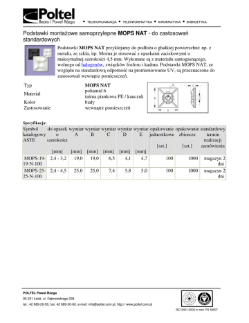 • • • • Podstawki monta owe samoprzylepne MOPS NAT - do zastosowa standardowych Podstawki MOPS NAT przyklejamy do podło a o gładkiej powierzchni: np. z metalu, ze szkła, itp. Mo na je stosowa z opaskami zaciskowymi o maksymalnej szeroko ci 4,5 mm. Wykonane s z materiału samogasn cego, wolnego od halogenów, zwi zków fosforu i kadmu. Podstawki MOPS NAT, ze wzgl du na standardow odporno na promieniowanie UV, s przeznaczone do zastosowa wewn trz pomieszcze . Typ Materiał Kolor Zastosowanie MOPS NAT poliamid 6 ta ma piankowa PE / kauczuk biały wewn trz pomieszcze Specyfikacja: Symbol do opasek wymiar wymiar wymiar wymiar wymiar opakowanie opakowanie standardowy katalogowy o A B C D E jednostkowe zbiorcze termin ASTE szeroko ci realizacji [szt.] [szt.] zamówienia [mm] [mm] [mm] [mm] [mm] [mm] MOPS-19- 2,4 - 3,2 19,0 19,0 6,5 4,1 4,7 100 1000 magazyn 2 19-N-100 dni MOPS-25- 2,4 - 4,5 25,0 25,0 7,4 5,8 5,0 100 1000 magazyn 2 25-N-100 dni POLTEL Paweł Rózga 93-231 Łód , ul. D browskiego 238 tel.: 42 689-20-50, fax: 42 689-20-60, e-mail: [email protected], http:// www.poltel.com.pl ISO 9001:2000 nr cert. FS 59507