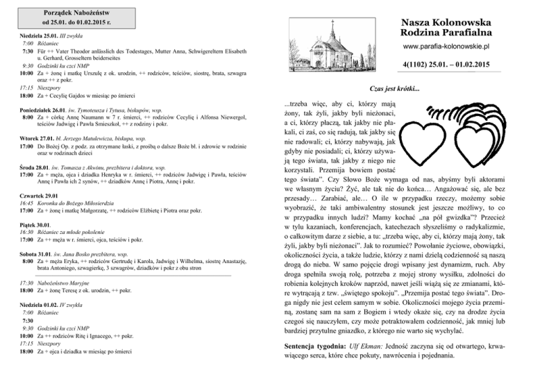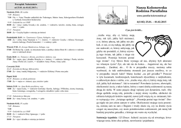 Porządek Nabożeństw od 25.01. do 01.02.2015 r. Niedziela 25.01. III zwykła 7:00 Różaniec 7:30 Für ++ Vater Theodor anlässlich des Todestages, Mutter Anna, Schwigereltern Elisabeth u. Gerhard, Grosseltern beiderseites 9:30 Godzinki ku czci NMP 10:00 Za + żonę i matkę Urszulę z ok. urodzin, ++ rodziców, teściów, siostrę, brata, szwagra oraz ++ z pokr. 17:15 Nieszpory 18:00 Za + Cecylię Gajdos w miesiąc po śmierci Poniedziałek 26.01. św. Tymoteusza i Tytusa, biskupów, wsp. 8:00 Za + córkę Annę Naumann w 7 r. śmierci, ++ rodziców Cecylię i Alfonsa Niewergol, teściów Jadwigę i Pawła Smieszkoł, ++ z rodziny i pokr. Wtorek 27.01. bł. Jerzego Matulewicza, biskupa, wsp. 17:00 Do Bożej Op. z podz. za otrzymane łaski, z prośbą o dalsze Boże bł. i zdrowie w rodzinie oraz w rodzinach dzieci Środa 28.01. św. Tomasza z Akwinu, prezbitera i doktora, wsp. 17:00 Za + męża, ojca i dziadka Henryka w r. śmierci, ++ rodziców Jadwigę i Pawła, teściów Annę i Pawła ich 2 synów, ++ dziadków Annę i Piotra, Annę i pokr. Czwartek 29.01 16:45 Koronka do Bożego Miłosierdzia 17:00 Za + żonę i matkę Małgorzatę, ++ rodziców Elżbietę i Piotra oraz pokr. Piątek 30.01. 16:30 Różaniec za młode pokolenie 17:00 Za ++ męża w r. śmierci, ojca, teściów i pokr. Sobota 31.01. św. Jana Bosko prezbitera, wsp. 8:00 Za + męża Eryka, ++ rodziców Gertrudę i Karola, Jadwigę i Wilhelma, siostrę Anastazję, brata Antoniego, szwagierkę, 3 szwagrów, dziadków i pokr z obu stron ————————–—–———————————————————————— 17:30 Nabożeństwo Maryjne 18:00 Za + żonę Teresę z ok. urodzin, ++ pokr. Niedziela 01.02. IV zwykła 7:00 Różaniec 7:30 9:30 Godzinki ku czci NMP 10:00 Za ++ rodziców Ritę i Ignacego, ++ pokr. 17:15 Nieszpory 18:00 Za + ojca i dziadka w miesiąc po śmierci Nasza Kolonowska Rodzina Parafialna www.parafia-kolonowskie.pl 4(1102) 25.01. – 01.02.2015 Czas jest krótki... ...trzeba więc, aby ci, którzy mają żony, tak żyli, jakby byli nieżonaci, a ci, którzy płaczą, tak jakby nie płakali, ci zaś, co się radują, tak jakby się nie radowali; ci, którzy nabywają, jak gdyby nie posiadali; ci, którzy używają tego świata, tak jakby z niego nie korzystali. Przemija bowiem postać tego świata”. Czy Słowo Boże wymaga od nas, abyśmy byli aktorami we własnym życiu? Żyć, ale tak nie do końca… Angażować się, ale bez przesady… Zarabiać, ale… O ile w przypadku rzeczy, możemy sobie wyobrazić, że taki ambiwalentny stosunek jest jeszcze możliwy, to co w przypadku innych ludzi? Mamy kochać „na pół gwizdka”? Przecież w tylu kazaniach, konferencjach, katechezach słyszeliśmy o radykalizmie, o całkowitym darze z siebie, a tu: „trzeba więc, aby ci, którzy mają żony, tak żyli, jakby byli nieżonaci”. Jak to rozumieć? Powołanie życiowe, obowiązki, okoliczności życia, a także ludzie, którzy z nami dzielą codzienność są naszą drogą do nieba. W samo pojęcie drogi wpisany jest dynamizm, ruch. Aby droga spełniła swoją rolę, potrzeba z mojej strony wysiłku, zdolności do robienia kolejnych kroków naprzód, nawet jeśli wiążą się ze zmianami, które wytrącają z tzw. „świętego spokoju”. „Przemija postać tego świata”. Droga nigdy nie jest celem samym w sobie. Okoliczności mojego życia przeminą, zostanę sam na sam z Bogiem i wtedy okaże się, czy na drodze życia czegoś się nauczyłem, czy może potraktowałem codzienność, jak mniej lub bardziej przytulne gniazdko, z którego nie warto się wychylać. Sentencja tygodnia: Ulf Ekman: Jedność zaczyna się od otwartego, krwawiącego serca, które chce pokuty, nawrócenia i pojednania. 4/2015 Nasza Książka: W zakrystii do nabycia w formie cegiełki, książka pt. „Kapliczki i krzyże przydrożne na terenie Gminy Kolonowskie”, której autorem jest p. Gerard Mańczyk. Cegiełki w cenie minimum 10 zł. zostają przeznaczone na cele remontowe naszej świątyni. Bóg zapłać za zakup i przekazaną kwotę w ubiegłą niedzielę: 2.305 zł. ————————–—————–——-–————————————— Opowiadanie: Bardzo, bardzo dawno temu, w pewnej malutkiej wioseczce znajdował się mały warsztat stolarski. Pewnego dnia, kiedy nie było w nim właściciela, wszystkie jego narzędzia pracy zwołały między sobą walne zebranie. Posiedzenie było długie, a czasami wręcz wybuchowe. Zastanawiano się bowiem nad usunięciem z nobliwej wspólnoty niektórych jej członków. Jeden z uczestników przemówił w te słowa: Powinniśmy usunąć z naszych szeregów naszą siostrę Piłę, która jest nazbyt ostra i skrzypie zębami. Ma najzjadliwszy na całym świecie charakter. Ktoś inny dorzucił: Nie możemy również trzymać w naszych szeregach naszego brata Hebla: z niczym się nie zgadza i wszystko pomniejsza, obdziera ze skóry wszystko to, co spotka. Wiemy dobrze, że nasz brat Młotek protestował ktoś inny - ma twardy i gwałtowny charakter. Powiedziałbym wręcz, że uwielbia bić. Sposób, w jaki upiera się przy wszystkim, jest nie do zniesienia, a jego głos doprowadza nas do szału. Pozbądźmy się go. A gwoździe? Czy można żyć z ludźmi, którzy doczepiają się do wszystkiego? Nie chcemy ich więcej! To samo z Pilnikiem i Skrobakiem. Współżycie z nimi to nieustające tarcie. Niech opuści nas również Szklany Papier, którego jedynym celem w życiu jest ścieranie się ze wszystkimi! W ten sposób dyskutowały ze sobą coraz bardziej żywiołowo narzędzia stolarza. Wszyscy mówili na raz. Młotek żądał usunięcia Pilnika i Skrobaka, te natomiast chciały się pozbyć Młotka i tak dalej. Na koniec zebrania wszyscy żądali, aby usunąć wszystkich. Wreszcie narada została przerwana nagłym powrotem stolarza. Kiedy wszystkie narzędzia zobaczyły go zbliżającego się do stolarskiego stołu, naty
