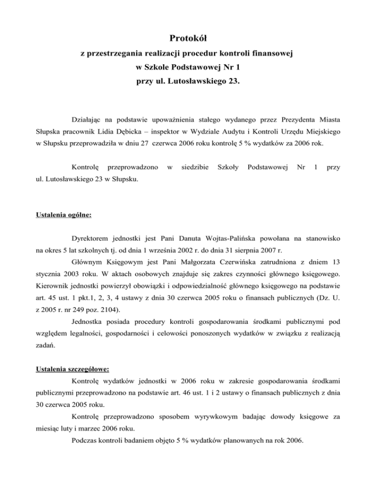 Protokół z przestrzegania realizacji procedur kontroli finansowej w Szkole Podstawowej Nr 1 przy ul. Lutosławskiego 23. Działając na podstawie upoważnienia stałego wydanego przez Prezydenta Miasta Słupska pracownik Lidia Dębicka – inspektor w Wydziale Audytu i Kontroli Urzędu Miejskiego w Słupsku przeprowadziła w dniu 27 czerwca 2006 roku kontrolę 5 % wydatków za 2006 rok. Kontrolę przeprowadzono w siedzibie Szkoły Podstawowej Nr 1 przy ul. Lutosławskiego 23 w Słupsku. Ustalenia ogólne: Dyrektorem jednostki jest Pani Danuta Wojtas-Palińska powołana na stanowisko na okres 5 lat szkolnych tj. od dnia 1 września 2002 r. do dnia 31 sierpnia 2007 r. Głównym Księgowym jest Pani Małgorzata Czerwińska zatrudniona z dniem 13 stycznia 2003 roku. W aktach osobowych znajduje się zakres czynności głównego księgowego. Kierownik jednostki powierzył obowiązki i odpowiedzialność głównego księgowego na podstawie art. 45 ust. 1 pkt.1, 2, 3, 4 ustawy z dnia 30 czerwca 2005 roku o finansach publicznych (Dz. U. z 2005 r. nr 249 poz. 2104). Jednostka posiada procedury kontroli gospodarowania środkami publicznymi pod względem legalności, gospodarności i celowości ponoszonych wydatków w związku z realizacją zadań. Ustalenia szczegółowe: Kontrolę wydatków jednostki w 2006 roku w zakresie gospodarowania środkami publicznymi przeprowadzono na podstawie art. 46 ust. 1 i 2 ustawy o finansach publicznych z dnia 30 czerwca 2005 roku. Kontrolę przeprowadzono sposobem wyrywkowym badając dowody księgowe za miesiąc luty i marzec 2006 roku. Podczas kontroli badaniem objęto 5 % wydatków planowanych na rok 2006. Według planu jednostkowego dochodów i wydatków budżetowych na rok 2006, wydatki wynoszą: Rozdział 80101 1.913.540,00 80146 8.560,00 85101 84.470,00 85415 47.058,00 80195 21.951,00 razem: 2.075.579,00 x 5 % = 103.778,95 Kontroli poddano wydatki w § 4010: Sprawdzono wynagrodzenia wypłacone w miesiącu lutym i marcu 2006 r. : LUTY 2006 r.: ◄Lista płac nr 9: -brutto 77.228,70 -netto 48.748,66 -zaliczka na podatek dochodowy 4.768,00 -ZUS pracownika 14.207,56 -zdrowotne 5.482,95 -potrącenia 5.922,47 -zasiłki rodz. -1.900,94 ◄Lista płac nr 10: -brutto 4.398,79 -netto 2.938,07 -zaliczka na podatek dochodowy 336,00 -ZUS pracownika 820,00 -zdrowotne 311,74 -potrącenia 68,28 -zasiłek rodz. -75,30 ◄Lista płac nr 11 -brutto 5.225,16 -netto 4.926,94 -zaliczka na podatek dochodowy 275,00 -ZUS pracownika 938,33 -zdrowotne 356,73 -potrącenia 534,76 -zasiłki chorob. -1.806,60 ◄Lista płac nr 12: -brutto 11.283,98 -netto 6.943,70 -zaliczka na podatek dochodowy 410,00 -ZUS pracownika 1.989,64 -zdrowotne 802,72 -potrącenia 1.352,92 -zasiłek rodzin. -215,00 ◄Lista płac nr 13: -brutto 683,40 -netto 557,84 -zaliczka na podatek dochodowy 7,00 -ZUS pracownika 66,35 -zdrowotne 52,21 ◄Lista płac nr 14: -brutto 6.388,65 -netto 4.152,95 -zaliczka na podatek dochodowy 586,00 -ZUS pracownika 454,45 -zdrowotne 1.195,25 ◄Lista płac nr 15: -brutto 63,56 -netto 42,14 -zaliczka na podatek dochodowy 5,00 -ZUS pracownika 11,90 -zdrowotne 4,52 MARZEC 2006 roku: ◄Lista płac nr 16: -brutto 76.235,12 -netto 48.330,80 -zaliczka na podatek dochodowy 4.650,00 -ZUS pracownika 14.178,03 -zdrowotne 5.410,47 -potrącenia 5.597,12 -zasiłek rodzin. -1.931,40 ◄Lista płac nr 17 obsługi: brutto 4.478,52 -netto 2.927,46 -zaliczka na podatek dochodowy 341,00 -ZUS pracownika 837,94 -zdrowotne 318,54 -potrącenia 53,58 ◄Lista płac nr 18: -brutto 82.769,87 -netto 53.824,27 -zaliczka na podatek dochodowy 7.572,00 -ZUS pracownika 15.486,26 -zdrowotne 5.887,34 ◄Lista płac nr 19: -brutto 3.889,63 -netto 2.530,22 -zaliczka na podatek dochodowy 355,00 -ZUS pracownika 727,73 -zdrowotne 467,53 ◄Lista płac nr 20: -brutto 6.572,97 -netto 4.274,62 -zaliczka na podatek dochodowy 601,00 -ZUS pracownika 1.229,82 -zdrowotne 467,53 ◄Lista płac nr 21: -brutto 12.376,88 -netto 8.048,84 -zaliczka na podatek dochodowy 1.132,00 -ZUS pracownika 2.315,69 -zdrowotne 880,35 ◄Lista płac nr 22: -brutto 1.290,04 -netto 838,94 -ZUS pracownika 118,00 -zaliczka na podatek dochodowy 241,35 -zdrowotne 1,75 ◄Lista płac nr 23: -brutto 288,12 -netto 187,72 -zaliczka na podatek dochodowy 26,00 -ZUS pracownika 53,91 -zdrowotne 20,49 ◄Lista płac nr 24: -brutto 5.557,94 -netto 5.300,29 -zaliczka na podatek dochodowy 305,00 -ZUS pracownika 1.000,64 -zdrowotne 380,39 -potrącenia 571,76 ◄Lista płac nr 25: -brutto 11.388,60 -netto 7.176,04 -ZUS pracownika 2.051,47 -zaliczka na podatek dochodowy 413,00 -zdrowotne 810,17 ◄Lista płac nr 26: -brutto 860,87 -netto 623,57 -zaliczka na podatek dochodowy 15,00 -ZUS pracownika 161,06 -zdrowotne 61,24 ◄Lista płac nr 27: -brutto 7.871,82 -netto 5.119,09 -ZUS pracownika 1.472,82 -zaliczka na podatek dochodowy 720,00 -zdrowotne 559,91 ◄Lista płac nr 28: -brutto 292,32 -netto 189,85 -zaliczka na podatek dochodowy 27,00 -ZUS pracownika 54,68 -zdrowotne 20,79 Sprawdzono kwotę wydatków brutto w wysokości: 314.144,94 Listy wypłat wynagrodzeń są sporządzane prawidłowo, zawierają datę sporządzenia i wypłaty, są opieczętowane i podpisane przez specjalistę d/s administracyjno-finansowych, głównego księgowego oraz Dyrektora jednostki. Podczas przeprowadzonych czynności kontrolnych i po dokonaniu szczegółowej analizy dokumentacji źródłowej – nieprawidłowości nie stwierdzono. Wynagrodzenia w Szkole Podstawowej Nr 1 w Słupsku wypłacane są zgodnie z obowiązującymi przepisami prawa i aktami wewnętrznymi jednostki. Wyrywkowej kontroli poddano naliczenie wynagrodzeń następujących pracowników: Dyrektor: wyn. zasadnicze- 2.059,00 dodatek stażowy- 329,44 dodatek motywacyjny- 230,00 funkcyjny- 500,00 Nauczyciel : wyn. zasadnicze- 1.716,00 dodatek stażowy- 120,12 Nauczyciel : wyn. zasadnicze- 2.059,00 dodatek stażowy- 308,85 dodatek za wychowawstwo- 30,00 Kierownik gospodarczy: kat. zaszeregowania:XV wyn. zasadnicze- 1.315,00 d