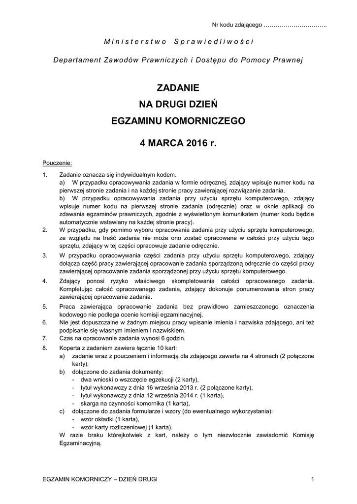 Nr kodu zdającego ………………………….. Ministerstwo Sprawiedliwości Departament Zawodów Prawniczych i Dostępu do Pomocy Prawnej ZADANIE NA DRUGI DZIEŃ EGZAMINU KOMORNICZEGO 4 MARCA 2016 r. Pouczenie: 1. 2. Zadanie oznacza się indywidualnym kodem. a) W przypadku opracowywania zadania w formie odręcznej, zdający wpisuje numer kodu na pierwszej stronie zadania i na każdej stronie pracy zawierającej rozwiązanie zadania. b) W przypadku opracowywania zadania przy użyciu sprzętu komputerowego, zdający wpisuje numer kodu na pierwszej stronie zadania (odręcznie) oraz w oknie aplikacji do zdawania egzaminów prawniczych, zgodnie z wyświetlonym komunikatem (numer kodu będzie automatycznie wstawiany na każdej stronie pracy). W przypadku, gdy pomimo wyboru opracowania zadania przy użyciu sprzętu komputerowego, ze względu na treść zadania nie może ono zostać opracowane w całości przy użyciu tego sprzętu, zdający w tej części opracowuje zadanie odręcznie. 3. W przypadku opracowywania części zadania przy użyciu sprzętu komputerowego, zdający dołącza część pracy zawierającej opracowanie zadania sporządzoną odręcznie do części pracy zawierającej opracowanie zadania sporządzonej przy użyciu sprzętu komputerowego. 4. Zdający ponosi ryzyko właściwego skompletowania całości opracowanego zadania. Kompletując całość opracowanego zadania, zdający dokonuje ponumerowania stron pracy zawierającej opracowanie zadania. 5. Praca zawierająca opracowanie zadania bez prawidłowo zamieszczonego oznaczenia kodowego nie podlega ocenie komisji egzaminacyjnej. Nie jest dopuszczalne w żadnym miejscu pracy wpisanie imienia i nazwiska zdającego, ani też podpisanie się własnym imieniem i nazwiskiem. Czas na opracowanie zadania wynosi 6 godzin. 6. 7. 8. Koperta z zadaniem zawiera łącznie 10 kart: a) zadanie wraz z pouczeniem i informacją dla zdającego zawarte na 4 stronach (2 połączone karty); b) dołączone do zadania dokumenty: - dwa wnioski o wszczęcie egzekucji (2 karty), - tytuł wykonawczy z dnia 16 września 2013 r. (2 połączone karty), - tytuł wykonawczy z dnia 12 września 2014 r. (1 karta), - skarga na czynności komornika (1 karta), c) dołączone do zadania formularze i wzory (do ewentualnego wykorzystania): - wzór okładki (1 karta), - wzór karty rozliczeniowej (1 karta). W razie braku którejkolwiek z kart, należy o tym niezwłocznie zawiadomić Komisję Egzaminacyjną. EGZAMIN KOMORNICZY – DZIEŃ DRUGI 1 Informacja dla zdającego 1. Zadanie należy opracować, podejmując czynności, które powinien dokonać wyłącznie Komornik Marek Jeskulski, zgodnie z treścią zadania (wynikającą ze stanu faktycznego zadania, wniosków o wszczęcie egzekucji oraz tytułów wykonawczych) oraz stanem prawnym obowiązującym w dniu egzaminu, opracowując zadanie pod względem merytorycznym, biurowym i finansowym. 2. Dla prawidłowego oznaczania lub podpisywania dokonywanych wystarczające jest używanie określeń: „Komornik Marek Jeskulski”. 3. Dla prawidłowego oznaczania Sądu Rejonowego Poznań - Grunwald i Jeżyce w Poznaniu wystarczające jest używanie określenia „Sąd Rejonowy”. 4. Należy założyć, że wezwania komornika kierowane do wierzyciela bądź innych podmiotów są realizowane niezwłocznie, zgodnie z wezwaniem komornika. 5. Wszystkie czynności w postępowaniu egzekucyjnym, w tym czynności egzekucyjne, należy udokumentować zgodnie z obowiązującymi przepisami prawa, z tym że: czynności - w pismach komornika wystarczy stosować oznaczenie stron: „wierzyciel”, „dłużnik” – bez podawania nazwisk i adresów, - w pismach komornika wystarczy stosować oznaczenie tytułu wykonawczego przez użycie wyrażenia „tytuł wykonawczy”, - datę wysłania pisma i sposób oraz termin doręczenia należy odnotować na wysyłanym bądź doręczanym piśmie, - czynności dokonywane za pośrednictwem systemu teleinformatycznego należy udokumentować w formie notatki, - operacje finansowe należy zaznaczyć wyłącznie na karcie rozliczeniowej, - prezentaty, pieczęcie urzędowe, pieczęcie z oznaczeniem kancelarii oraz pieczęcie z oznaczeniem funkcji, imieniem i nazwiskiem komornika, należy opisać w nawiasie, np.: „(pieczęć urzędowa)”. 6. Należy założyć, że tytuły wykonawcze i wnioski o wszczęcie egzekucji zawierają właściwe podpisy i pieczęcie. 7. Treść pouczeń w pismach kierowanych przez komornika do stron i innych osób można zastąpić przez powołanie numeru jednostki redakcyjnej aktu prawnego, z którego wynika obowiązek i treść pouczenia. 8. Należy założyć, że Komornik Marek Jeskulski: - utworzył kancelarię komorniczą w 2014 r., - zarówno w 2015 r., jak i do dnia 5 stycznia 2016 r. nie przekroczył kwoty 150 000 zł przychodu i nie złożył zgłoszenia rejestracyjnego w zakresie podatku od towarów i usług VAT - R, - korzysta z abonamentowego dostępu do systemu OGNIVO. 9. 2 Należy założyć, że wystąpienie o udzielenie informacji z systemu OGNIVO i ZUS nie jest poszukiwaniem za wynagrodzeniem majątku dłużnika w rozumieniu art. 7971 K.p.c. EGZAMIN KOMORNICZY – DZIEŃ DRUGI Stan faktyczny zadania W dniu 5 stycznia 2016 r. o godz. 14.07 wierzyciel złożył do Komornika Sądowego przy Sądzie Rejonowym Poznań - Grunwald i Jeżyce w Poznaniu Marka Jeskulskiego wniosek o egzekucję zaległego wynagrodzenia objętego tytułem wykonawczym V P 1150/13. Następnie o godz. 14.10 w tym samym dniu wierzyciel złożył kolejny wniosek do tego samego Komornika o egzekucję zaległego wynagrodzenia objętego tytułem wykonawczym V P 5/14. Do dnia 5 stycznia 2016 r. do chwili złożenia przez wierzyciela pierwszego wniosku, Komornik wszczął postępowanie w 4 999 sprawach, a w zakresie prowadzonych przez niego egzekucji zaległość nie przekraczała sześciu miesięcy, natomiast współczynnik skuteczności wynosił 22%. Oba współczynniki zostały obliczone z