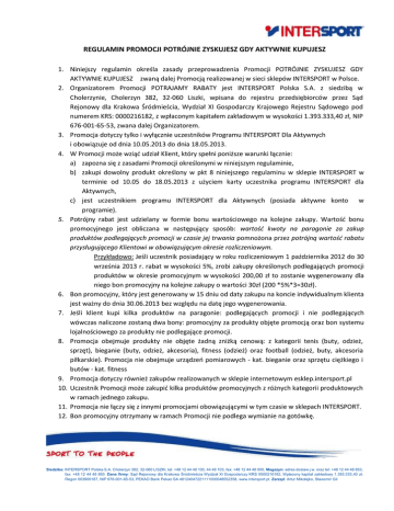 REGULAMIN PROMOCJI POTRÓJNIE ZYSKUJESZ GDY AKTYWNIE KUPUJESZ 1. Niniejszy regulamin określa zasady przeprowadzenia Promocji POTRÓJNIE ZYSKUJESZ GDY AKTYWNIE KUPUJESZ zwaną dalej Promocją realizowanej w sieci sklepów INTERSPORT w Polsce. 2. Organizatorem Promocji POTRAJAMY RABATY jest INTERSPORT Polska S.A. z siedzibą w Cholerzynie, Cholerzyn 382, 32-060 Liszki, wpisana do rejestru przedsiębiorców przez Sąd Rejonowy dla Krakowa Śródmieścia, Wydział XI Gospodarczy Krajowego Rejestru Sądowego pod numerem KRS: 0000216182, z wpłaconym kapitałem zakładowym w wysokości 1.393.333,40 zł, NIP 676-001-65-53, zwana dalej Organizatorem. 3. Promocja dotyczy tylko i wyłącznie uczestników Programu INTERSPORT Dla Aktywnych i obowiązuje od dnia 10.05.2013 do dnia 18.05.2013. 4. W Promocji może wziąd udział Klient, który spełni poniższe warunki łącznie: a) zapozna się z zasadami Promocji określonymi w niniejszym regulaminie, b) zakupi dowolny produkt określony w pkt 8 niniejszego regulaminu w sklepie INTERSPORT w terminie od 10.05 do 18.05.2013 z użyciem karty uczestnika programu INTERSPORT dla Aktywnych, c) jest uczestnikiem programu INTERSPORT dla Aktywnych (posiada aktywne konto w programie). 5. Potrójny rabat jest udzielany w formie bonu wartościowego na kolejne zakupy. Wartośd bonu promocyjnego jest obliczana w następujący sposób: wartośd kwoty na paragonie za zakup produktów podlegających promocji w czasie jej trwania pomnożona przez potrójną wartośd rabatu przysługującego Klientowi w obowiązującym okresie rozliczeniowym. Przykładowo: Jeśli uczestnik posiadający w roku rozliczeniowym 1 października 2012 do 30 września 2013 r. rabat w wysokości 5%, zrobi zakupy określonych podlegających promocji produktów w okresie promocyjnym w wysokości 200,00 zł to zostanie wygenerowany dla niego bon promocyjny na kolejne zakupy o wartości 30zł (200 *5%*3=30zł). 6. Bon promocyjny, który jest generowany w 15 dniu od daty zakupu na koncie indywidualnym klienta jest ważny do dnia 30.06.2013 bez względu na datę jego wygenerowania. 7. Jeśli klient kupi kilka produktów na paragonie: podlegających promocji i nie podlegających wówczas naliczone zostaną dwa bony: promocyjny za produkty objęte promocją oraz bon systemu lojalnościowego za produkty nie podlegające promocji. 8. Promocja obejmuje produkty nie objęte żadną zniżką cenową: z kategorii tenis (buty, odzież, sprzęt), bieganie (buty, odzież, akcesoria), fitness (odzież) oraz football (odzież, buty, akcesoria piłkarskie). Promocja nie obejmuje urządzeo pomiarowych - kat. bieganie oraz sprzętu ciężkiego i butów - kat. fitness 9. Promocja dotyczy również zakupów realizowanych w sklepie internetowym esklep.intersport.pl 10. Uczestnik Promocji może zakupid kilka produktów promocyjnych z różnych kategorii produktowych w ramach jednego zakupu. 11. Promocja nie łączy się z innymi promocjami obowiązującymi w tym czasie w sklepach INTERSPORT. 12. Bon promocyjny otrzymany w ramach Promocji nie podlega wymianie na gotówkę. Siedziba: INTERSPORT Polska S.A. Cholerzyn 382, 32-060 LISZKI, tel: +48 12 44 48 100, 44 48 103, fax: +48 12 44 48 000, Magazyn: adres dostaw j.w. oraz tel: +48 12 44 48 853, fax: +48 12 44 48 850. Dane firmy: Sąd Rejonowy dla Krakowa Śródmieścia Wydział XI Gospodarczy KRS 0000216182, Wpłacony kapitał zakładowy 1.393.333,40 zł; Regon 003900187, NIP 676-001-65-53, PEKAO Bank Pekao SA 48124047221111000048552358, www.intersport.pl. Zarząd: Artur Mikołajko, Sławomir Gil 13. Promocja nie dotyczy pierwszego paragonu, na podstawie którego Klient zarejestrował się do programu w czasie trwania promocji. Dopiero przy drugim zakupie Klient może skorzystad z promocji pod warunkiem, że dokona go w okresie trwania promocji tj. 10.05-18.05.2013 14. Po zakooczeniu Promocji naliczanie bonów lojalnościowych będzie odbywało się zgodnie z regulaminem programu INTERSPORT dla Aktywnych. 15. W przypadku zwrotu lub pozytywnie rozpatrzonej reklamacji towaru, który został zakupiony w ramach Promocji, Uczestnik Promocji otrzymuje równowartośd kwoty na paragonie. Bon promocyjny podlega zwrotowi. 16. W przypadku zwrotu towaru po zakooczeniu Promocji, Uczestnik Promocji może zakupid nowy towar, według cen i promocji obowiązujących w dniu ponownego zakupu. 17. Uczestnik Promocji jest uprawniony do wymiany towaru zakupionego w sklepie stacjonarnym podczas Promocji w terminie 14 dni od daty zakupu, również po zakooczeniu Promocji. Wymiana jest możliwa wyłącznie jeżeli produkt nie jest zniszczony ani w żaden sposób użytkowany i dotyczy wyłącznie zmiany koloru lub rozmiaru. 18. W przypadku zakupu realizowanego w sklepie internetowym esklep.intersport.pl Uczestnik Promocji może odstąpid od umowy kupna towaru zakupionego w sklepie bez podania przyczyny w ciągu 14 dni od daty zawarcia umowy, składając stosowne oświadczenie na piśmie w terminie 14 dni. Towar powinien byd zwrócony w stanie niezmienionym, chyba, że zmiana była konieczna w granicach zwykłego zarządu, zgodnie z art. 7. pkt 3 ustawy o ochronie niektórych praw konsumentów oraz o odpowiedzialności za szkodę wyrządzoną przez produkt niebezpieczny z dnia 2 marca 2000 roku. 19. Płatnośd za produkty zakupione w ramach Promocji może byd realizowana poprzez bony sytemu lojalnościowego. 20. Niniejszy Regulamin jest dostępny na witrynie INTERSPORT dla Aktywnych w trakcie trwania Promocji. 21. W przypadku gdy klient dokonuje zakupu w ramach promocji w e-sklepie prowadzonym przez Organizatora promocji pod adresem to do tej transakcji mają również zastosowanie zapisy regulaminu e-sklepu dostępne na stronie http://esklep.intersport.pl/pl/regulamin 22. Osoby powiązane z Organizatorem nie mogą brad udziału w Promocji. 23. Wszelkie zapytania związane z Promocją powinny byd kierowane na adres [email protected] Siedziba: INTERSPORT Polska S.A. Cholerzyn 382, 32-060 LISZKI, te